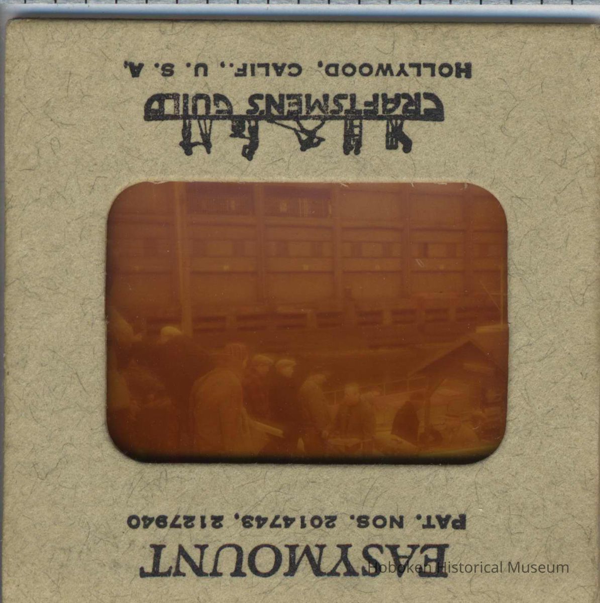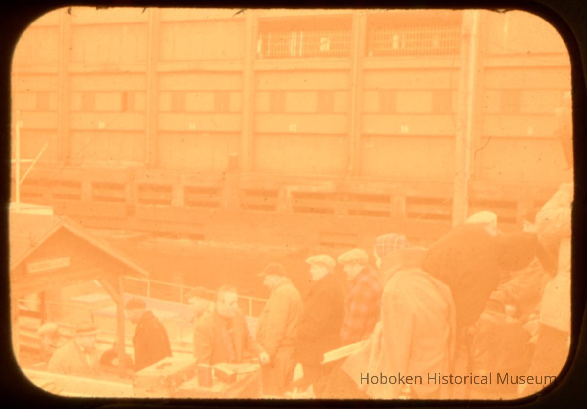 Color slide of actors and crew on pier set of the motion picture "On the Waterfront", Hoboken, no date, ca. late 1953-early 1954.