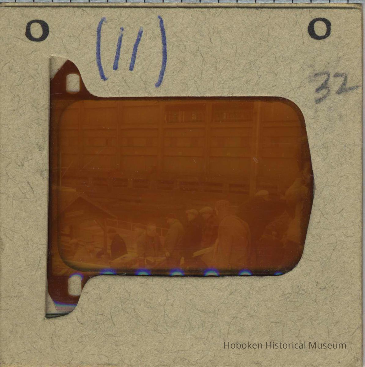 Color slide of actors and crew on pier set of the motion picture "On the Waterfront", Hoboken, no date, ca. late 1953-early 1954. 35mm transparency, horizontal image. Photographer and other provenance unknown. Mount has holographic ink number "(11)" and added notation.