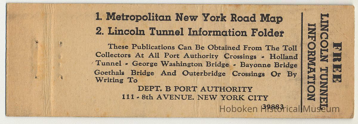 Matchbook cover: Lincoln Tunnel, 38th Street, Manhattan to Weehawken, N.J.; Open Wednesday, December 22, 1937. Issued summer - fall, 1937. Printed cardstock, 1-1/2" wide x 4-9/16" long. Issued by the Port of New York Authority (stated here only as the Port Authority.)