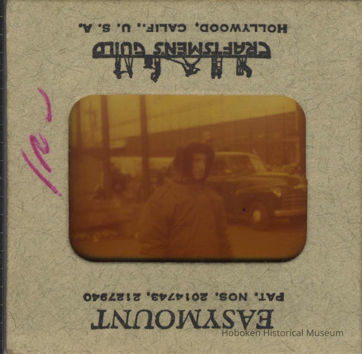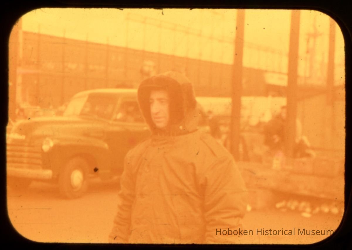 Color slide of unidentified man wearing a parka on pier set of the motion picture "On the Waterfront", Hoboken, no date, ca. late 1953-early 1954.
