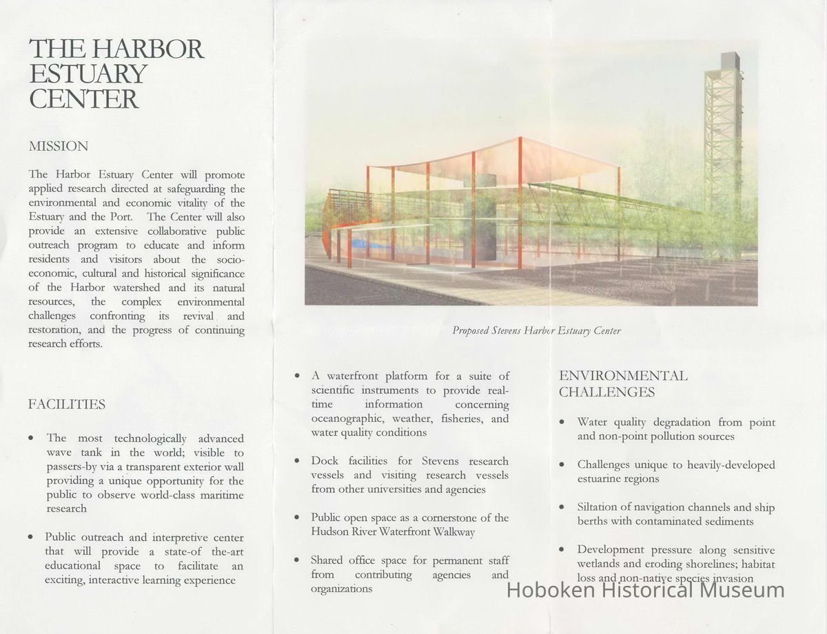 Brochure: Harbor Estuary Center. Stevens Institute of Technology, Davidson Laboratory, Hoboken, no date, (2002). Single 8-1/2" x 11" sheet folded to 8-1/2" x 3-5/8" wide. Printed in color, illustrated.