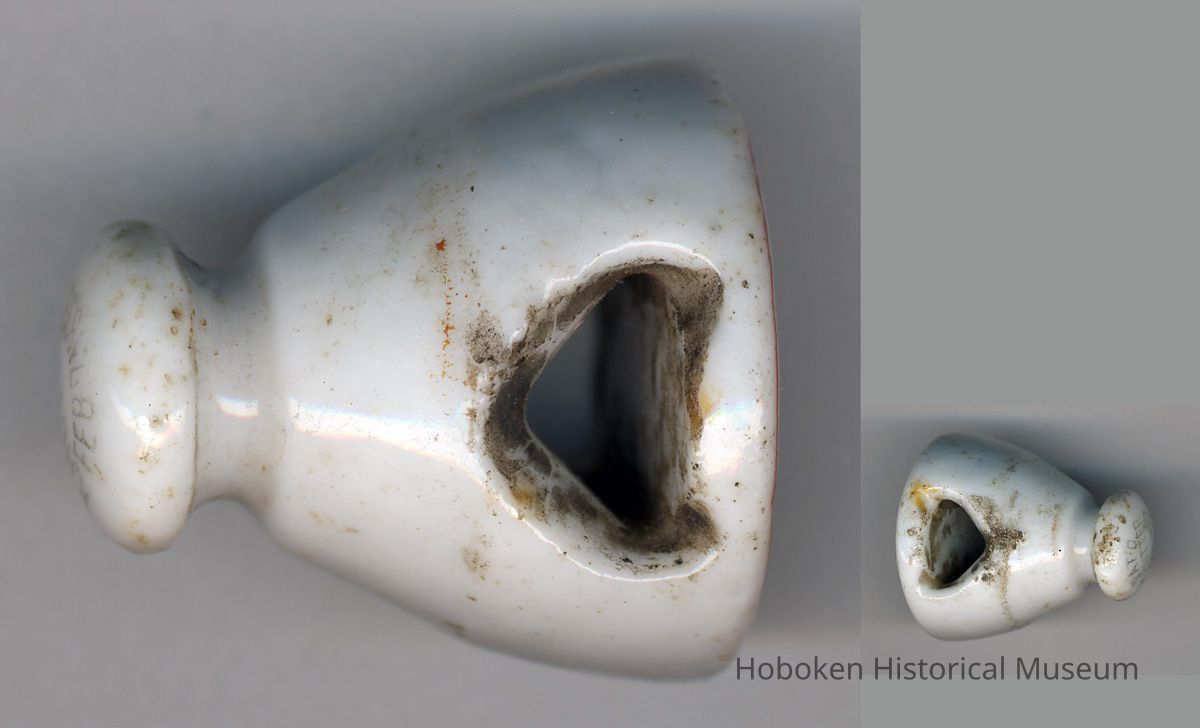Beer bottle stopper, ceramic: Charles Weinacht, Hoboken, N.J. No date, circa 1894-1910. White porcelain ceramic with embossed lettering and flag art; cone shaped, 1" diameter top tapering to 1/2" diameter x 1" high; triangular through hole for wire bail closure (not present); also not present is the rubber washer that was used with this style of stopper intended for a blob top bottle.
