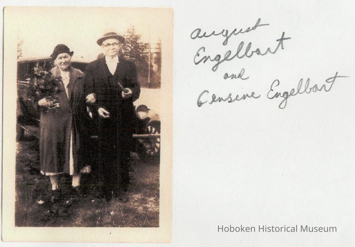 Color photocopy of photo of August & Gesina Engelbart standing in front of an automobile, no place, no date, ca. 1940.