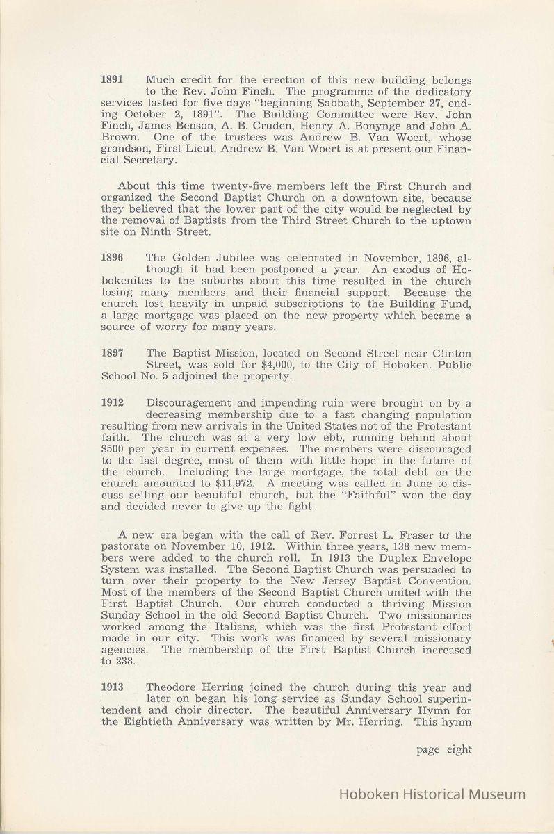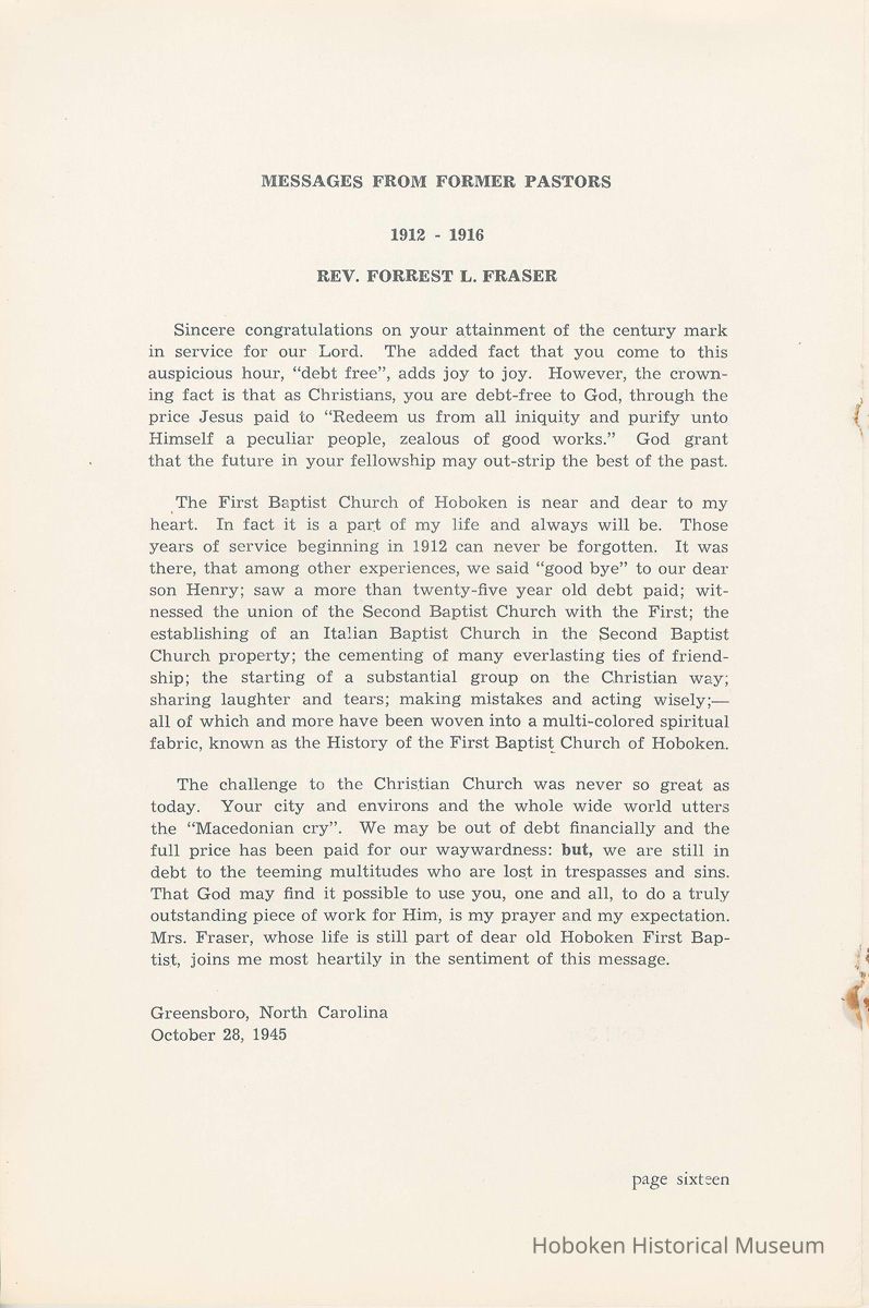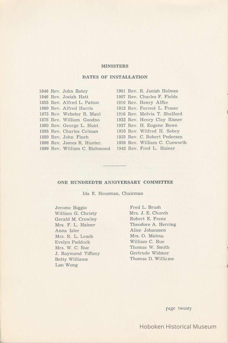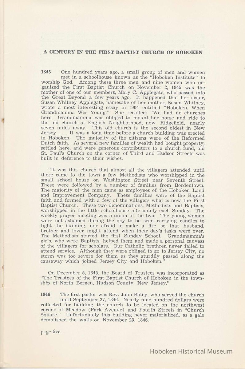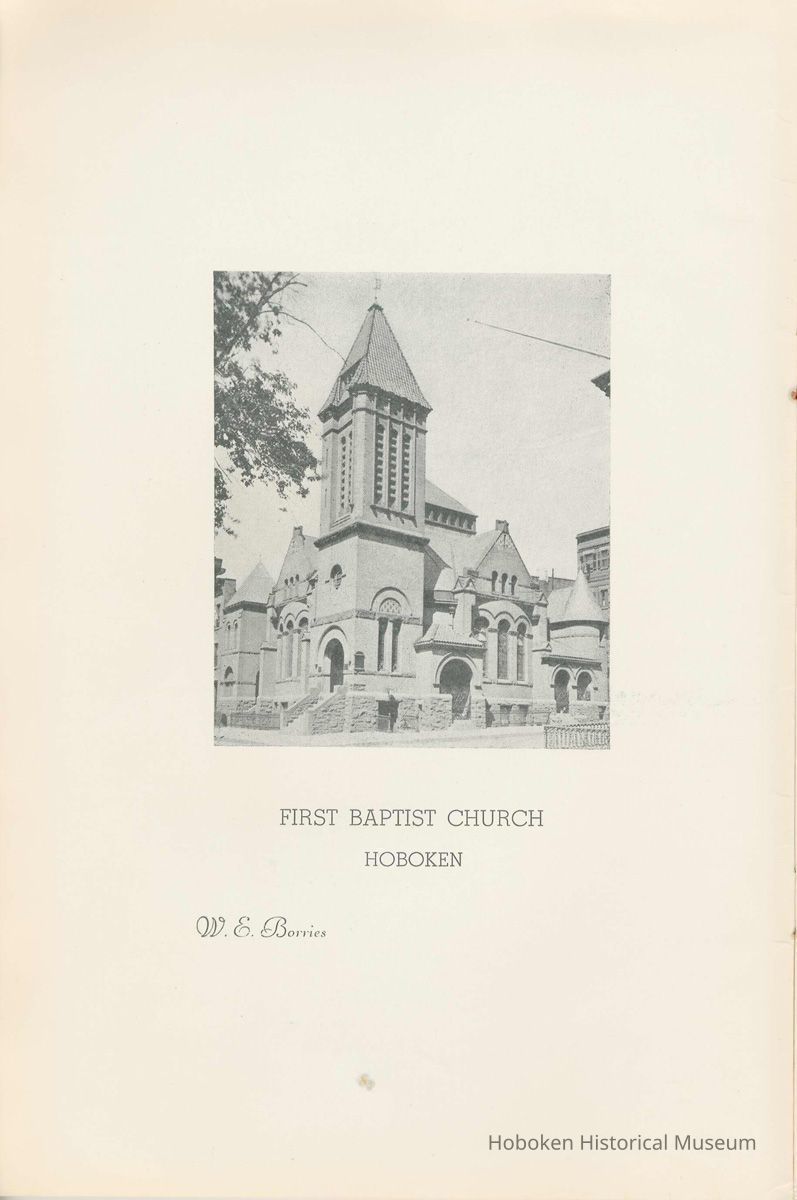 Notes: Archives 2002.028.0002 Centennial FIRST BAPTIST CHURCH HOBOKEN NEW JERSEY A CENTURY IN THE FIRST BAPTIST CHURCH Published at the time of the ONE HUNDREDTH ANNIVERSARY of the Founding of the Church DECEMBER 1945 [photo] FIRST BAPTIST CHURCH HOBOKEN W.E. Borries [photo] REV. FRED L. HAINER, D. D Minister GREETINGS A little over a year ago plans were made and committees appointed to arrange for the celebration of the One Hundredth Anniversary of the organization of our church. Included in the plans was the raising of an anniversary fund to pay off our mortgage. In the minds of some was the fond hope that money enough might be received to redecorate the walls throughout the building. As we come to this celebration with our mortgage paid in full and our church redecorated, the pastor wants to express his sincere thanks to all who have in any way contributed to make these accomplishments possible. Only through the loyal co-operation of one and all have we been able to come to this happy occasion. At such a time as this our minds go back across the years and our respects are paid to those who have toiled and sacrificed in order that we might enjoy this rich heritage. When we realize how God has watched over this church through these years, giving wisdom to her leaders and success to her labors, truly we are led to exclaim "What hath God wrought" and may we, to whom has descended this glorious Christian heritage, seek to make it more resplendent by our personal sacrifices and noble endeavor and transmit it to those who shall come after us, unsullied and greatly enriched through our consecrated living. A spirit of pride should enter the hearts of all for the service that it has been our privilege, as a church, to render in the name of God. It also carries a challenge for the future. Fred L. Hainer, Pastor. page four --- A CENTURY IN THE FIRST BAPTIST CHURCH OF HOBOKEN 1845 One hundred years ago, a small group of men and women met in a schoolhouse known as the "Hoboken Institute" to worship God. Among these three men and nine women who organized the First Baptist Church on November 2, 1845 was the mother of one of our members, Mary C. Applegate, who passed into the Great Beyond a few years ago. It happened that her sister, Susan Whitney Applegate, namesake of her mother, Susan Whitney, wrote a most interesting essay in 1904 entitled "Hoboken, When Grandmamma Was Young." She recalled: "We had no churches here. Grandmamma was obliged to mount her horse and ride to the old church at English Neighborhood, now Ridgefield, nearly seven miles away. This old church is the second oldest in New Jersey. ... It was a long time before a church building was erected in Hoboken. The majority of the citizens were of the Reformed Dutch faith. As several new families of wealth had bought property, settled here, and were generous contributors to a church fund, old St. Paul's Church on the corner of Third and Hudson Streets was built in deference to their wishes. "It was this church that almost all the villagers attended until there came to the town a few Methodists who worshipped in the small school house on Washington Street near Seventh Street. These were followed by a number of families from Bordentown. The majority of the men came as employees of the Hoboken Land and Improvement Company. These families were of the Baptist faith and formed with a few of the villagers what is now the First Baptist Church. These two denominations, Methodists and Baptists, worshipped in the little schoolhouse alternately each Sunday. The weekly prayer meeting was a union of the two. The young women were not ashamed during the day to be seen carrying candles to light the building, nor afraid to make a fire so that husband, brother and lover might attend when their day's tasks were over. The Methodists started the first Sunday School. Grandmamma's gir's, who were Baptists, helped them and made a personal canvass of the villagers for scholars. Our Catholic brethren never failed to attend service. Although they were obliged to go to Jersey City, no storm was too severe for them as they sturdily passed along the causeway which joined Jersey City and Hoboken." On December 5, 1845, the Board of Trustees was incorporated as "The Trustees of the First Baptist Church of Hoboken in the township of North Bergen, Hudson County, New Jersey." 1846 The first pastor was Rev. John Batey, who served the church until September 27, 1846. Nearly nine hundred dollars were collected for building the church to be located on the northwest corner of Meadow (Park Avenue) and Fourth Streets in "Church Square." Unfortunately this building never materialized, as a gale demolished the walls on November 23, 1846. page five ----- 1847 Through the efforts of the "friends of Christian Missions", two thousand dollars were collected towards the first meeting house. Deacon T. W. Thomas recommended the purchase of a lot on the southwest corner of Washington and Third Streets. The beautiful baptismal window in our present edifice recalls the long service of Deacon Thomas. This window was given by the King's Sons, King's Daughters and Deacon Thomas' Sunday School class. One year after Rev. Josiah Hatt began his ministry, the first church was dedicated on July 1, 1847. 1852 The year 1852 marked the Seventh Anniversary of the organization of our church. Glimpses of the ciiurch at that time are revealed in an "Historical Sketch" prepared by Rev. Hatt for the Seventh Anniversary. It is interesting to note that the first subscription for the support of the ministry amounted to one hundred and fifteen dollars. During the first four years the ministry was supported mostly by the New Jersey Baptist State Convention and the American Baptist Home Mission Society. Although two years later the members were burdened with a debt for a new edifice on the corner of Bloomfield and Third Streets, these pioneers contributed nearly five hundred dollars to the cause of missions, Bible and