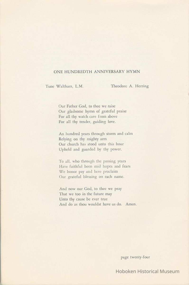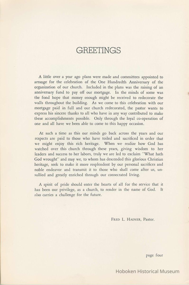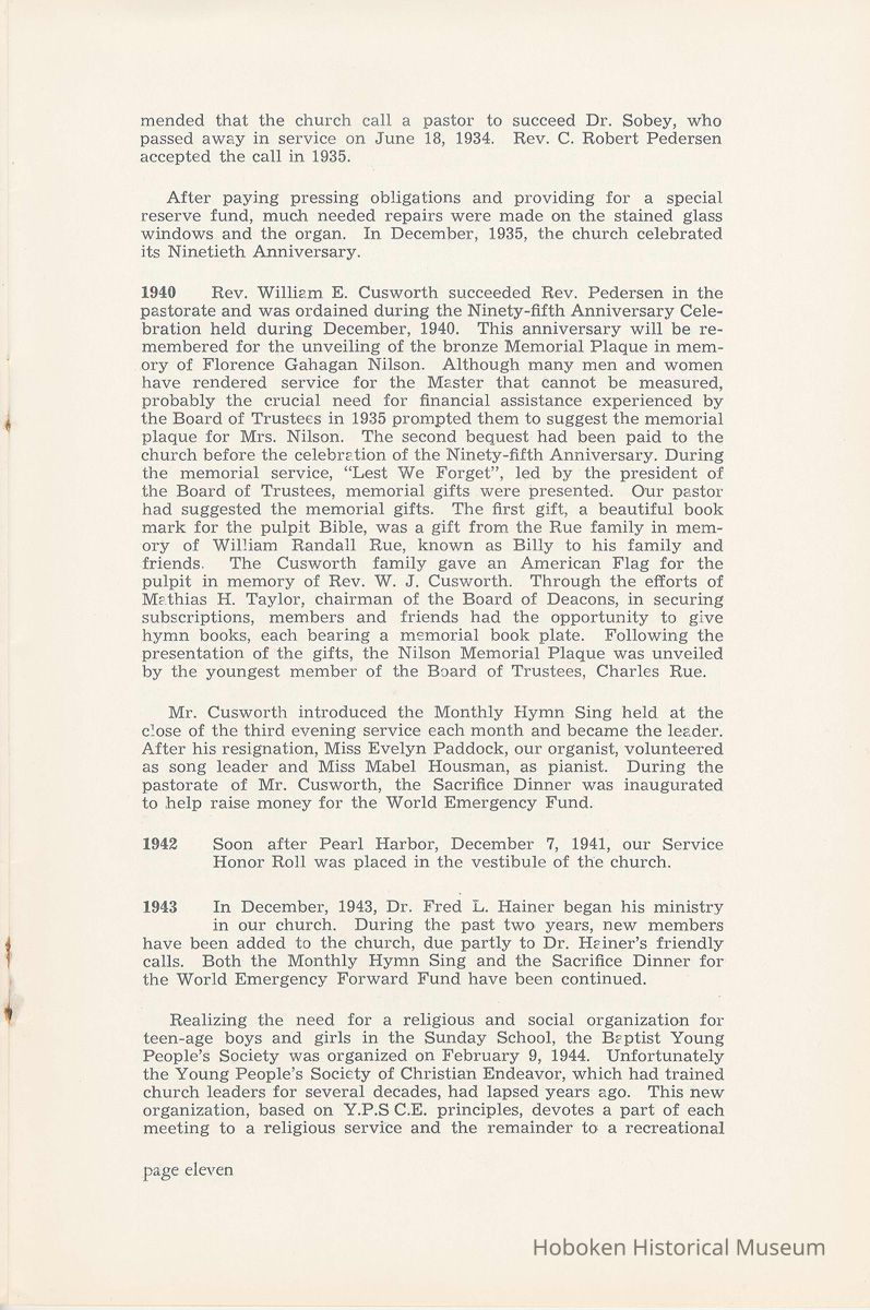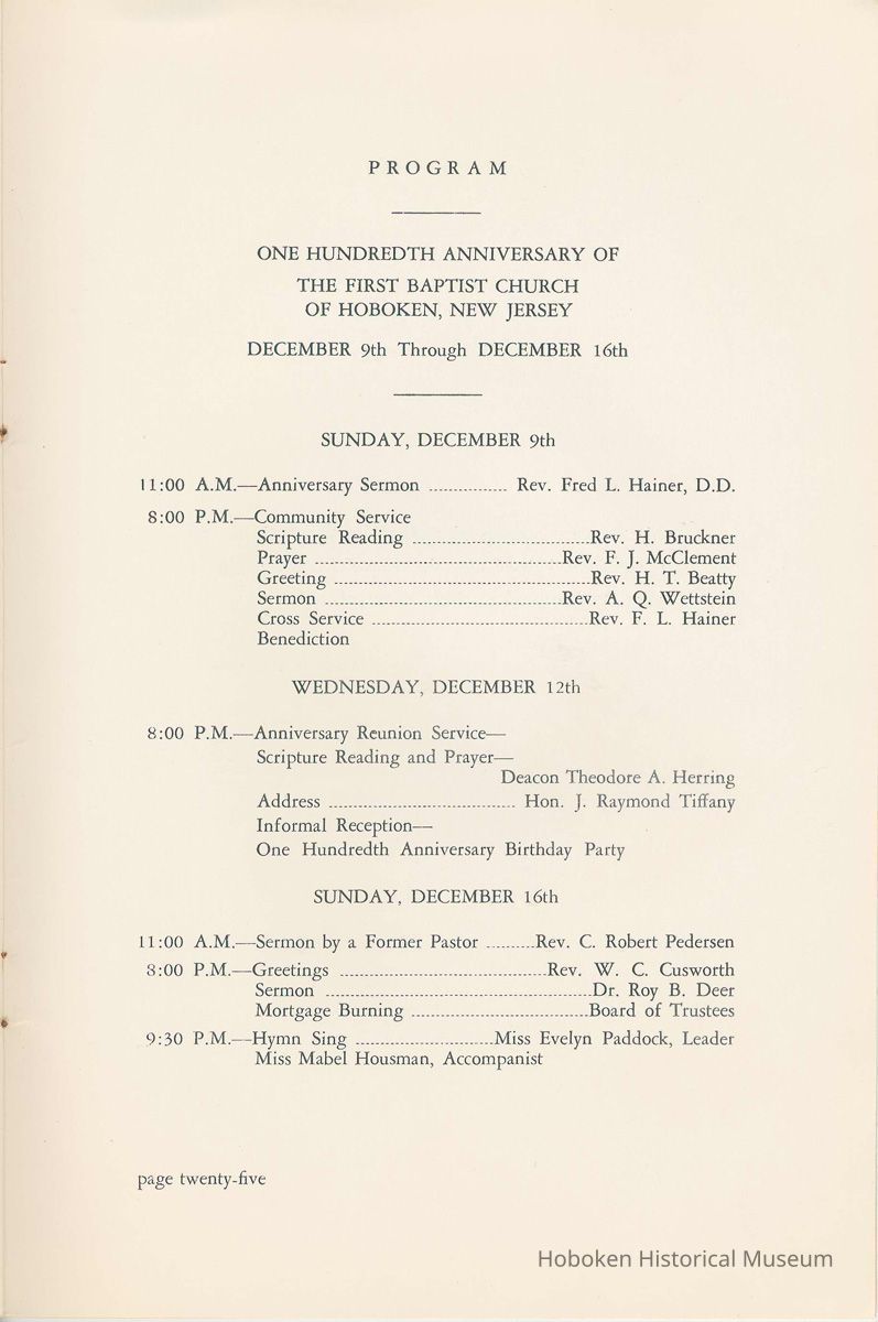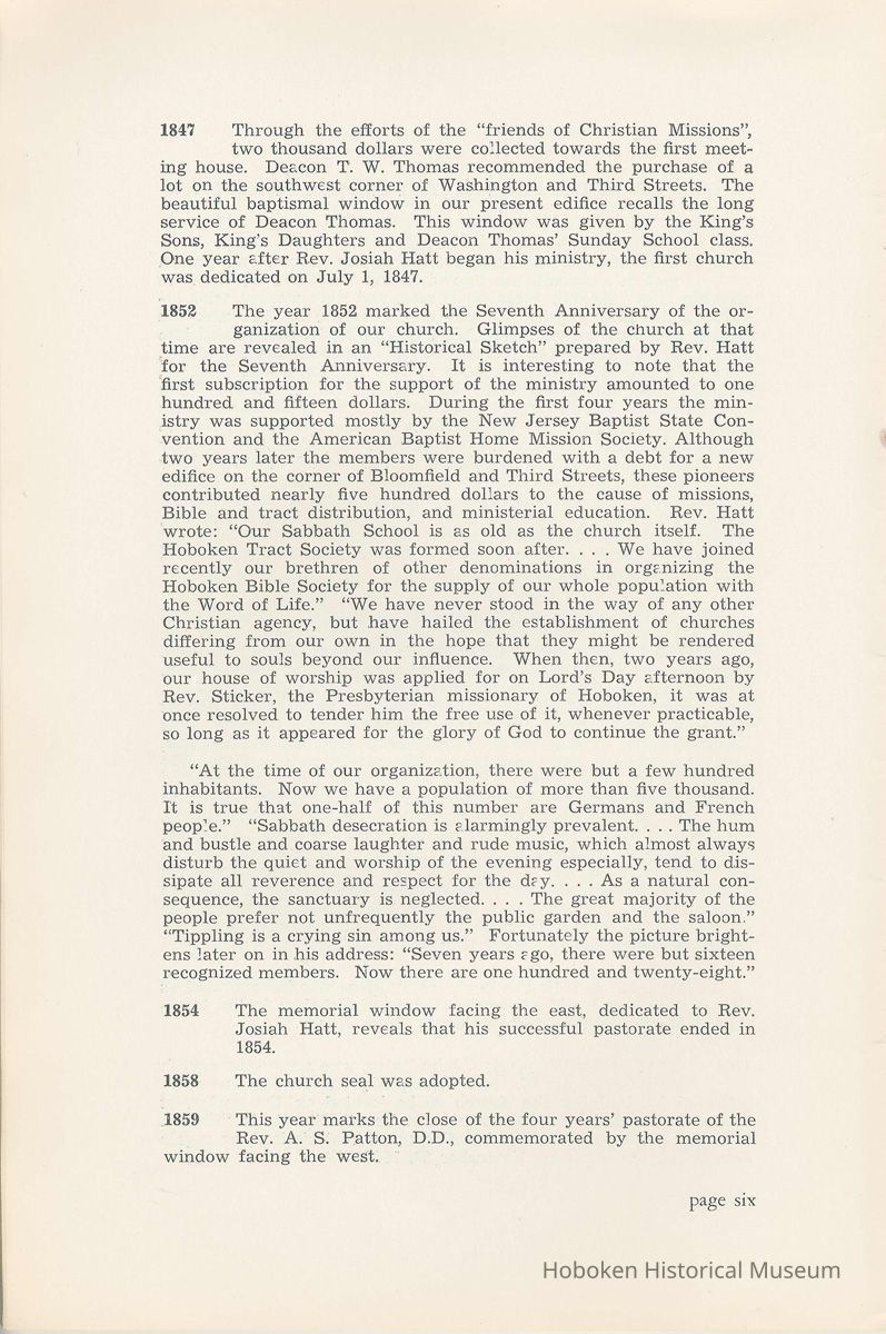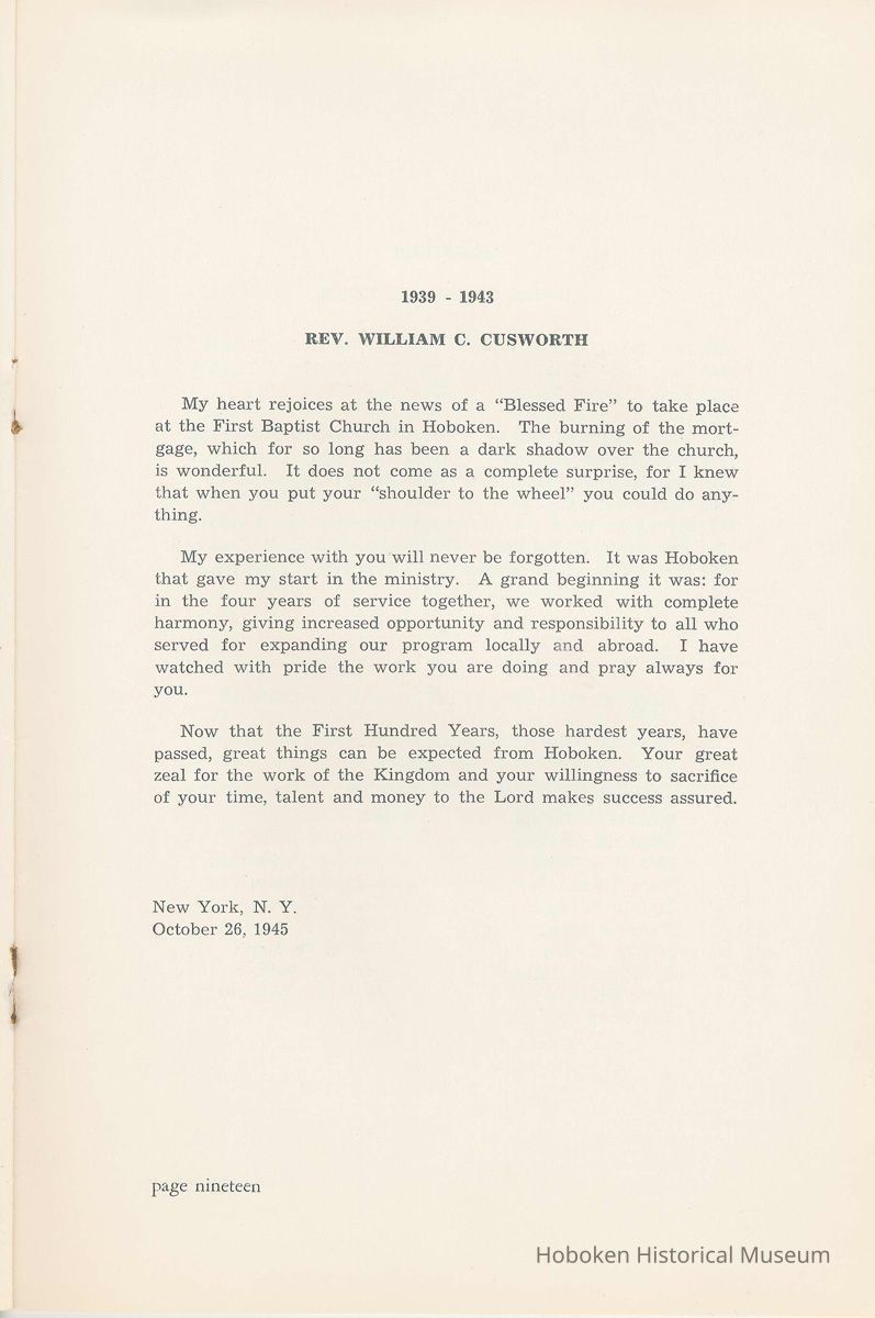 Notes: Archives 2002.028.0002 Centennial FIRST BAPTIST CHURCH HOBOKEN NEW JERSEY A CENTURY IN THE FIRST BAPTIST CHURCH Published at the time of the ONE HUNDREDTH ANNIVERSARY of the Founding of the Church DECEMBER 1945 [photo] FIRST BAPTIST CHURCH HOBOKEN W.E. Borries [photo] REV. FRED L. HAINER, D. D Minister GREETINGS A little over a year ago plans were made and committees appointed to arrange for the celebration of the One Hundredth Anniversary of the organization of our church. Included in the plans was the raising of an anniversary fund to pay off our mortgage. In the minds of some was the fond hope that money enough might be received to redecorate the walls throughout the building. As we come to this celebration with our mortgage paid in full and our church redecorated, the pastor wants to express his sincere thanks to all who have in any way contributed to make these accomplishments possible. Only through the loyal co-operation of one and all have we been able to come to this happy occasion. At such a time as this our minds go back across the years and our respects are paid to those who have toiled and sacrificed in order that we might enjoy this rich heritage. When we realize how God has watched over this church through these years, giving wisdom to her leaders and success to her labors, truly we are led to exclaim "What hath God wrought" and may we, to whom has descended this glorious Christian heritage, seek to make it more resplendent by our personal sacrifices and noble endeavor and transmit it to those who shall come after us, unsullied and greatly enriched through our consecrated living. A spirit of pride should enter the hearts of all for the service that it has been our privilege, as a church, to render in the name of God. It also carries a challenge for the future. Fred L. Hainer, Pastor. page four --- A CENTURY IN THE FIRST BAPTIST CHURCH OF HOBOKEN 1845 One hundred years ago, a small group of men and women met in a schoolhouse known as the "Hoboken Institute" to worship God. Among these three men and nine women who organized the First Baptist Church on November 2, 1845 was the mother of one of our members, Mary C. Applegate, who passed into the Great Beyond a few years ago. It happened that her sister, Susan Whitney Applegate, namesake of her mother, Susan Whitney, wrote a most interesting essay in 1904 entitled "Hoboken, When Grandmamma Was Young." She recalled: "We had no churches here. Grandmamma was obliged to mount her horse and ride to the old church at English Neighborhood, now Ridgefield, nearly seven miles away. This old church is the second oldest in New Jersey. ... It was a long time before a church building was erected in Hoboken. The majority of the citizens were of the Reformed Dutch faith. As several new families of wealth had bought property, settled here, and were generous contributors to a church fund, old St. Paul's Church on the corner of Third and Hudson Streets was built in deference to their wishes. "It was this church that almost all the villagers attended until there came to the town a few Methodists who worshipped in the small school house on Washington Street near Seventh Street. These were followed by a number of families from Bordentown. The majority of the men came as employees of the Hoboken Land and Improvement Company. These families were of the Baptist faith and formed with a few of the villagers what is now the First Baptist Church. These two denominations, Methodists and Baptists, worshipped in the little schoolhouse alternately each Sunday. The weekly prayer meeting was a union of the two. The young women were not ashamed during the day to be seen carrying candles to light the building, nor afraid to make a fire so that husband, brother and lover might attend when their day's tasks were over. The Methodists started the first Sunday School. Grandmamma's gir's, who were Baptists, helped them and made a personal canvass of the villagers for scholars. Our Catholic brethren never failed to attend service. Although they were obliged to go to Jersey City, no storm was too severe for them as they sturdily passed along the causeway which joined Jersey City and Hoboken." On December 5, 1845, the Board of Trustees was incorporated as "The Trustees of the First Baptist Church of Hoboken in the township of North Bergen, Hudson County, New Jersey." 1846 The first pastor was Rev. John Batey, who served the church until September 27, 1846. Nearly nine hundred dollars were collected for building the church to be located on the northwest corner of Meadow (Park Avenue) and Fourth Streets in "Church Square." Unfortunately this building never materialized, as a gale demolished the walls on November 23, 1846. page five ----- 1847 Through the efforts of the "friends of Christian Missions", two thousand dollars were collected towards the first meeting house. Deacon T. W. Thomas recommended the purchase of a lot on the southwest corner of Washington and Third Streets. The beautiful baptismal window in our present edifice recalls the long service of Deacon Thomas. This window was given by the King's Sons, King's Daughters and Deacon Thomas' Sunday School class. One year after Rev. Josiah Hatt began his ministry, the first church was dedicated on July 1, 1847. 1852 The year 1852 marked the Seventh Anniversary of the organization of our church. Glimpses of the ciiurch at that time are revealed in an "Historical Sketch" prepared by Rev. Hatt for the Seventh Anniversary. It is interesting to note that the first subscription for the support of the ministry amounted to one hundred and fifteen dollars. During the first four years the ministry was supported mostly by the New Jersey Baptist State Convention and the American Baptist Home Mission Society. Although two years later the members were burdened with a debt for a new edifice on the corner of Bloomfield and Third Streets, these pioneers contributed nearly five hundred dollars to the cause of missions, Bible and