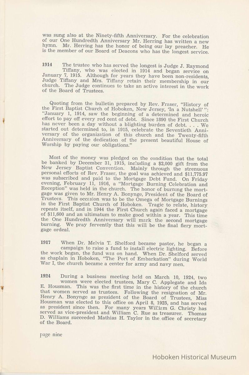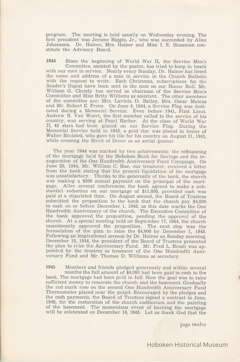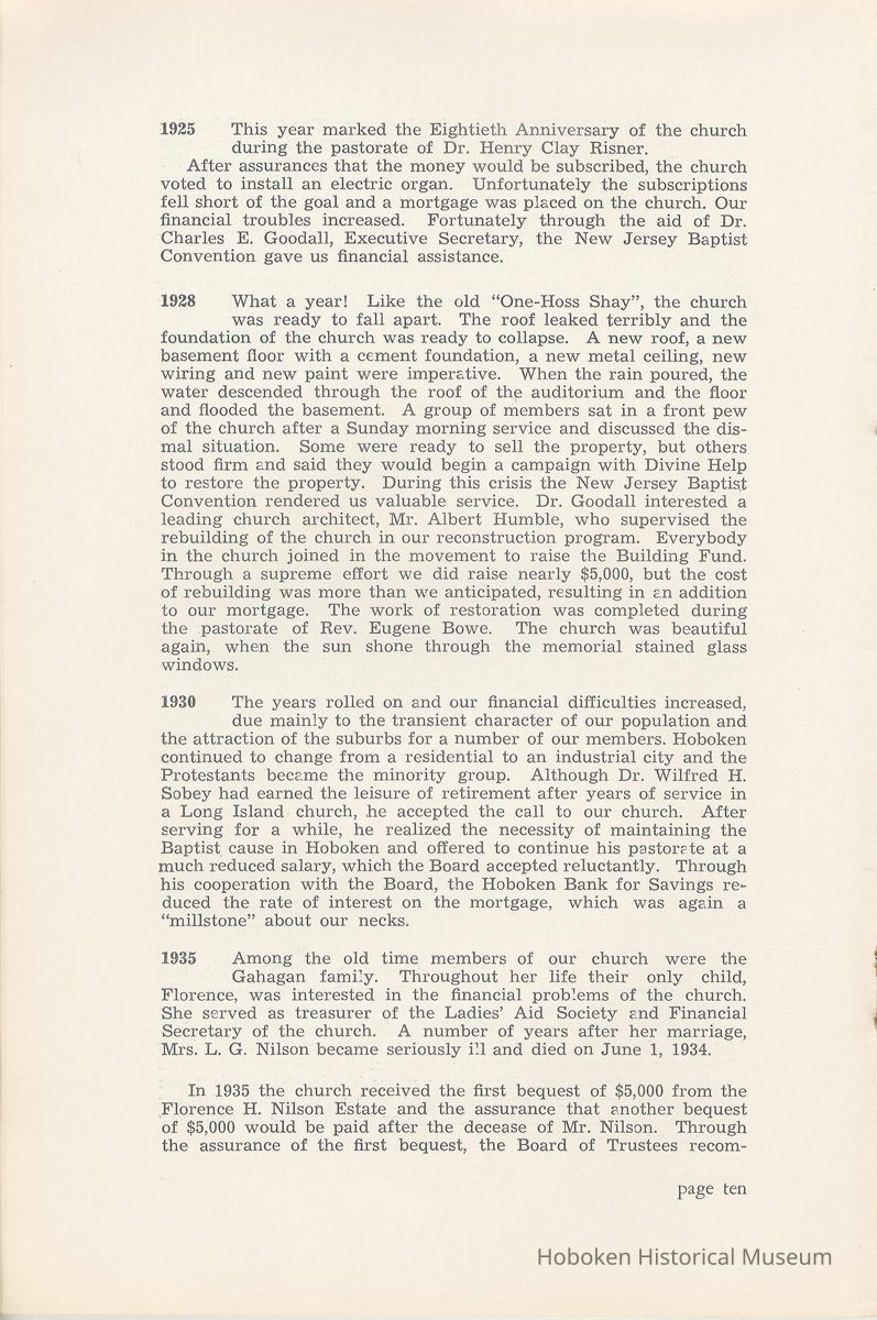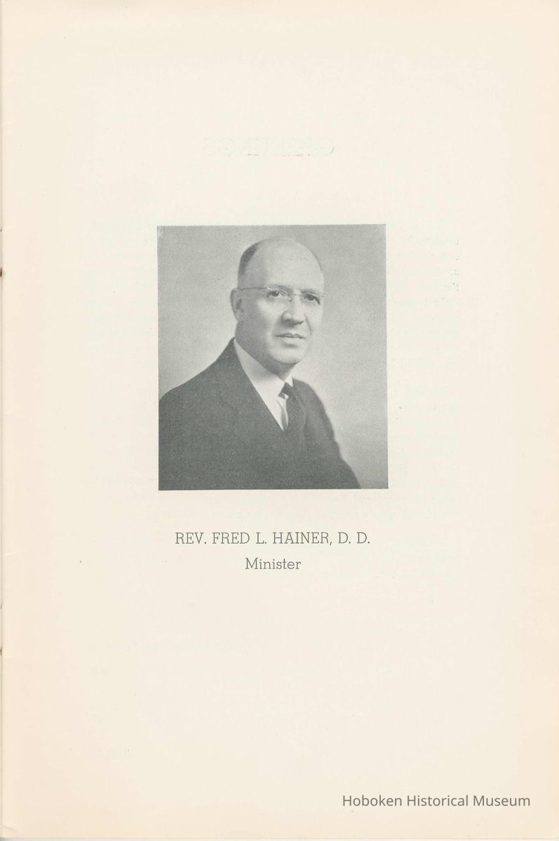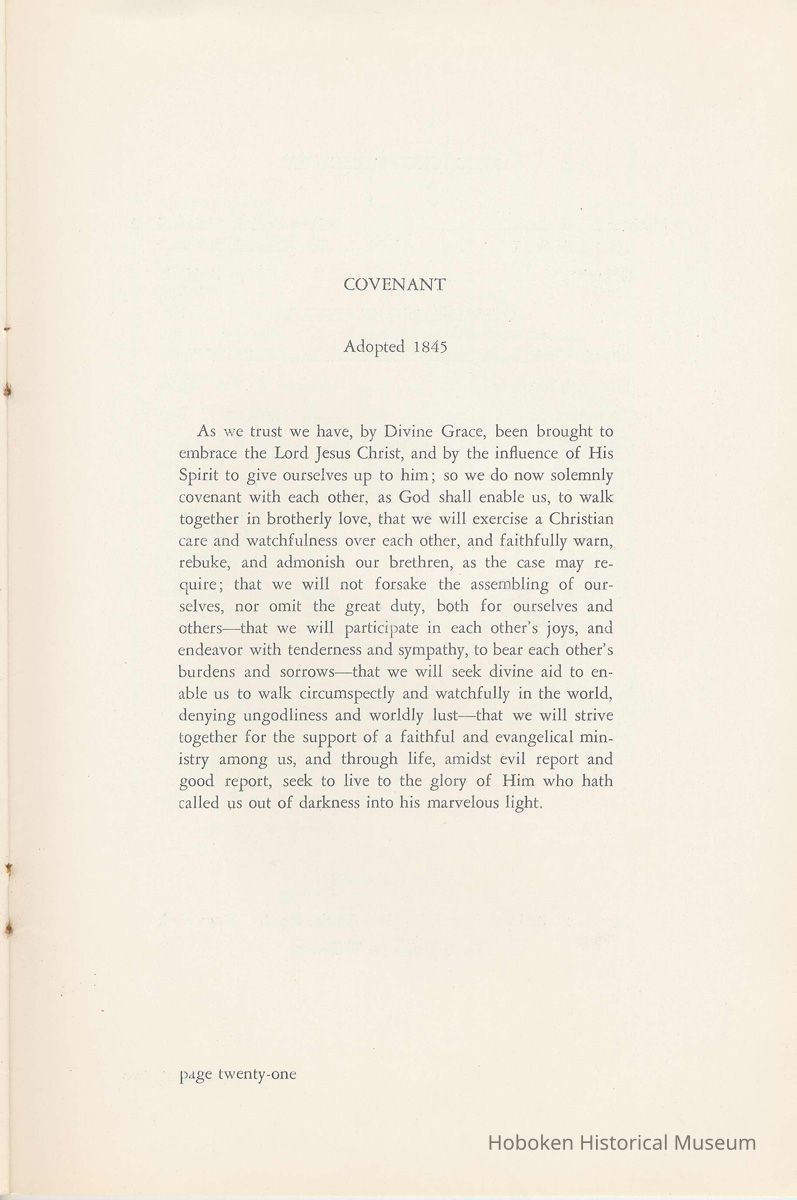 Notes: Archives 2002.028.0002 Centennial FIRST BAPTIST CHURCH HOBOKEN NEW JERSEY A CENTURY IN THE FIRST BAPTIST CHURCH Published at the time of the ONE HUNDREDTH ANNIVERSARY of the Founding of the Church DECEMBER 1945 [photo] FIRST BAPTIST CHURCH HOBOKEN W.E. Borries [photo] REV. FRED L. HAINER, D. D Minister GREETINGS A little over a year ago plans were made and committees appointed to arrange for the celebration of the One Hundredth Anniversary of the organization of our church. Included in the plans was the raising of an anniversary fund to pay off our mortgage. In the minds of some was the fond hope that money enough might be received to redecorate the walls throughout the building. As we come to this celebration with our mortgage paid in full and our church redecorated, the pastor wants to express his sincere thanks to all who have in any way contributed to make these accomplishments possible. Only through the loyal co-operation of one and all have we been able to come to this happy occasion. At such a time as this our minds go back across the years and our respects are paid to those who have toiled and sacrificed in order that we might enjoy this rich heritage. When we realize how God has watched over this church through these years, giving wisdom to her leaders and success to her labors, truly we are led to exclaim "What hath God wrought" and may we, to whom has descended this glorious Christian heritage, seek to make it more resplendent by our personal sacrifices and noble endeavor and transmit it to those who shall come after us, unsullied and greatly enriched through our consecrated living. A spirit of pride should enter the hearts of all for the service that it has been our privilege, as a church, to render in the name of God. It also carries a challenge for the future. Fred L. Hainer, Pastor. page four --- A CENTURY IN THE FIRST BAPTIST CHURCH OF HOBOKEN 1845 One hundred years ago, a small group of men and women met in a schoolhouse known as the "Hoboken Institute" to worship God. Among these three men and nine women who organized the First Baptist Church on November 2, 1845 was the mother of one of our members, Mary C. Applegate, who passed into the Great Beyond a few years ago. It happened that her sister, Susan Whitney Applegate, namesake of her mother, Susan Whitney, wrote a most interesting essay in 1904 entitled "Hoboken, When Grandmamma Was Young." She recalled: "We had no churches here. Grandmamma was obliged to mount her horse and ride to the old church at English Neighborhood, now Ridgefield, nearly seven miles away. This old church is the second oldest in New Jersey. ... It was a long time before a church building was erected in Hoboken. The majority of the citizens were of the Reformed Dutch faith. As several new families of wealth had bought property, settled here, and were generous contributors to a church fund, old St. Paul's Church on the corner of Third and Hudson Streets was built in deference to their wishes. "It was this church that almost all the villagers attended until there came to the town a few Methodists who worshipped in the small school house on Washington Street near Seventh Street. These were followed by a number of families from Bordentown. The majority of the men came as employees of the Hoboken Land and Improvement Company. These families were of the Baptist faith and formed with a few of the villagers what is now the First Baptist Church. These two denominations, Methodists and Baptists, worshipped in the little schoolhouse alternately each Sunday. The weekly prayer meeting was a union of the two. The young women were not ashamed during the day to be seen carrying candles to light the building, nor afraid to make a fire so that husband, brother and lover might attend when their day's tasks were over. The Methodists started the first Sunday School. Grandmamma's gir's, who were Baptists, helped them and made a personal canvass of the villagers for scholars. Our Catholic brethren never failed to attend service. Although they were obliged to go to Jersey City, no storm was too severe for them as they sturdily passed along the causeway which joined Jersey City and Hoboken." On December 5, 1845, the Board of Trustees was incorporated as "The Trustees of the First Baptist Church of Hoboken in the township of North Bergen, Hudson County, New Jersey." 1846 The first pastor was Rev. John Batey, who served the church until September 27, 1846. Nearly nine hundred dollars were collected for building the church to be located on the northwest corner of Meadow (Park Avenue) and Fourth Streets in "Church Square." Unfortunately this building never materialized, as a gale demolished the walls on November 23, 1846. page five ----- 1847 Through the efforts of the "friends of Christian Missions", two thousand dollars were collected towards the first meeting house. Deacon T. W. Thomas recommended the purchase of a lot on the southwest corner of Washington and Third Streets. The beautiful baptismal window in our present edifice recalls the long service of Deacon Thomas. This window was given by the King's Sons, King's Daughters and Deacon Thomas' Sunday School class. One year after Rev. Josiah Hatt began his ministry, the first church was dedicated on July 1, 1847. 1852 The year 1852 marked the Seventh Anniversary of the organization of our church. Glimpses of the ciiurch at that time are revealed in an "Historical Sketch" prepared by Rev. Hatt for the Seventh Anniversary. It is interesting to note that the first subscription for the support of the ministry amounted to one hundred and fifteen dollars. During the first four years the ministry was supported mostly by the New Jersey Baptist State Convention and the American Baptist Home Mission Society. Although two years later the members were burdened with a debt for a new edifice on the corner of Bloomfield and Third Streets, these pioneers contributed nearly five hundred dollars to the cause of missions, Bible and