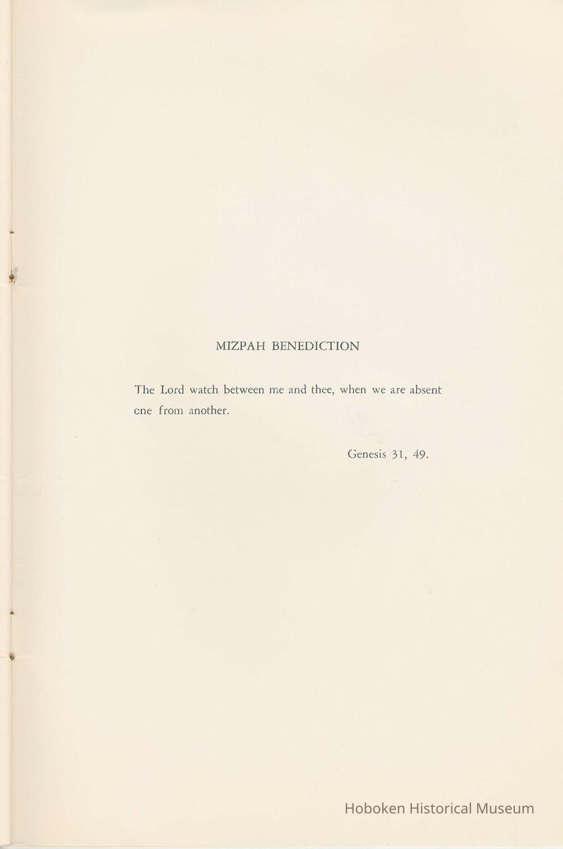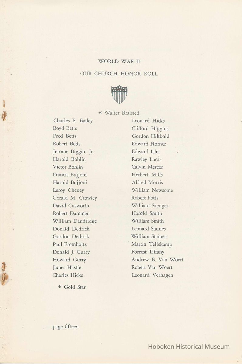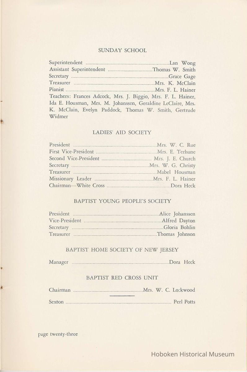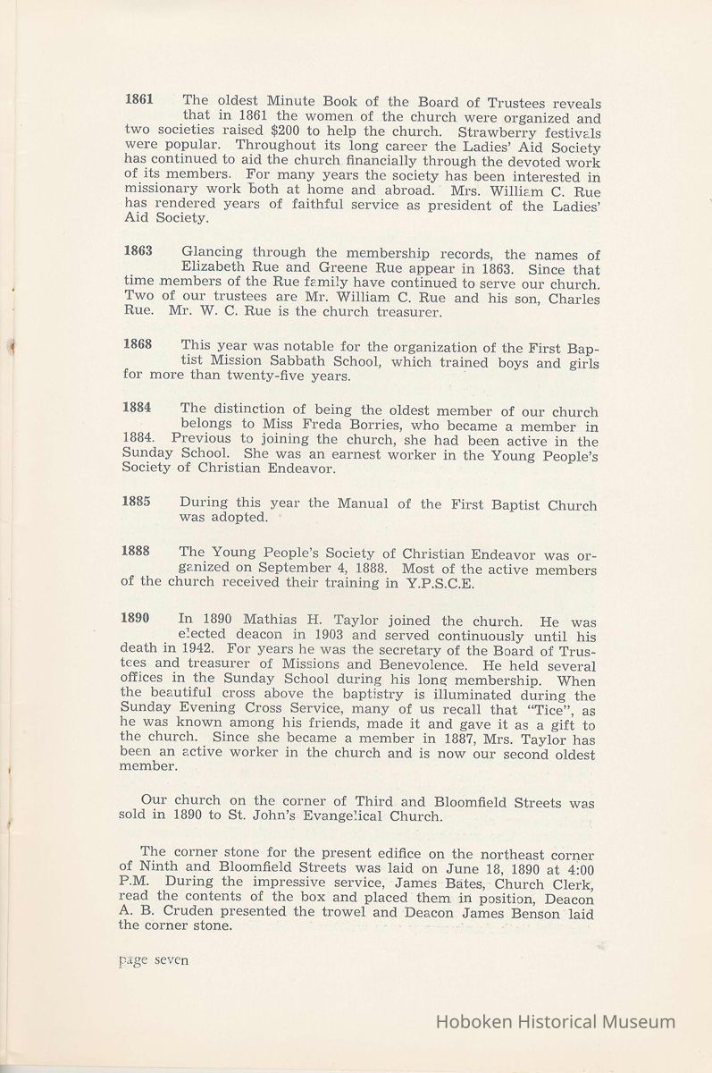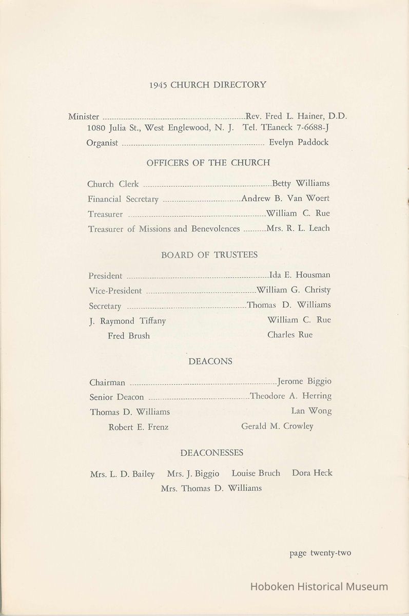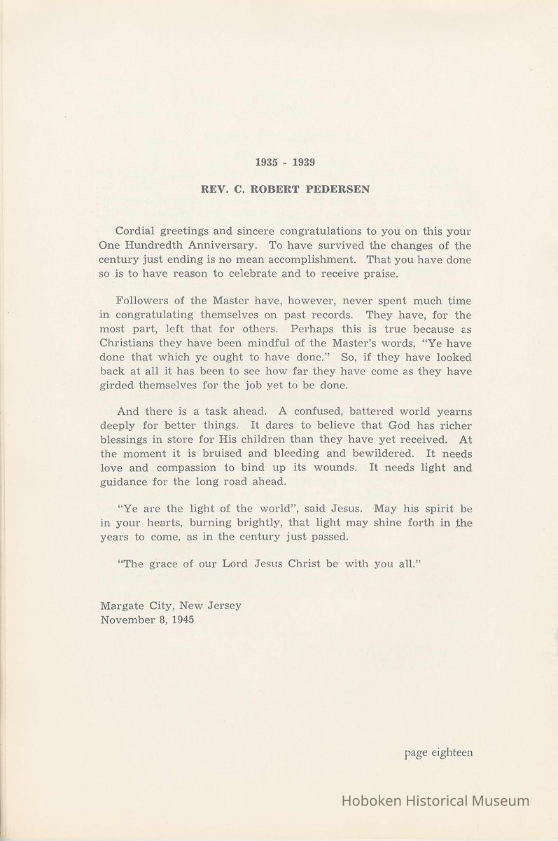 Notes: Archives 2002.028.0002 Centennial FIRST BAPTIST CHURCH HOBOKEN NEW JERSEY A CENTURY IN THE FIRST BAPTIST CHURCH Published at the time of the ONE HUNDREDTH ANNIVERSARY of the Founding of the Church DECEMBER 1945 [photo] FIRST BAPTIST CHURCH HOBOKEN W.E. Borries [photo] REV. FRED L. HAINER, D. D Minister GREETINGS A little over a year ago plans were made and committees appointed to arrange for the celebration of the One Hundredth Anniversary of the organization of our church. Included in the plans was the raising of an anniversary fund to pay off our mortgage. In the minds of some was the fond hope that money enough might be received to redecorate the walls throughout the building. As we come to this celebration with our mortgage paid in full and our church redecorated, the pastor wants to express his sincere thanks to all who have in any way contributed to make these accomplishments possible. Only through the loyal co-operation of one and all have we been able to come to this happy occasion. At such a time as this our minds go back across the years and our respects are paid to those who have toiled and sacrificed in order that we might enjoy this rich heritage. When we realize how God has watched over this church through these years, giving wisdom to her leaders and success to her labors, truly we are led to exclaim "What hath God wrought" and may we, to whom has descended this glorious Christian heritage, seek to make it more resplendent by our personal sacrifices and noble endeavor and transmit it to those who shall come after us, unsullied and greatly enriched through our consecrated living. A spirit of pride should enter the hearts of all for the service that it has been our privilege, as a church, to render in the name of God. It also carries a challenge for the future. Fred L. Hainer, Pastor. page four --- A CENTURY IN THE FIRST BAPTIST CHURCH OF HOBOKEN 1845 One hundred years ago, a small group of men and women met in a schoolhouse known as the "Hoboken Institute" to worship God. Among these three men and nine women who organized the First Baptist Church on November 2, 1845 was the mother of one of our members, Mary C. Applegate, who passed into the Great Beyond a few years ago. It happened that her sister, Susan Whitney Applegate, namesake of her mother, Susan Whitney, wrote a most interesting essay in 1904 entitled "Hoboken, When Grandmamma Was Young." She recalled: "We had no churches here. Grandmamma was obliged to mount her horse and ride to the old church at English Neighborhood, now Ridgefield, nearly seven miles away. This old church is the second oldest in New Jersey. ... It was a long time before a church building was erected in Hoboken. The majority of the citizens were of the Reformed Dutch faith. As several new families of wealth had bought property, settled here, and were generous contributors to a church fund, old St. Paul's Church on the corner of Third and Hudson Streets was built in deference to their wishes. "It was this church that almost all the villagers attended until there came to the town a few Methodists who worshipped in the small school house on Washington Street near Seventh Street. These were followed by a number of families from Bordentown. The majority of the men came as employees of the Hoboken Land and Improvement Company. These families were of the Baptist faith and formed with a few of the villagers what is now the First Baptist Church. These two denominations, Methodists and Baptists, worshipped in the little schoolhouse alternately each Sunday. The weekly prayer meeting was a union of the two. The young women were not ashamed during the day to be seen carrying candles to light the building, nor afraid to make a fire so that husband, brother and lover might attend when their day's tasks were over. The Methodists started the first Sunday School. Grandmamma's gir's, who were Baptists, helped them and made a personal canvass of the villagers for scholars. Our Catholic brethren never failed to attend service. Although they were obliged to go to Jersey City, no storm was too severe for them as they sturdily passed along the causeway which joined Jersey City and Hoboken." On December 5, 1845, the Board of Trustees was incorporated as "The Trustees of the First Baptist Church of Hoboken in the township of North Bergen, Hudson County, New Jersey." 1846 The first pastor was Rev. John Batey, who served the church until September 27, 1846. Nearly nine hundred dollars were collected for building the church to be located on the northwest corner of Meadow (Park Avenue) and Fourth Streets in "Church Square." Unfortunately this building never materialized, as a gale demolished the walls on November 23, 1846. page five ----- 1847 Through the efforts of the "friends of Christian Missions", two thousand dollars were collected towards the first meeting house. Deacon T. W. Thomas recommended the purchase of a lot on the southwest corner of Washington and Third Streets. The beautiful baptismal window in our present edifice recalls the long service of Deacon Thomas. This window was given by the King's Sons, King's Daughters and Deacon Thomas' Sunday School class. One year after Rev. Josiah Hatt began his ministry, the first church was dedicated on July 1, 1847. 1852 The year 1852 marked the Seventh Anniversary of the organization of our church. Glimpses of the ciiurch at that time are revealed in an "Historical Sketch" prepared by Rev. Hatt for the Seventh Anniversary. It is interesting to note that the first subscription for the support of the ministry amounted to one hundred and fifteen dollars. During the first four years the ministry was supported mostly by the New Jersey Baptist State Convention and the American Baptist Home Mission Society. Although two years later the members were burdened with a debt for a new edifice on the corner of Bloomfield and Third Streets, these pioneers contributed nearly five hundred dollars to the cause of missions, Bible and
