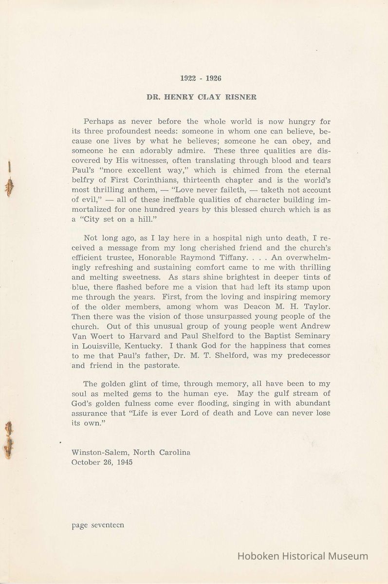 Booklet: A Century in the First Baptist Church of Hoboken, New Jersey, December 1945.