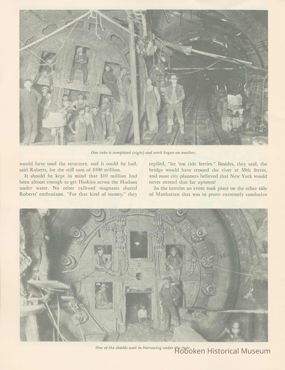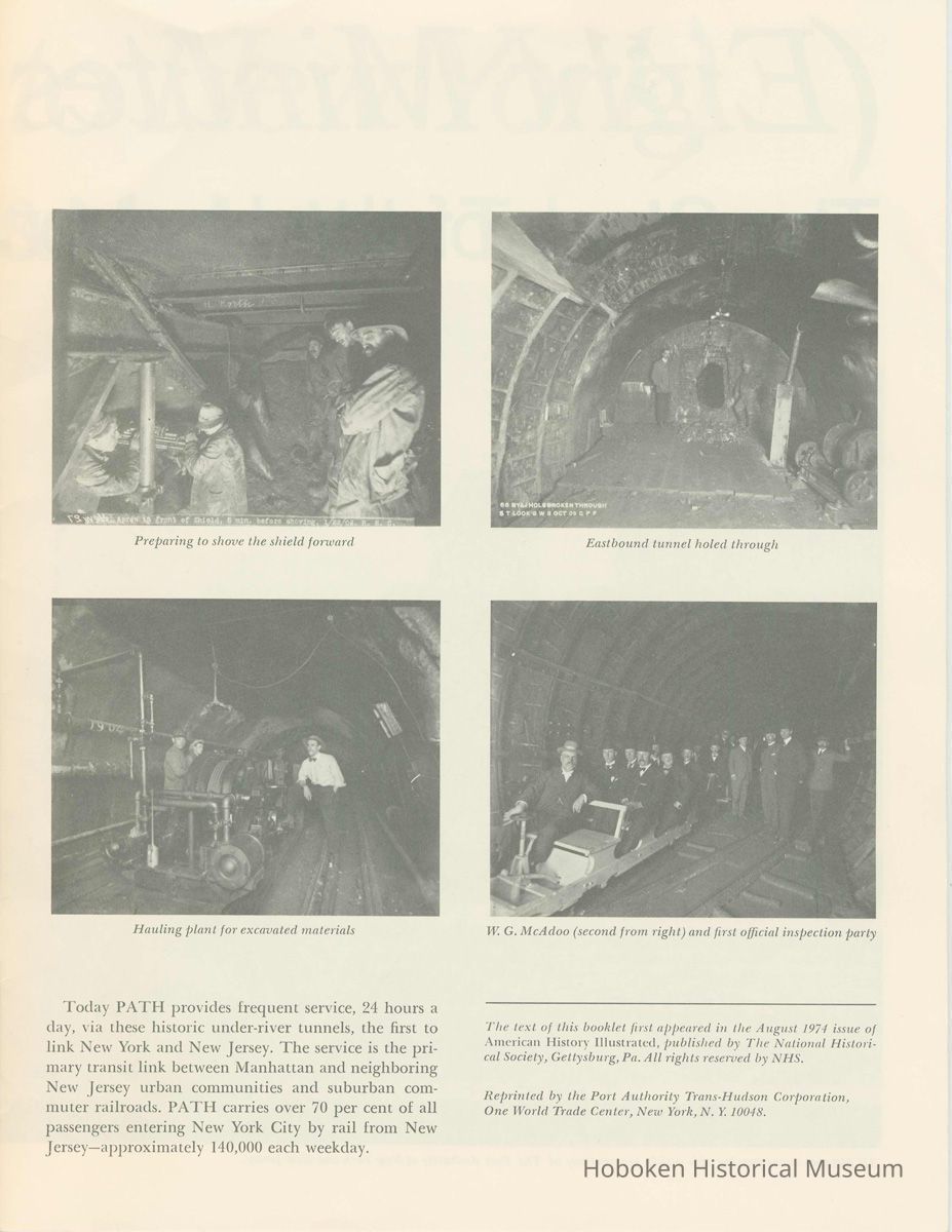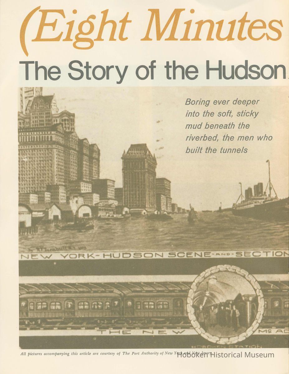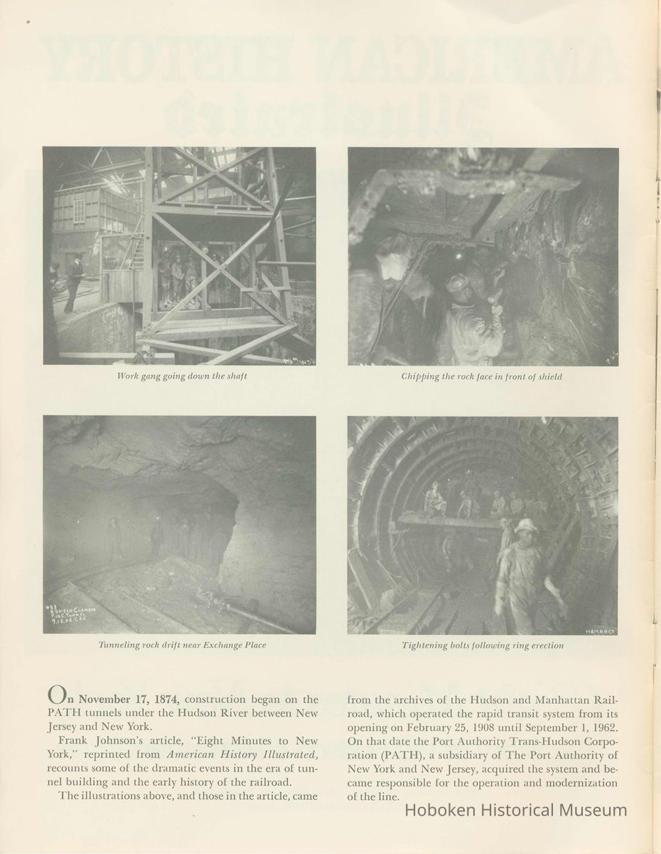 Eight Minutes to New York. The Story of the Hudson & Manhattan Tubes. Digital images of reprint from American History Illustrated, issued in August, 1974 by the Port Authority Trans-Hudson Corporation. Original was a ca. 8" x 11" 16-page pamphlet with photos and map. Museum does not own the original. Images courtesy of Terry Kennedy. Images are archived.