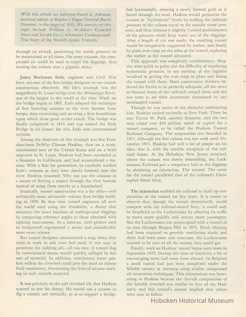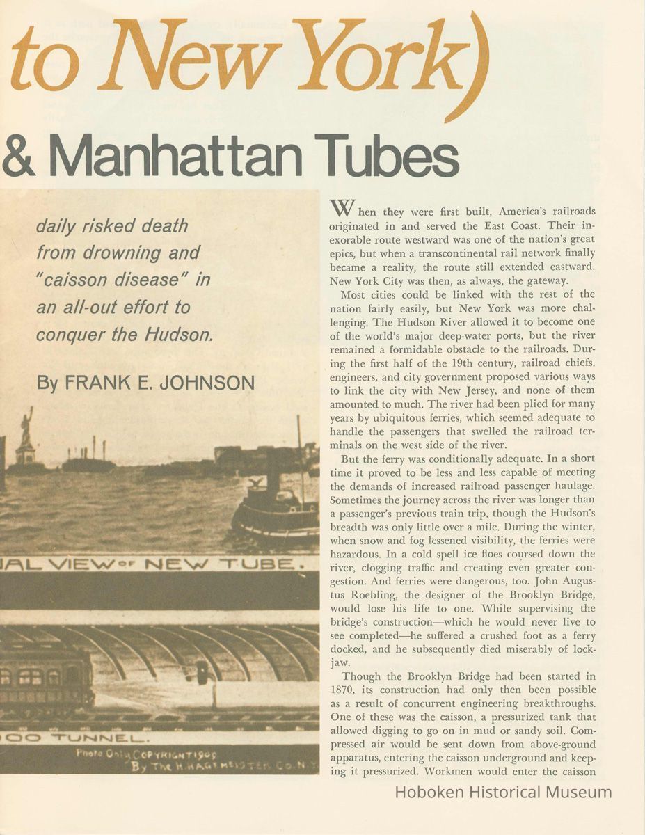 Article: Eight Minutes to New York. The Story of the Hudson & Manhattan Tubes. Reprint from American History Illustrated, Aug. 1974.