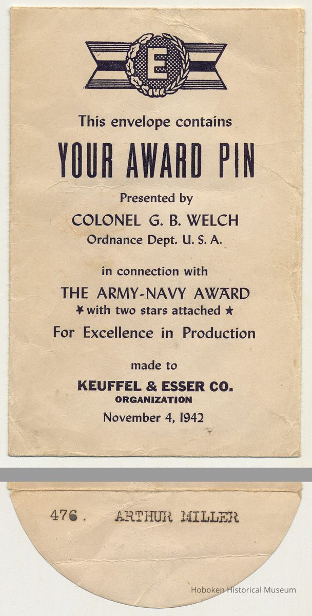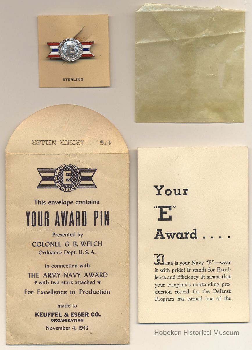 The pin is from the personal memorabilia of Arthur E. Miller (1914-1984) who was also known as Edwin Arthur Miller. Another of his "E' award pins, a different style, is objects 2012.021.0004. Born and raised in Hoboken, his job at K&E at this time is not known except that it was an occupation considered essential to the war effort and thus he was excused from military service. He is known have been engaged directly in manufacturing work as his tool chest from his time at K&E is in the Museum collections (objects 2012.021.0100) and has many small bench tools for that have yet to be studied.