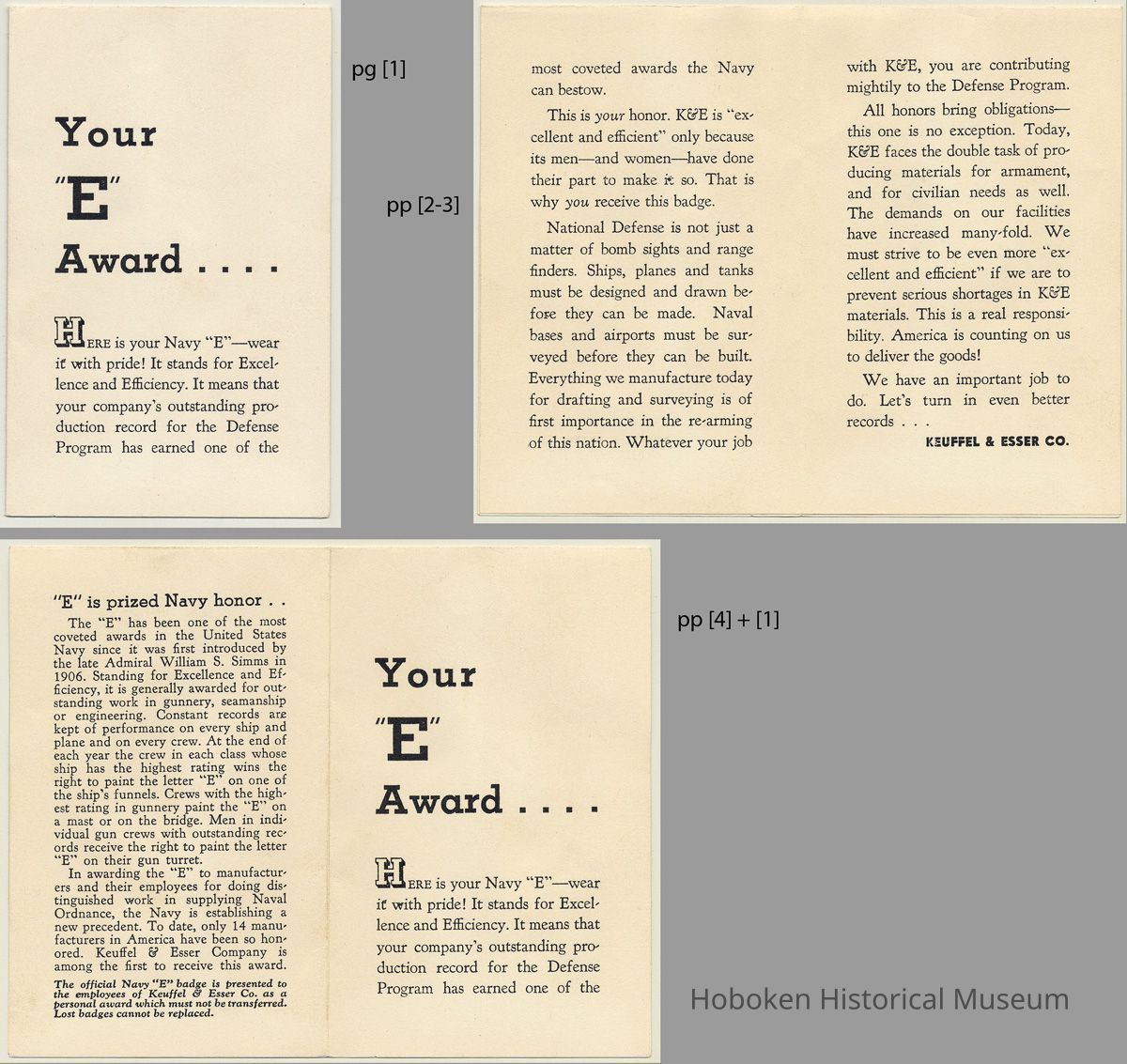 The Army - Navy "E" Award (Award for Excellence in Production). This is the third of seven such awards made to K&E. The company did significant work in Hoboken for the U.S. Army and U.S. Navy during World War II. It was only one of 13 companies in the entire country to receive as many as seven awards. (K&E received its first award on August 9, 1941 and the second on May 29, 1942.)Date of fourth one not found. Fifth one was displayed on July 10, 1945.