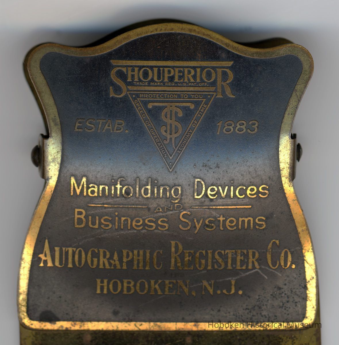 Paper binder clip: Shouperior. Autographic Register Co., Hoboken, N.J. N.d., ca. 1905-1925