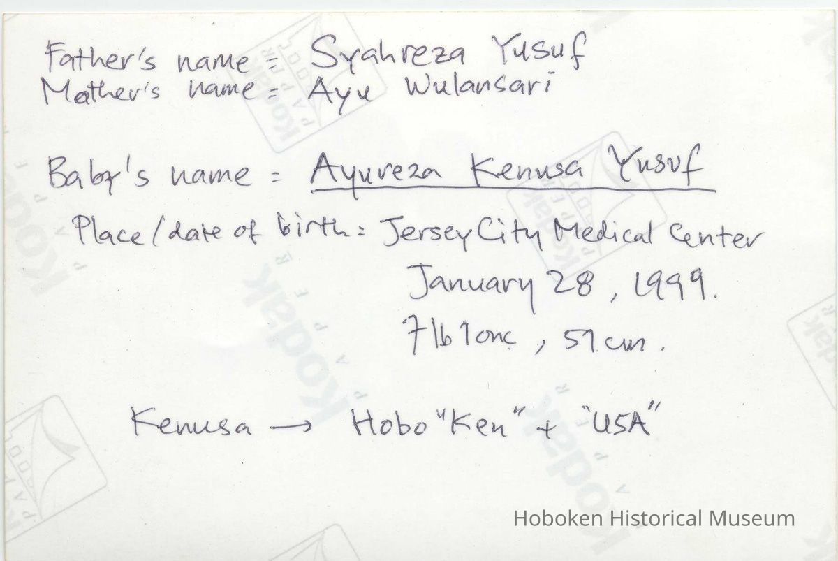 Color photo of Syahreza Yusuf and Ayu Wulansari with their son, Ayureza Kenusa Yusuf, Hoboken, no date, ca. Spring, 1999.
