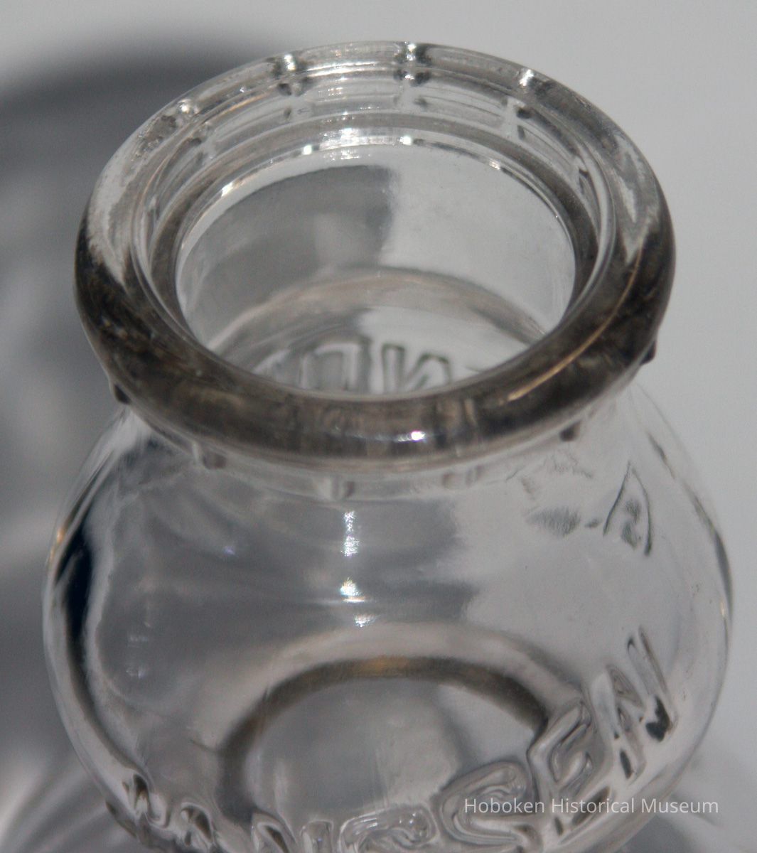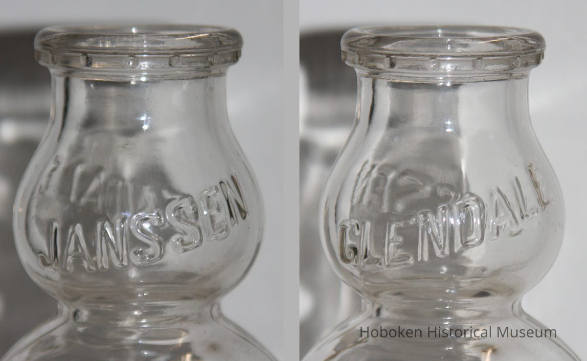 Milk bottle: Janssen / Glendale cream top 1 quart bottle. (Hoboken), 1950. Square clear glass bottle with raised diagonal lettering of company names on opposite sides of the bulb neck, 3-1/4" square x 9-1/2" high.