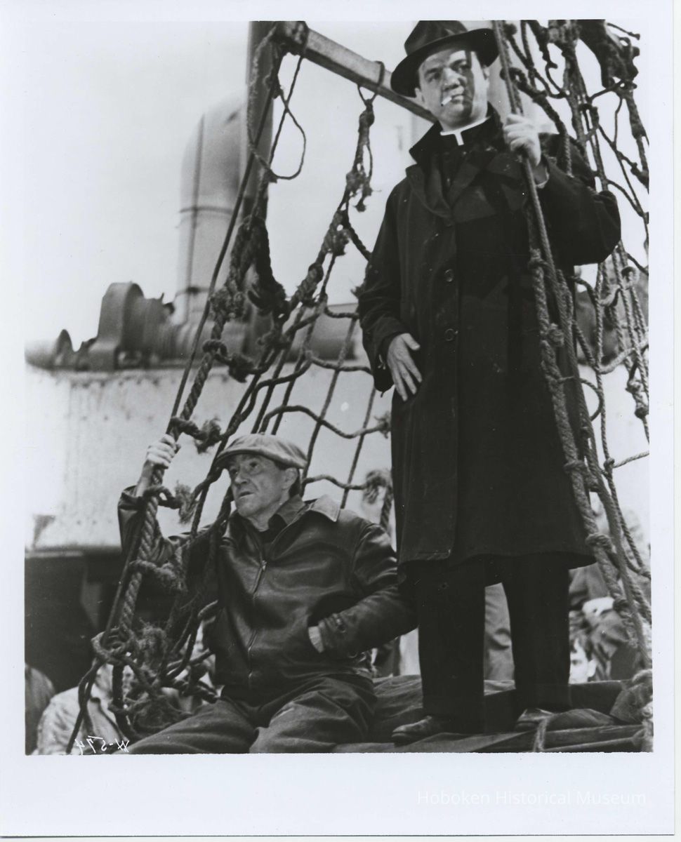 Black-and-white publicity photo of Karl Malden as Father Barry in film "On the Waterfront," Hoboken, no date, ca. 1953-1954. ca. 8" x 10" wide print, later reproduction. Reverse is blank. (The print as received was reversed: the mirror image and as found image are shown here.)