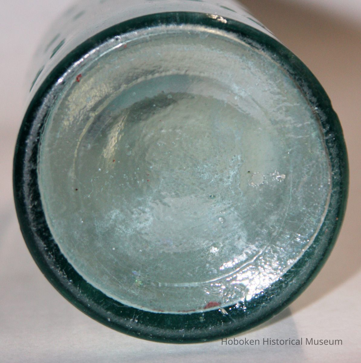 Green-tinted blown glass, blob top, embossed, 3-1/4" diameter x 11-17/16" high. Metal & cork stopper (fragmentary remains) with bail and tie wire.