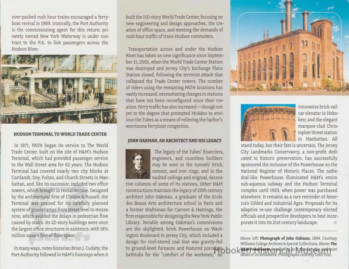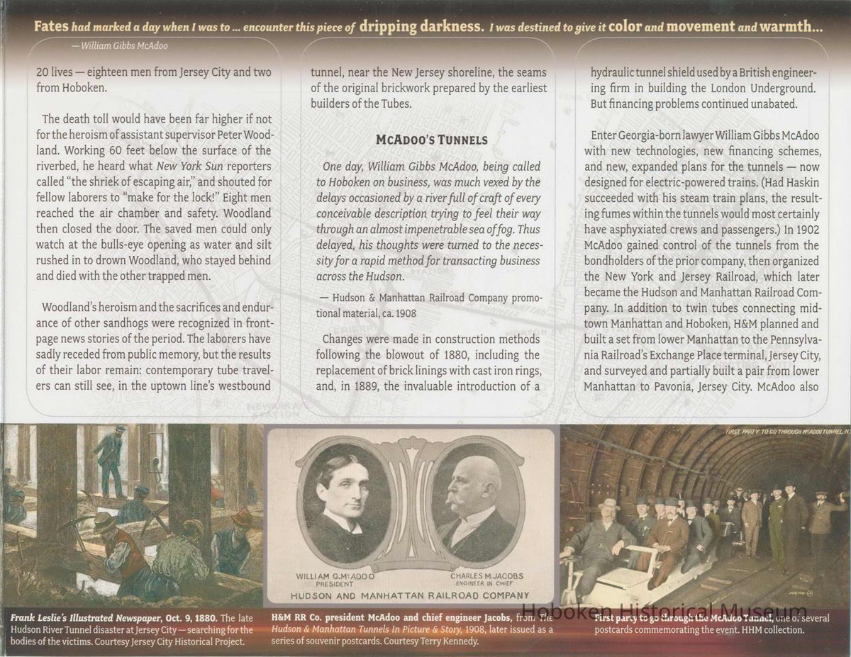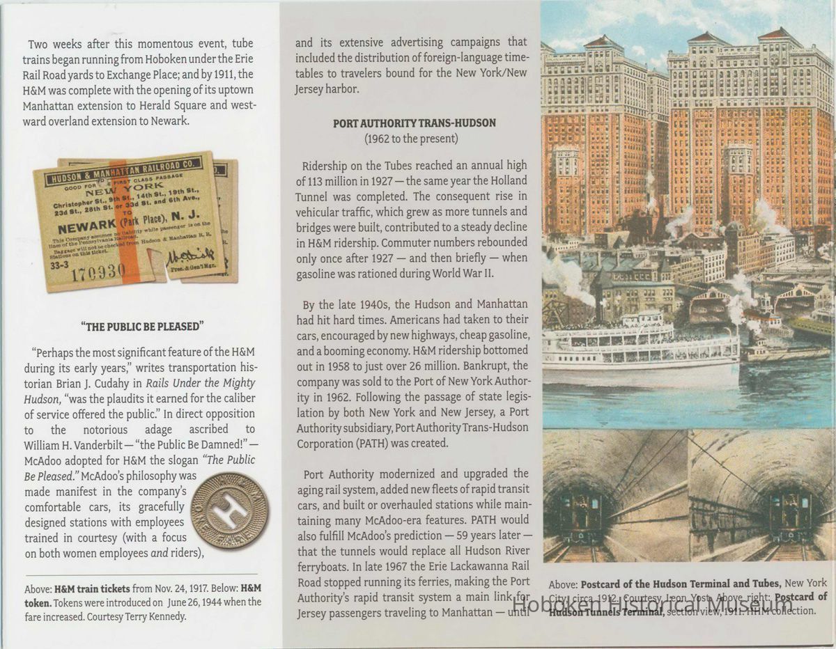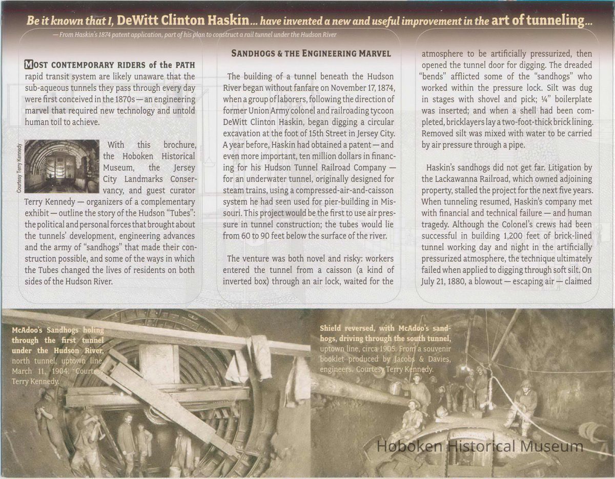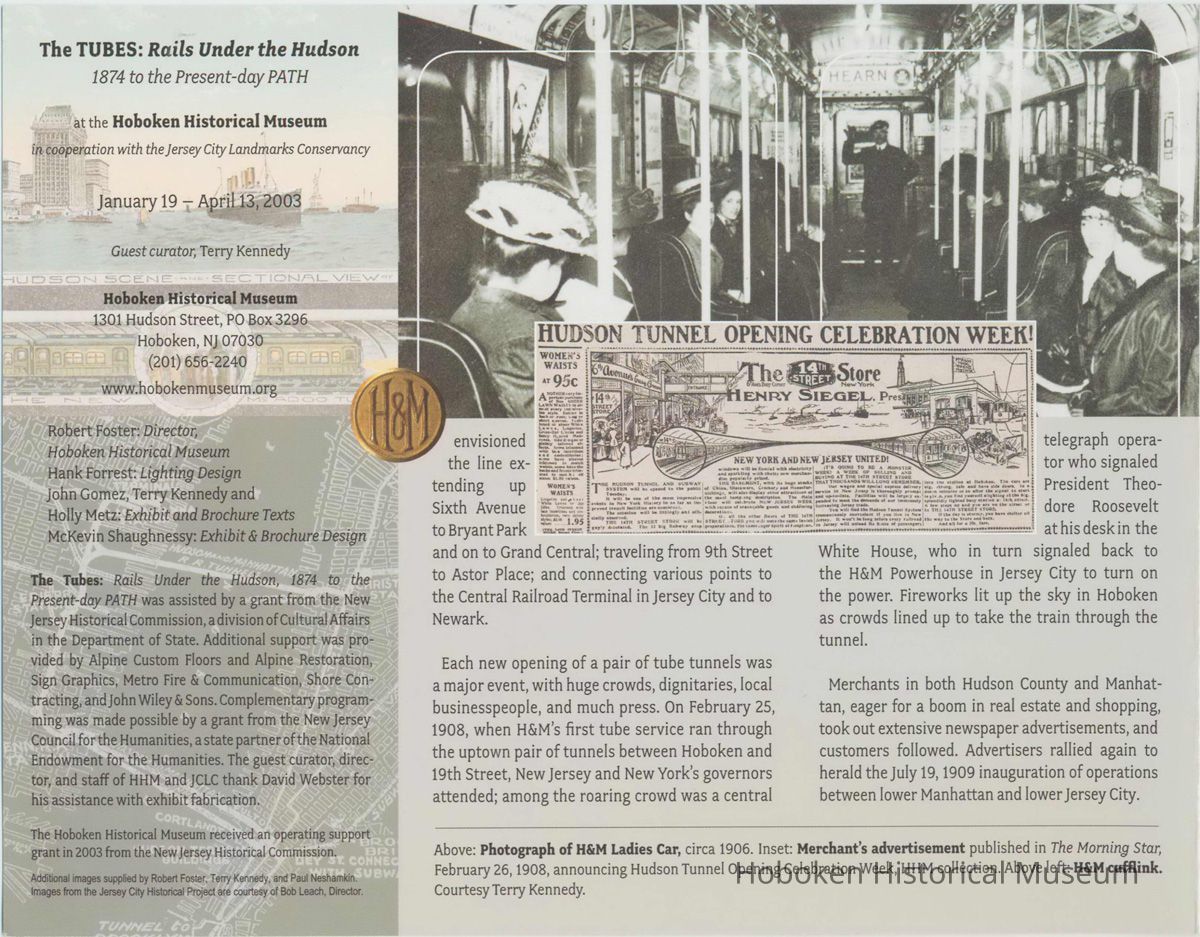 Brochure for exhibition "The Tubes: Rails Under the Hudson. 1874 to the Present-day PATH" presented by the Hoboken Historical Museum, Jan. 19-April 13, 2003. 7" high x 9" wide folded, 6 panels opening to 27" wide. Illustrated.