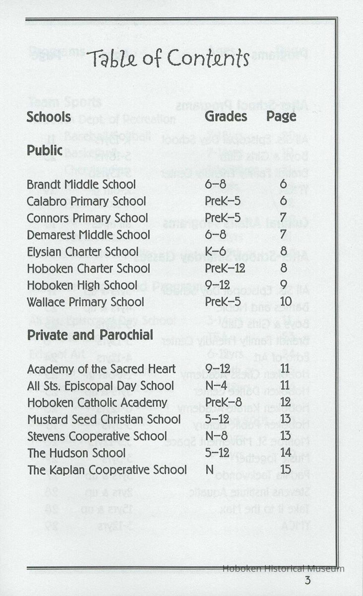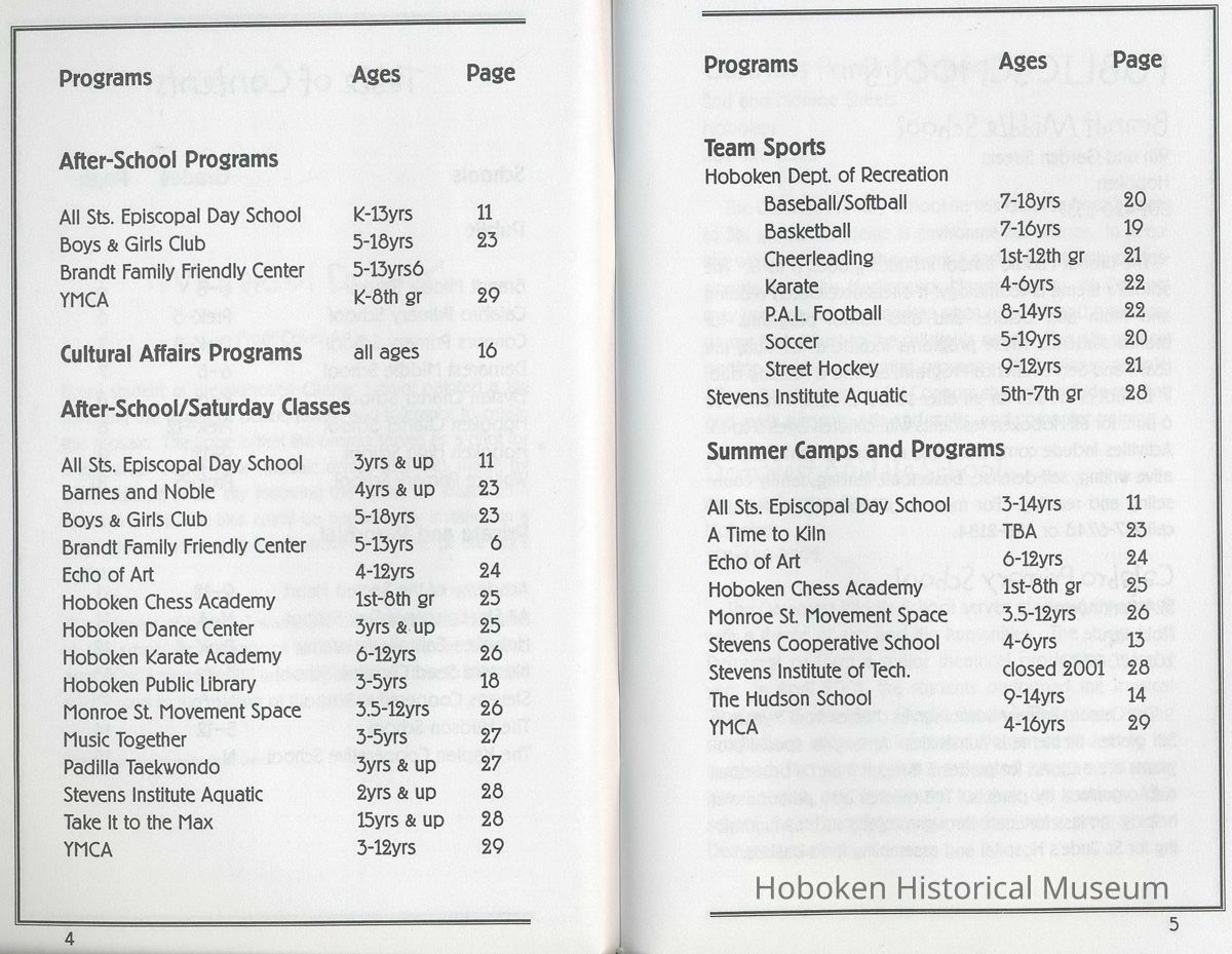 Children's Resource Guide to Hoboken for ages 3 to 18 years. Schools; Sports; After-school programs. Published by Friends of the Hoboken Charter School, 4th and Garden Streets, 3rd Floor, Hoboken, N.J. May 1, 2001. 8vo booklet, 80 pp. plus cover.
