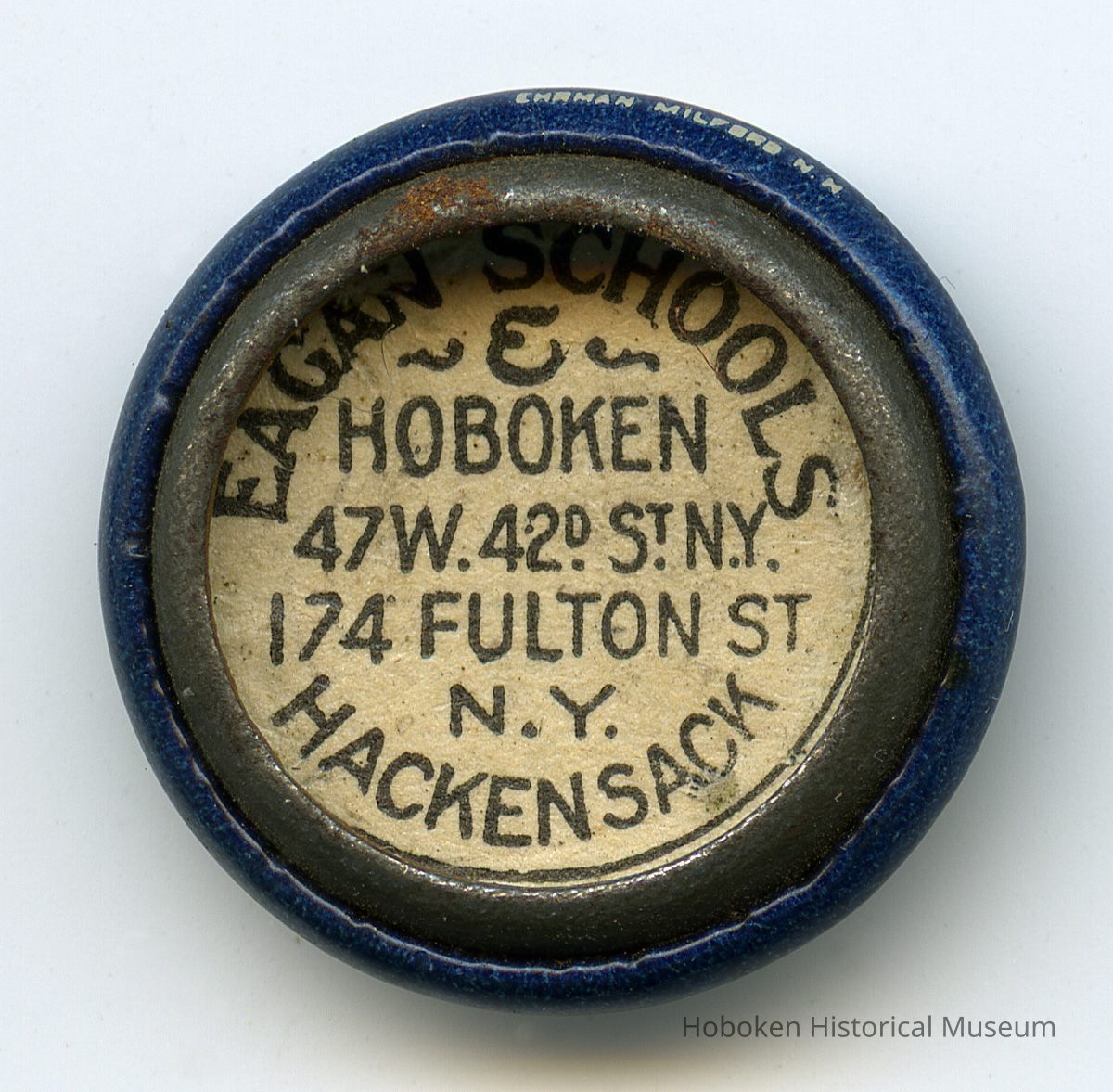 School was founded in Hoboken in 1903 by John J. Eagan and Hoboken location was 66 Hudson St. See objects 2014.001.0090 for a different button of same era.