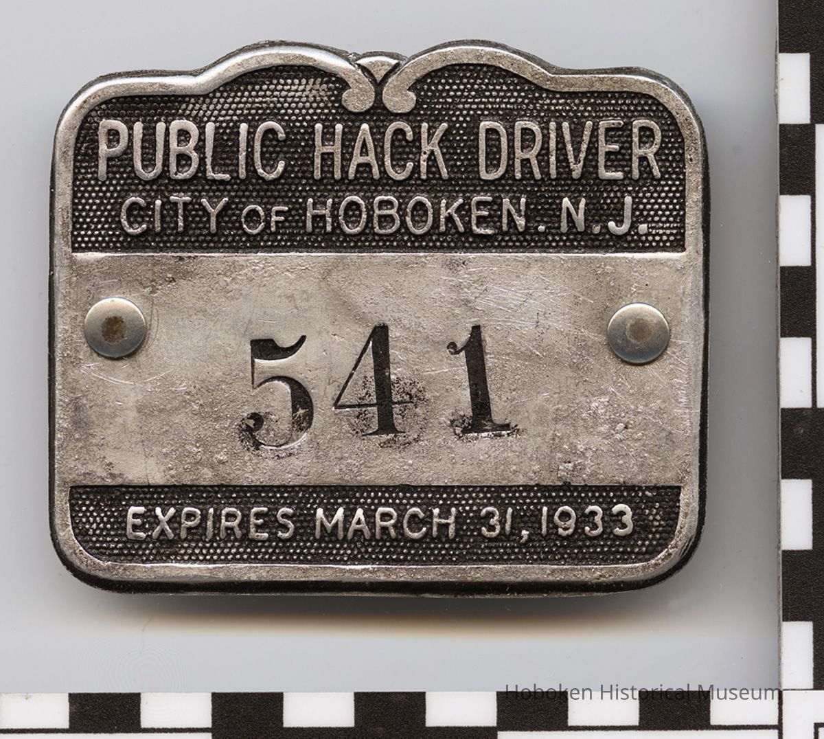 Badge, license: Public Hack Driver, City of Hoboken, N.J. 541. Expires March 31, 1933.