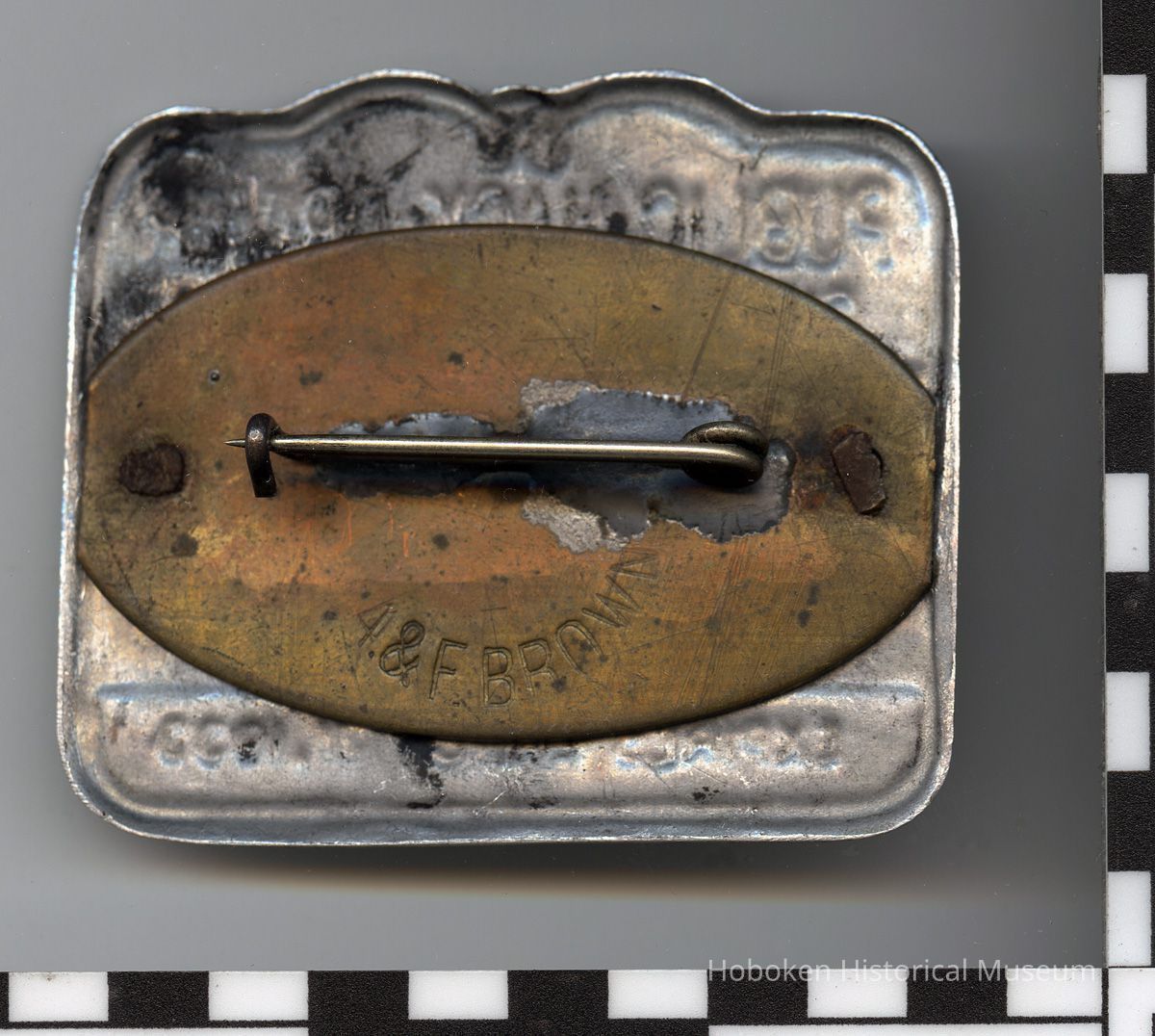 Stamped aluminum metal, 2" high x 2-5/16" wide, with black painted edge and infilled fields and number. Oval brass pin plate riveted to back.