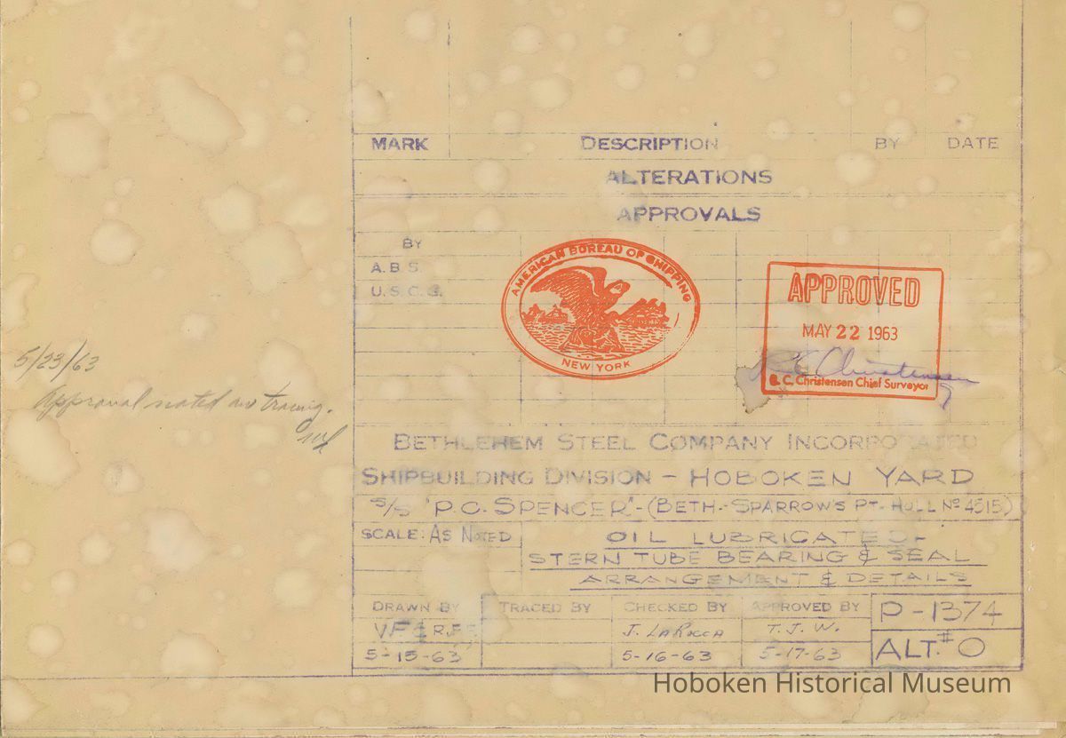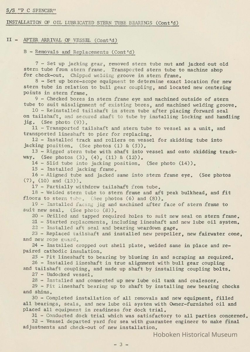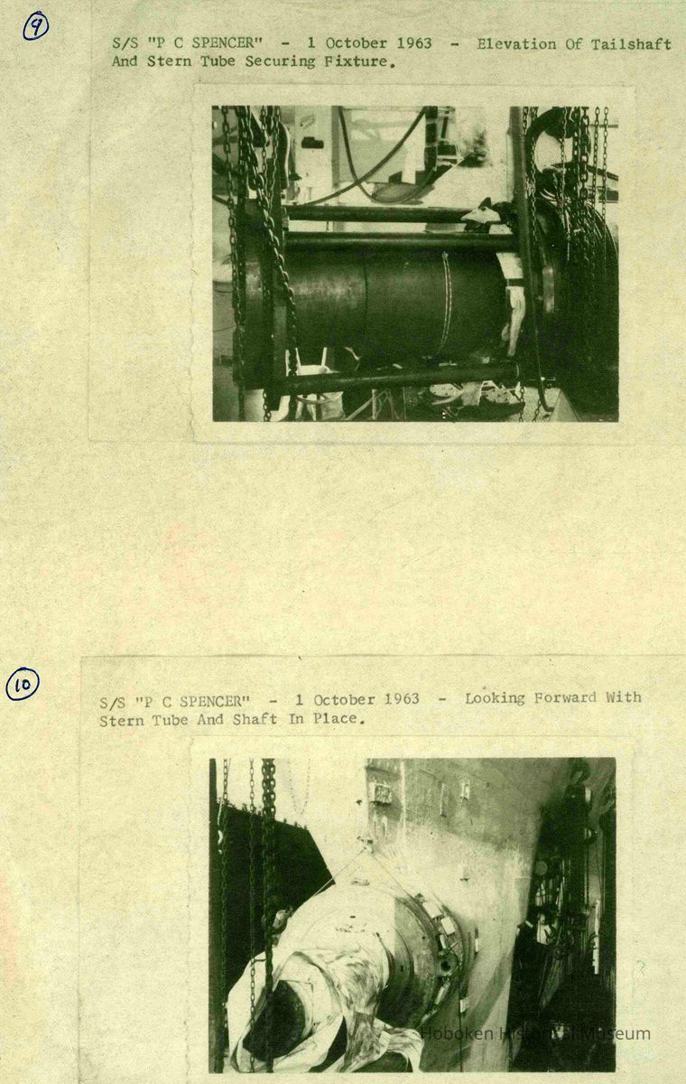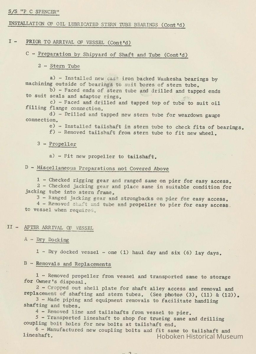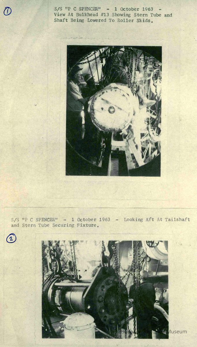 Report on the Installation of Oil Lubricated Stern Tube Bearings on the S.S. P. C. Spencer. Work done at the Bethlehem Steel Shipyard, Hoboken, 1963.