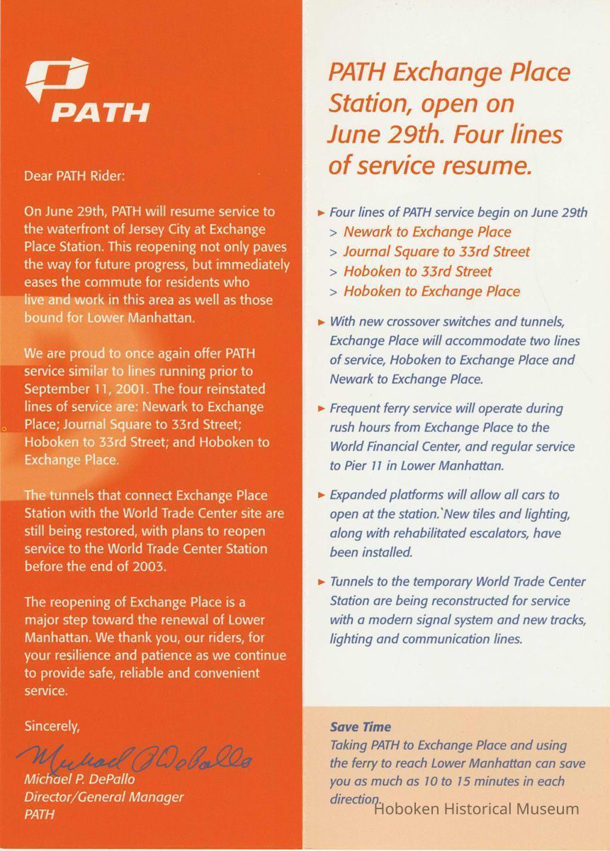 item 1. pamphlet announcement for Exchange Place Station. 2 copies.