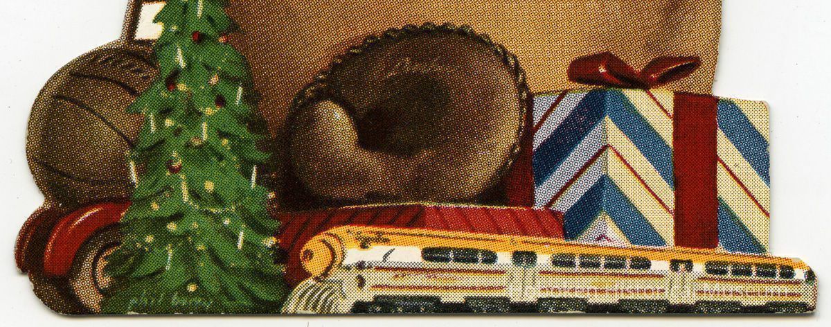 Die-cut cardstock, 3-1/2" wide x 6-11/16" high, in shape of Santa Claus with a bag of toys and toys arranged at his feet; color printed image on front; advertising text in black on back; hang hole at top.