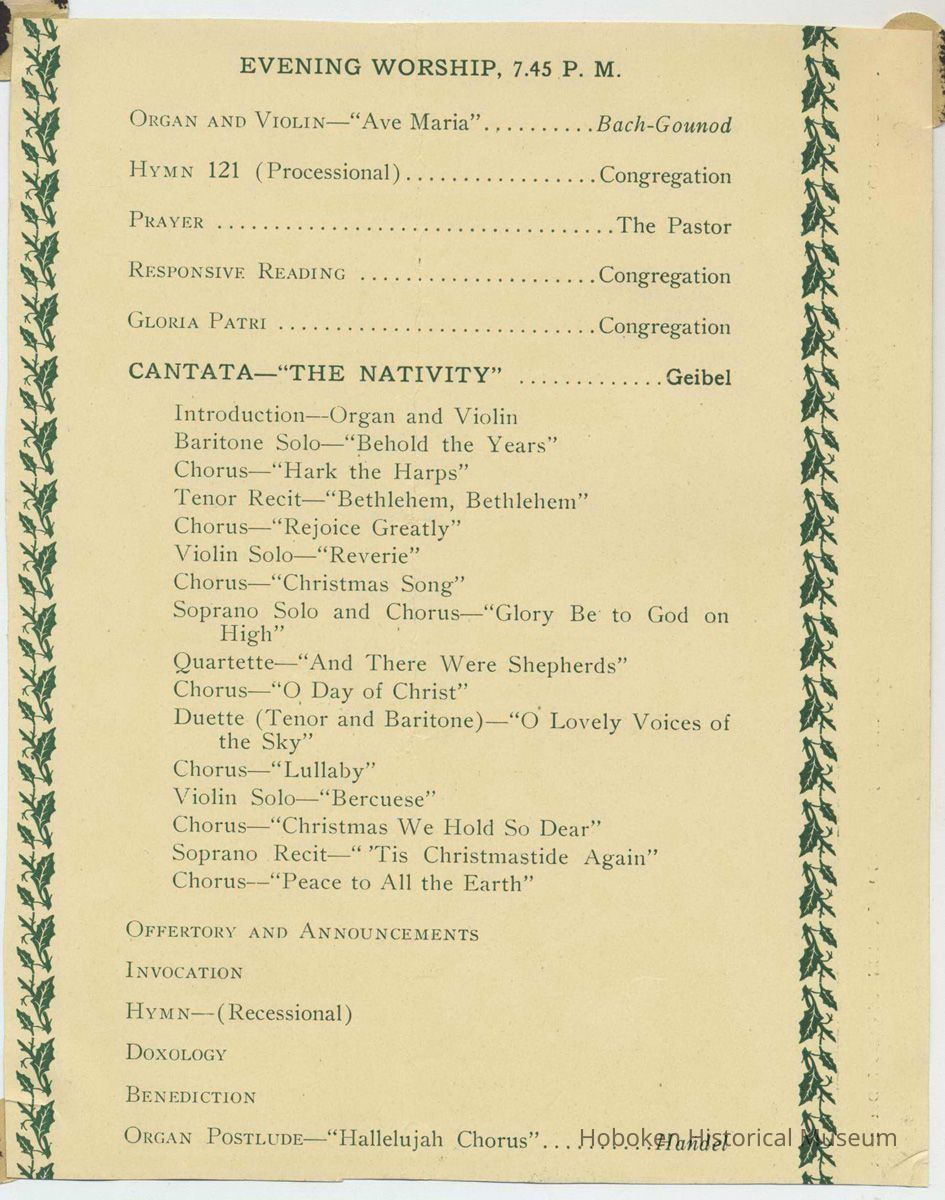 Reverse has a portion of the printed program for 7:45 p.m. evening service. The church is also known as Trinity Methodist Episcopal Church.