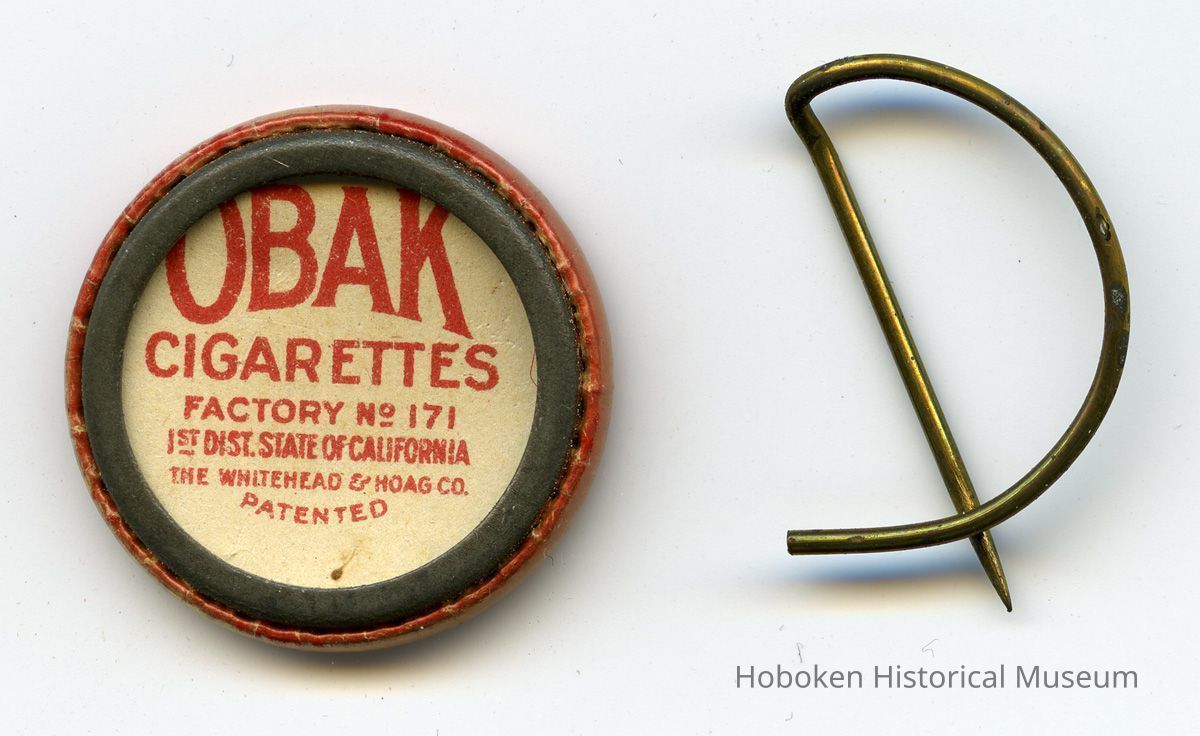 Printed celluloid over metal back, 7/8" diameter; pinback. Red field with white type. Printed insert inside back with Obak Cigarettes name and location as above. Made by: The Whitehead & Hoag Co. Patented. (Note: the company was based in Newark, N.J. and the city name usually appears with the company name, but does not on this label.)