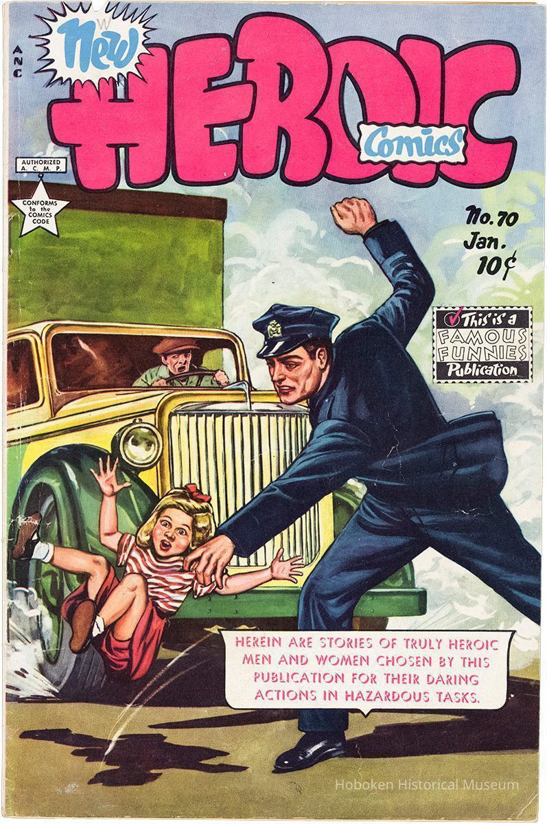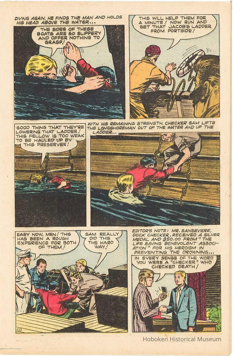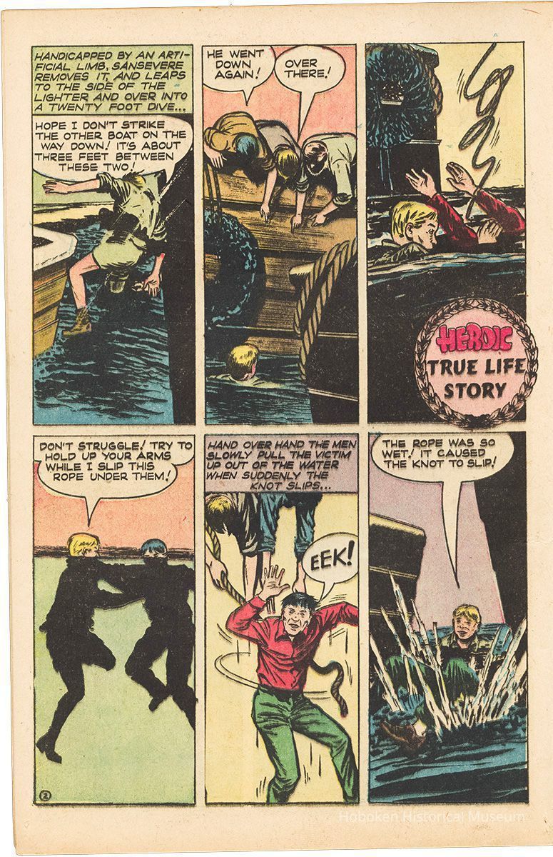 Of many comics stories within, one is a 3 page story, "Handicapped Hoboken Hero" about cargo checker Sam Sansevere, an amputee with a prosthetic leg, saving a longshoreman from the Hudson River. Signed Bill Walton.