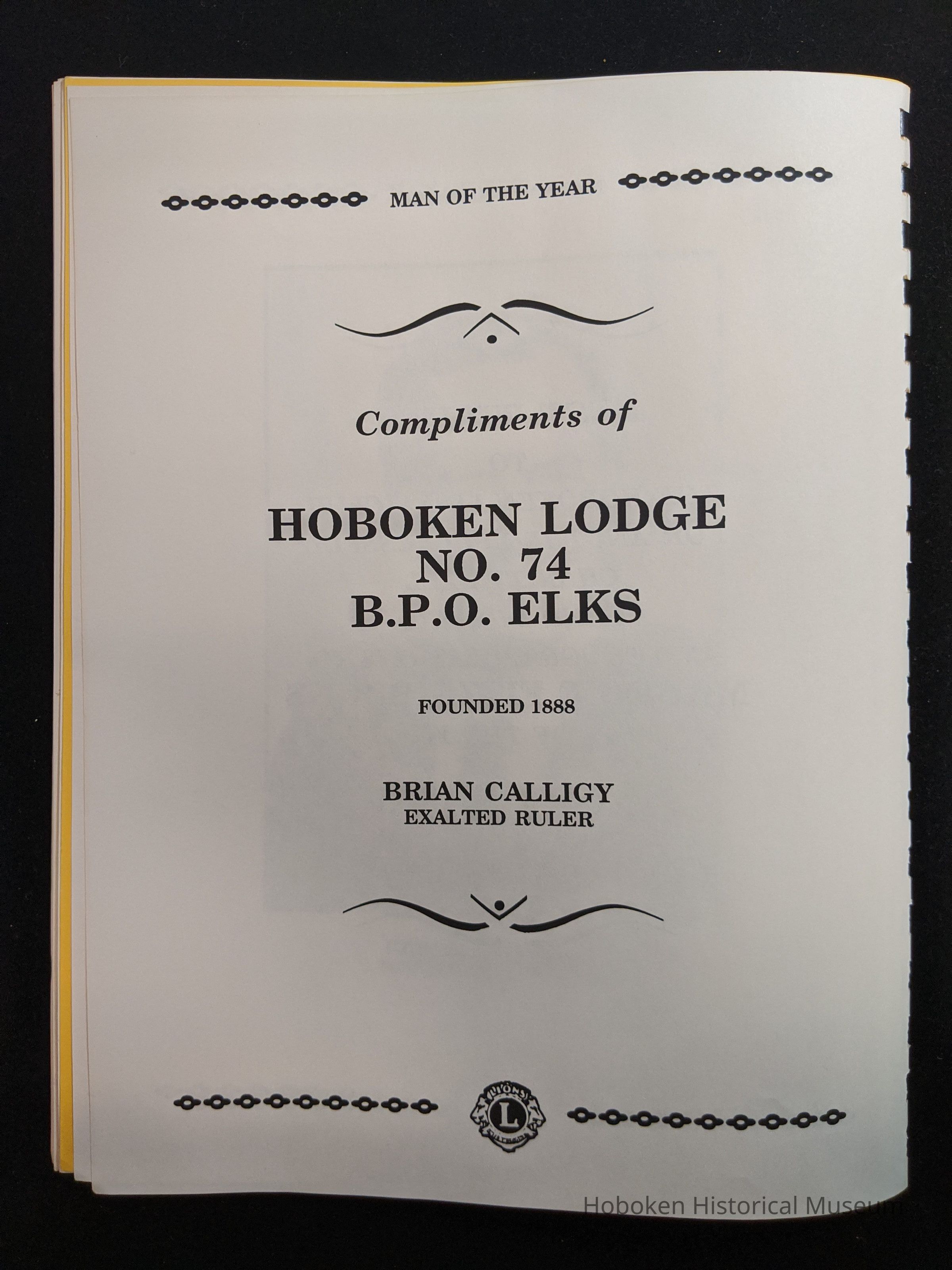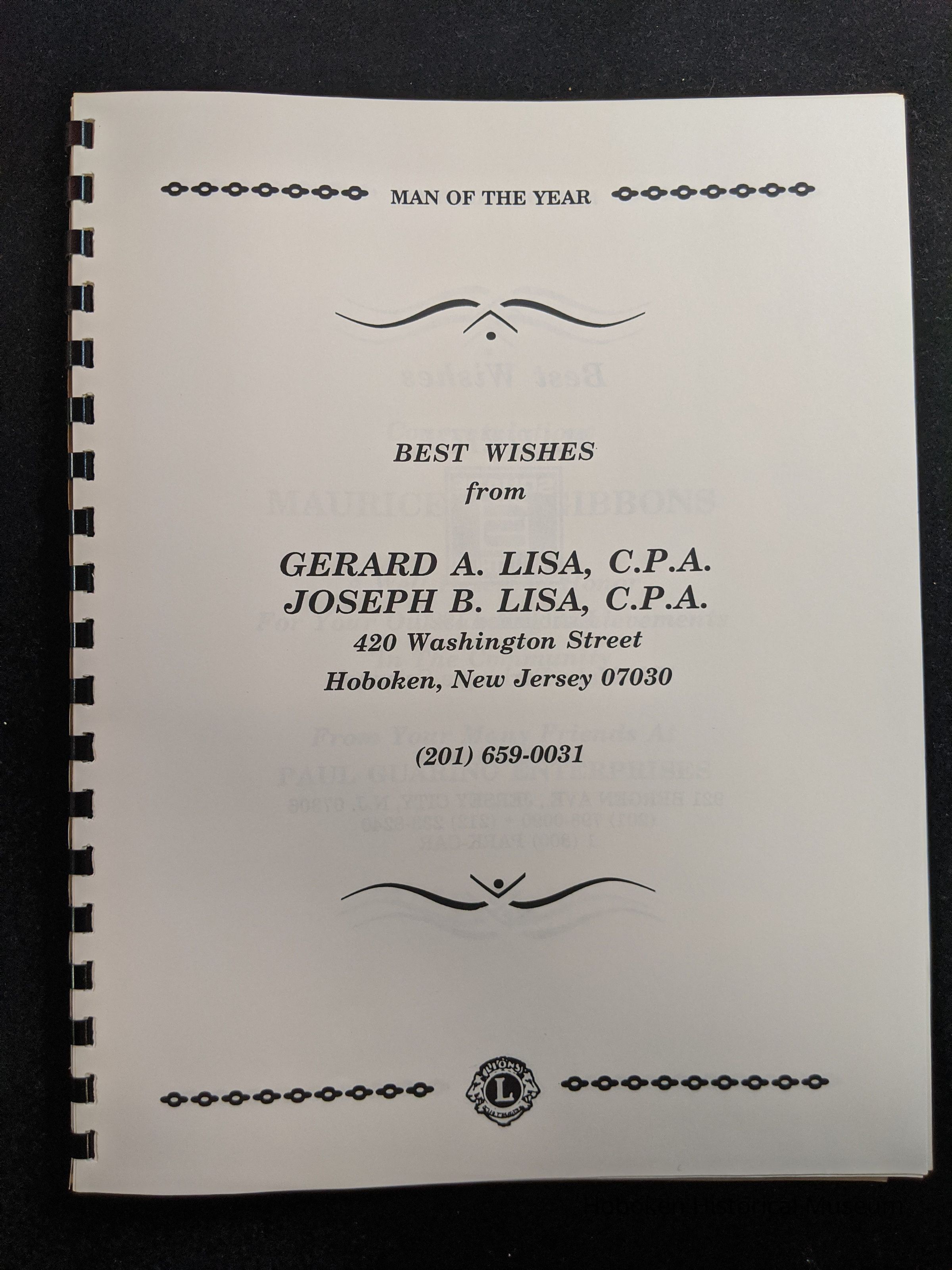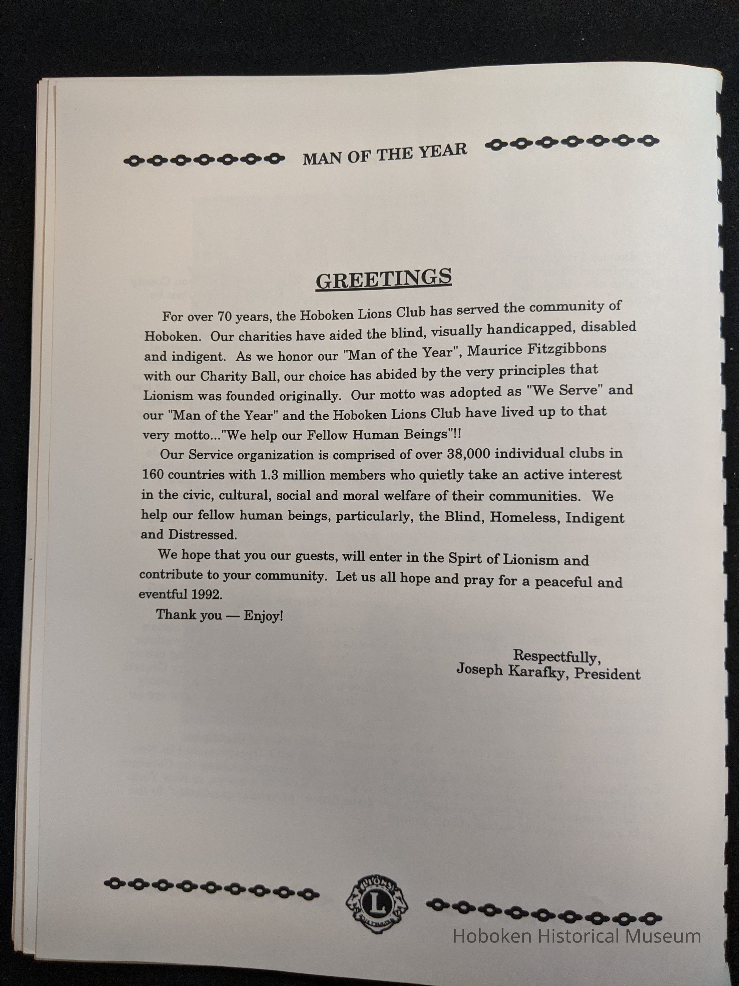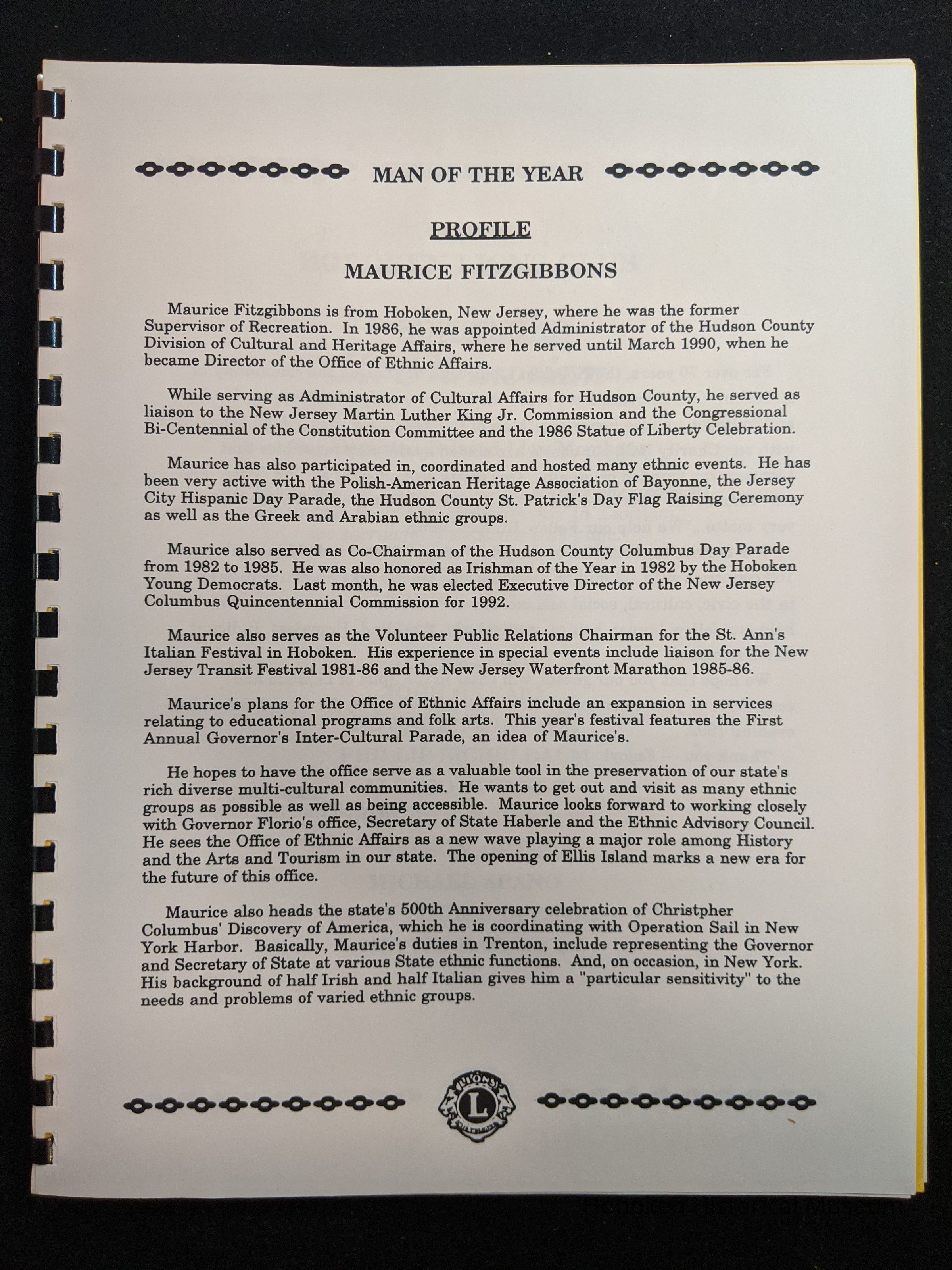 Bound program from the Hoboken Lions Club Charity Ball Dinner honoring Man of the Year Maurice Fitzgibbons. Saturday, February 12, 1992. Front and back cover on white card stock. Interior 18 sheets/36 pages, all white except one is goldenrod.