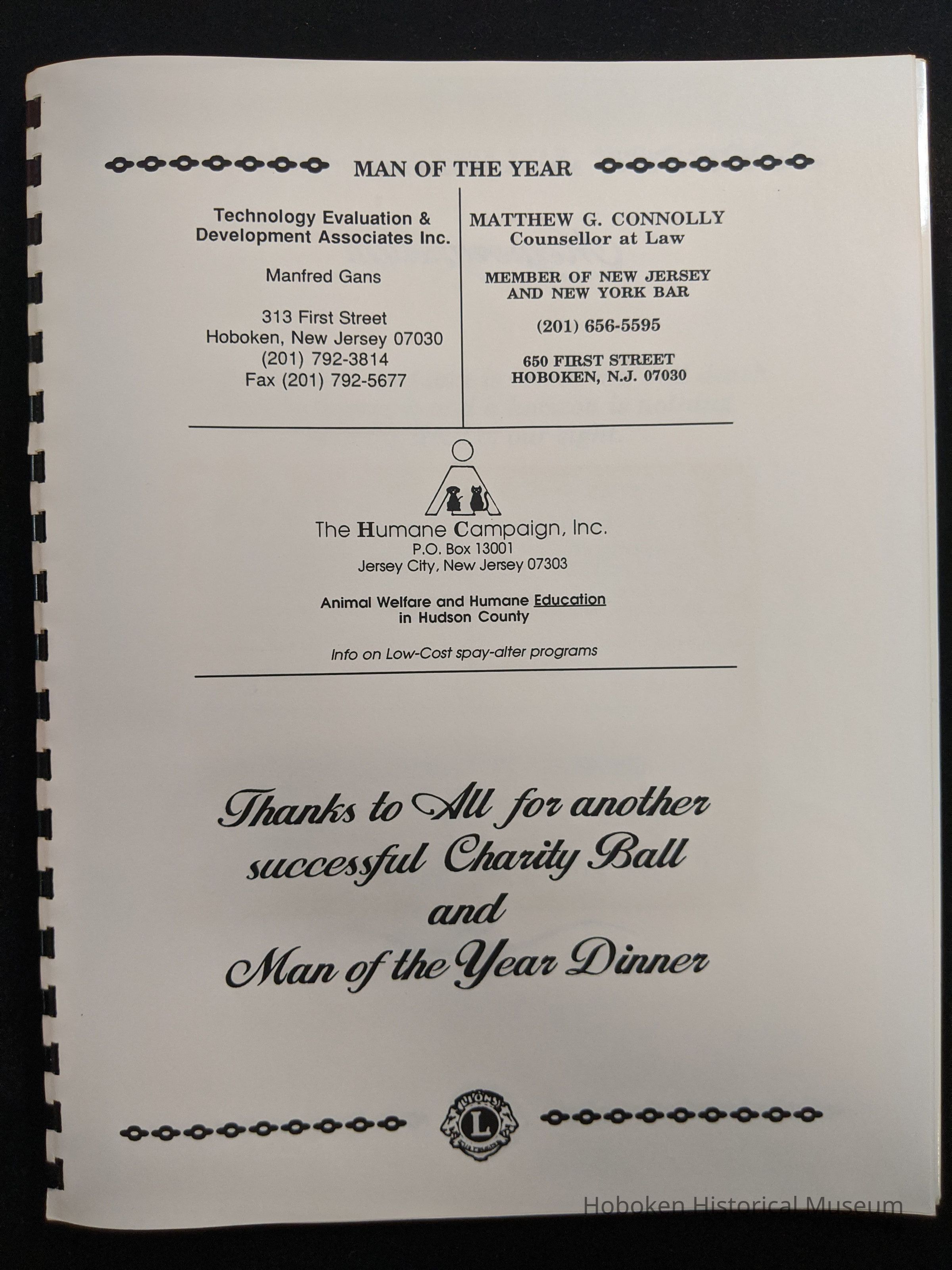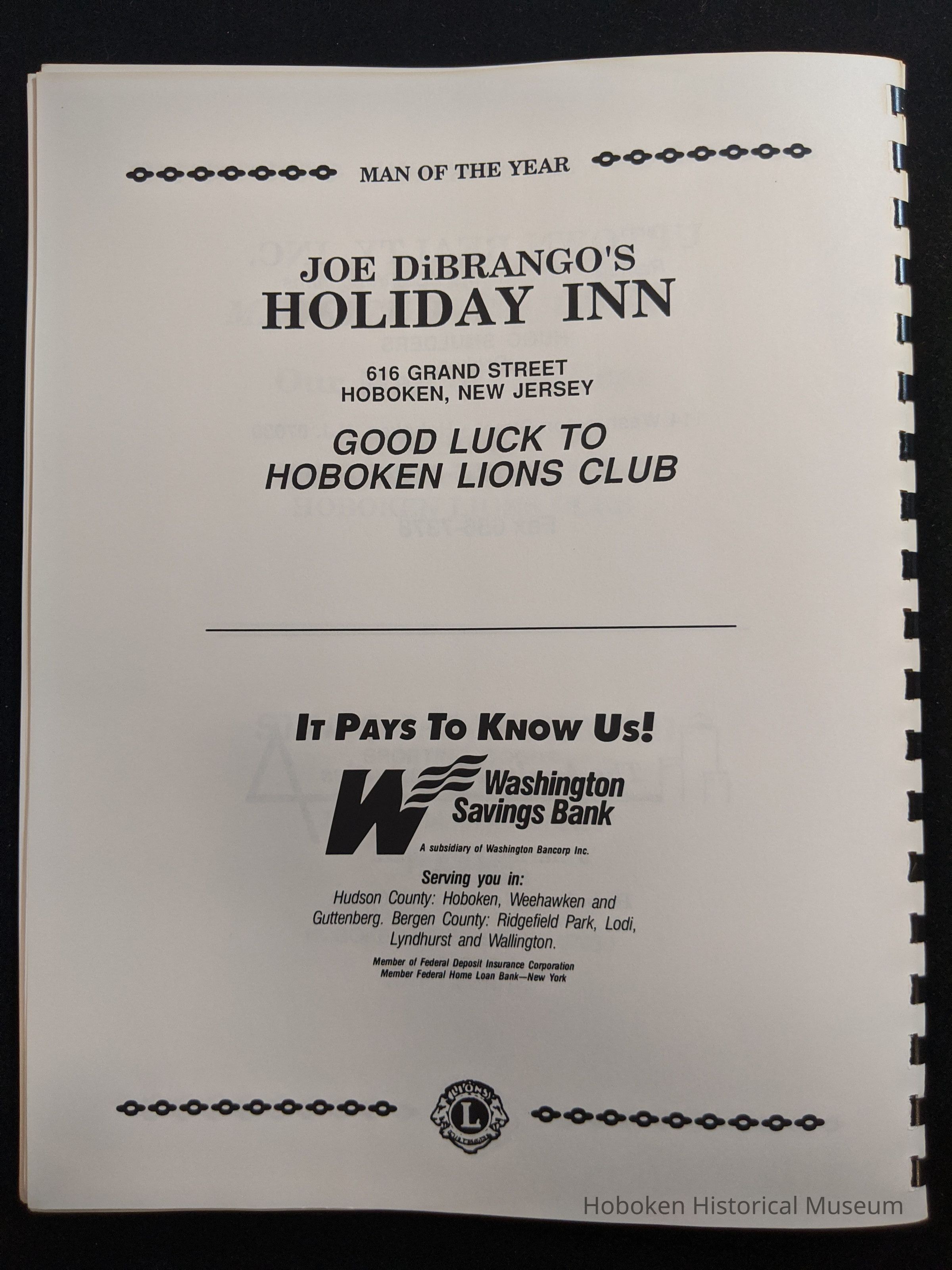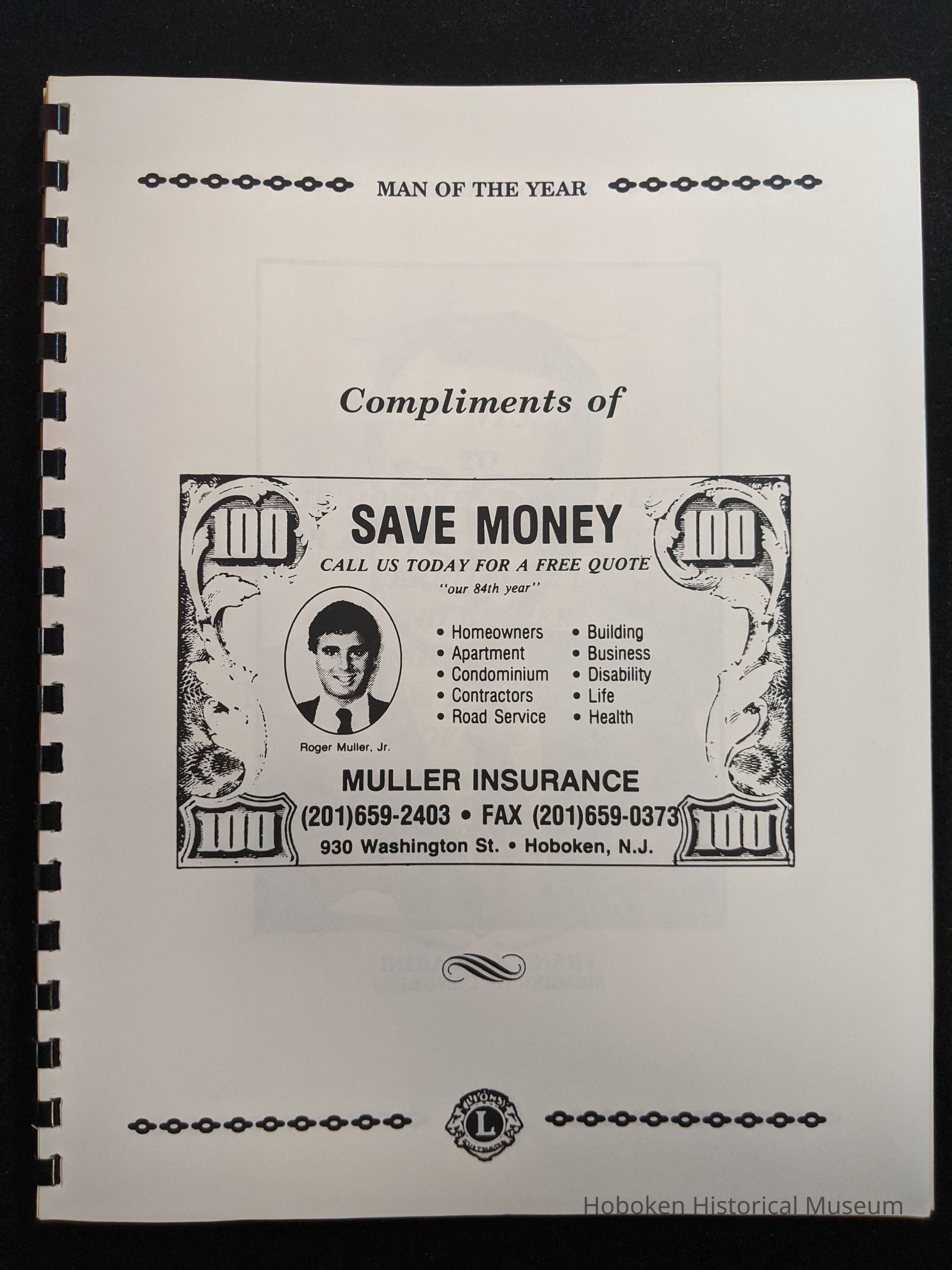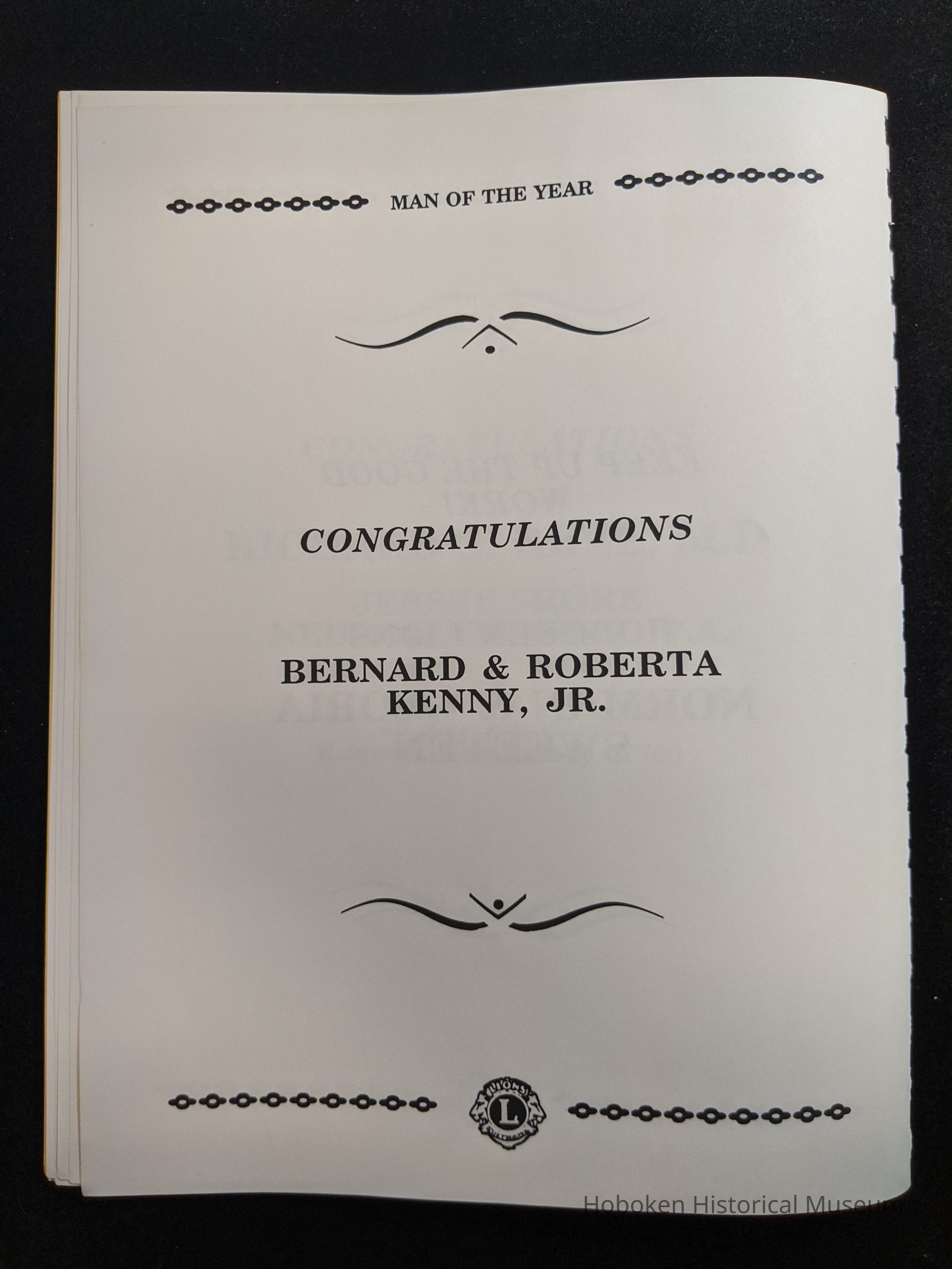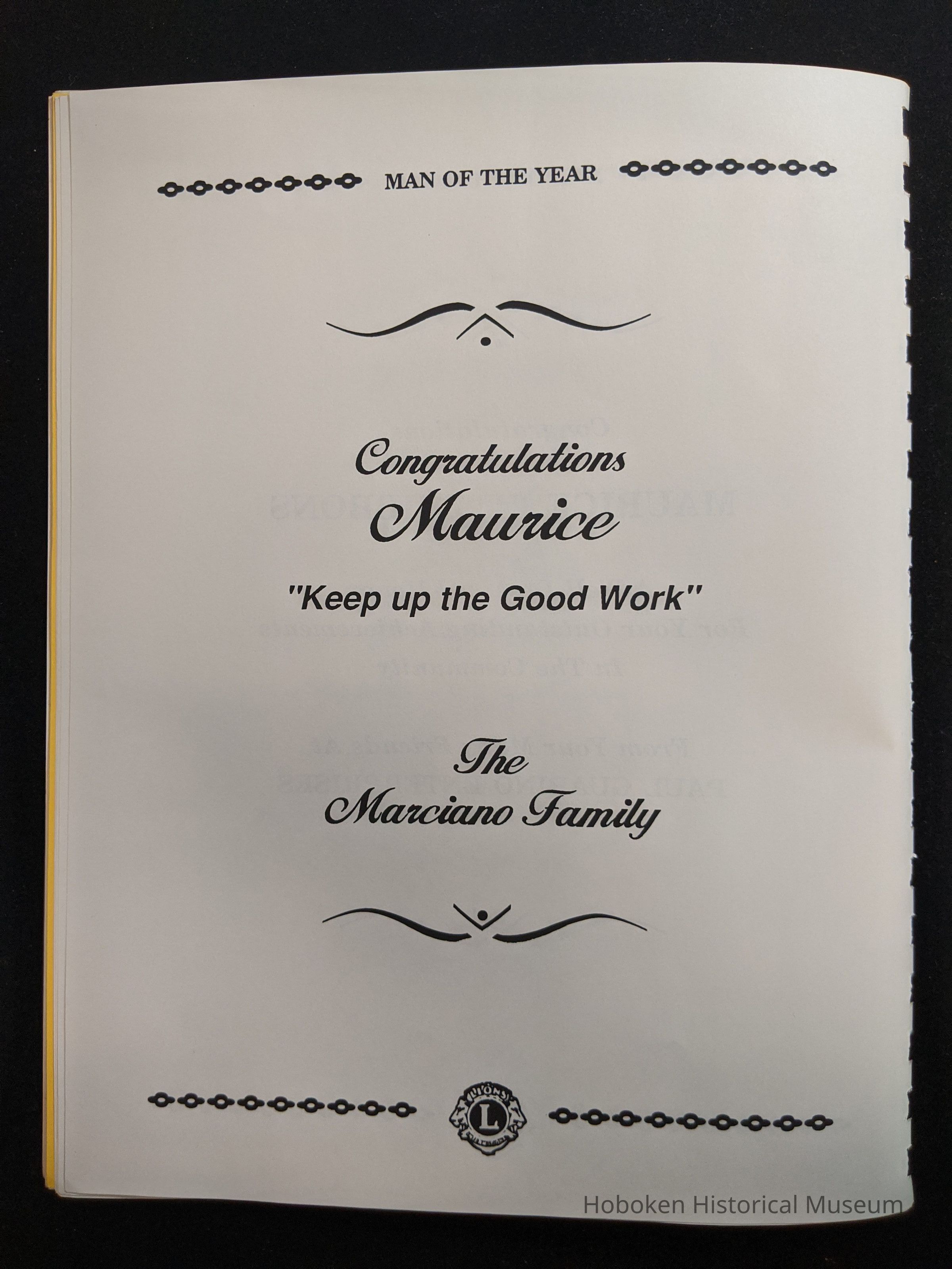 Bound program from the Hoboken Lions Club Charity Ball Dinner honoring Man of the Year Maurice Fitzgibbons. Saturday, February 12, 1992. Front and back cover on white card stock. Interior 18 sheets/36 pages, all white except one is goldenrod.
