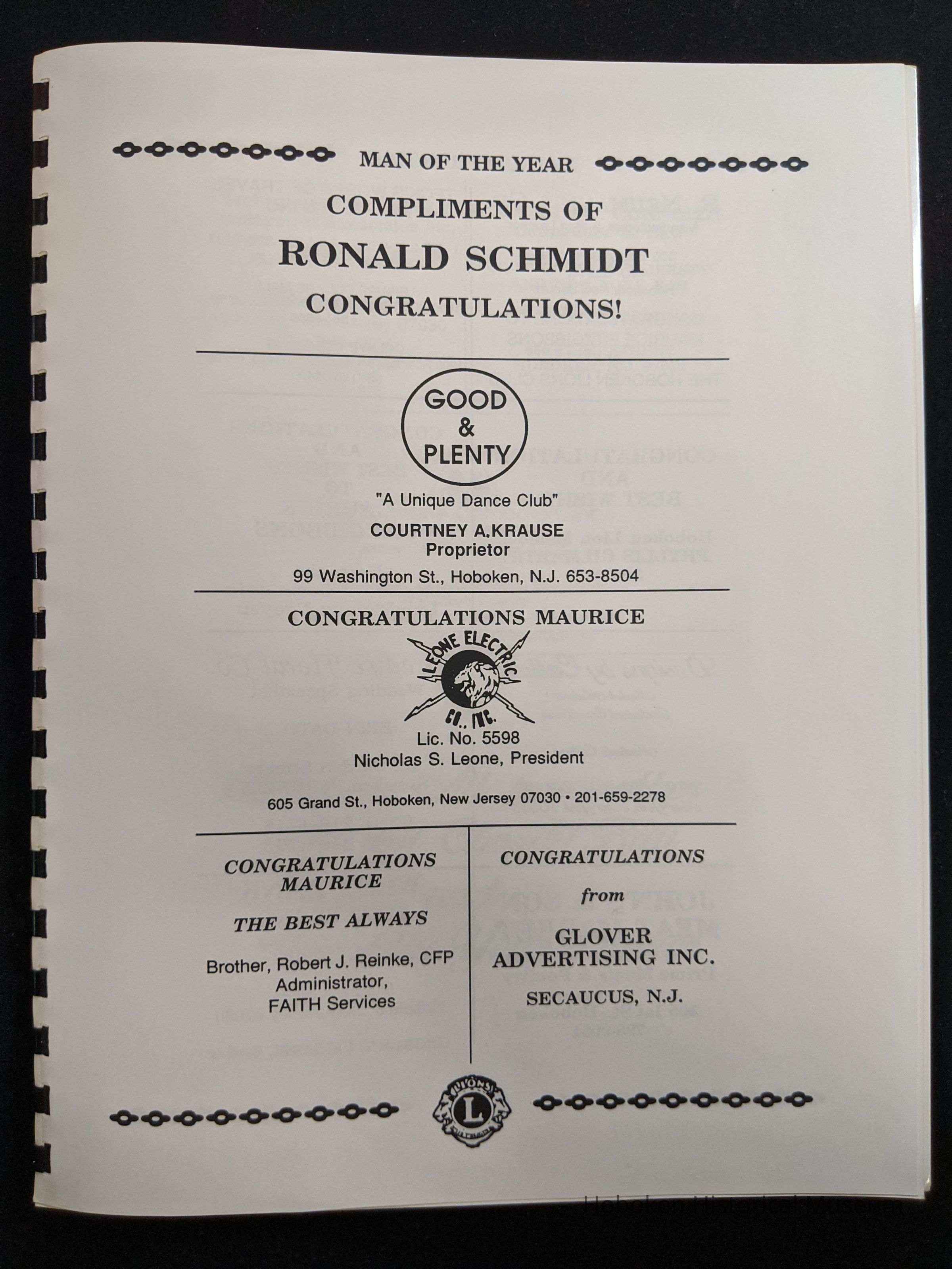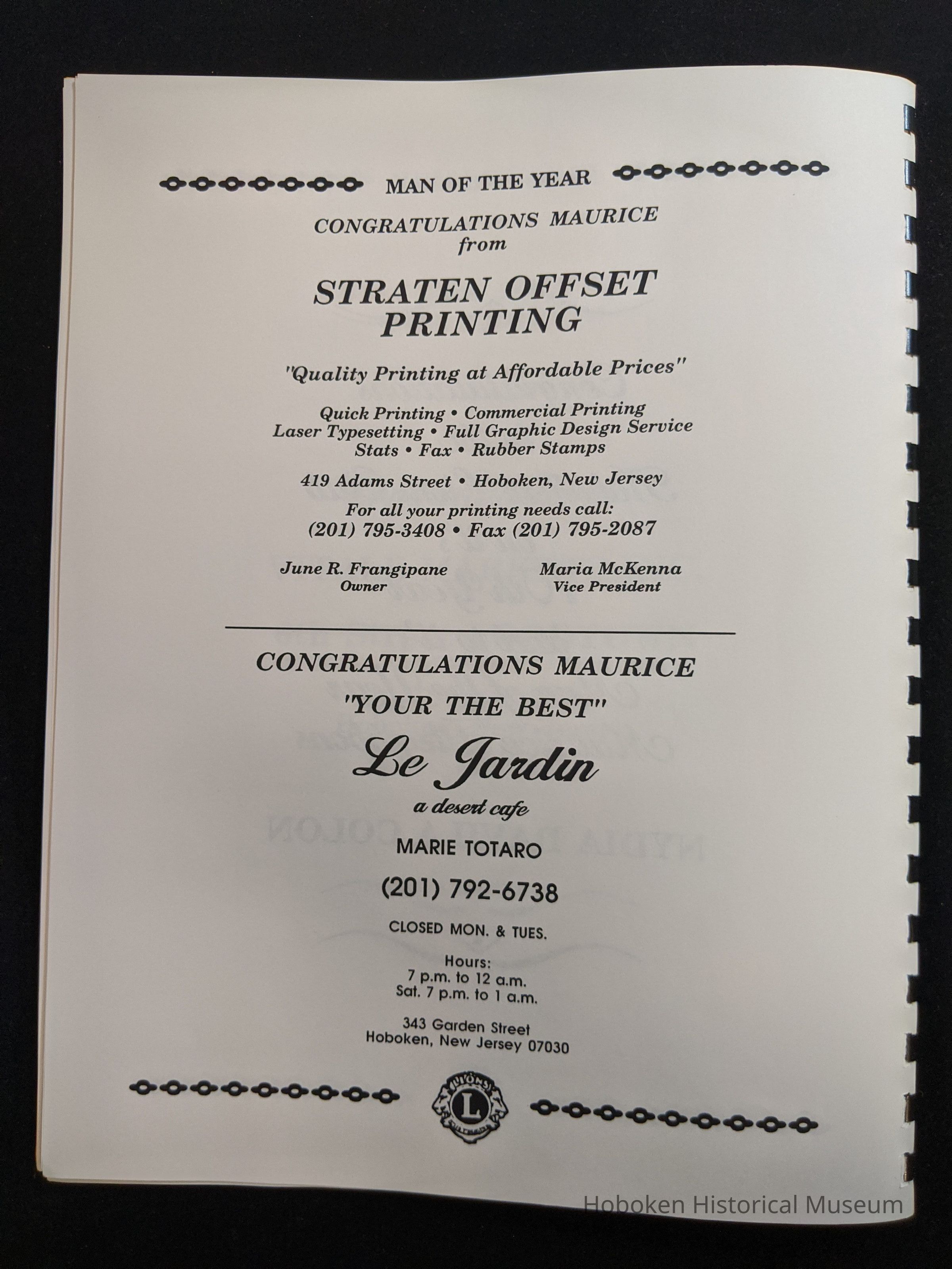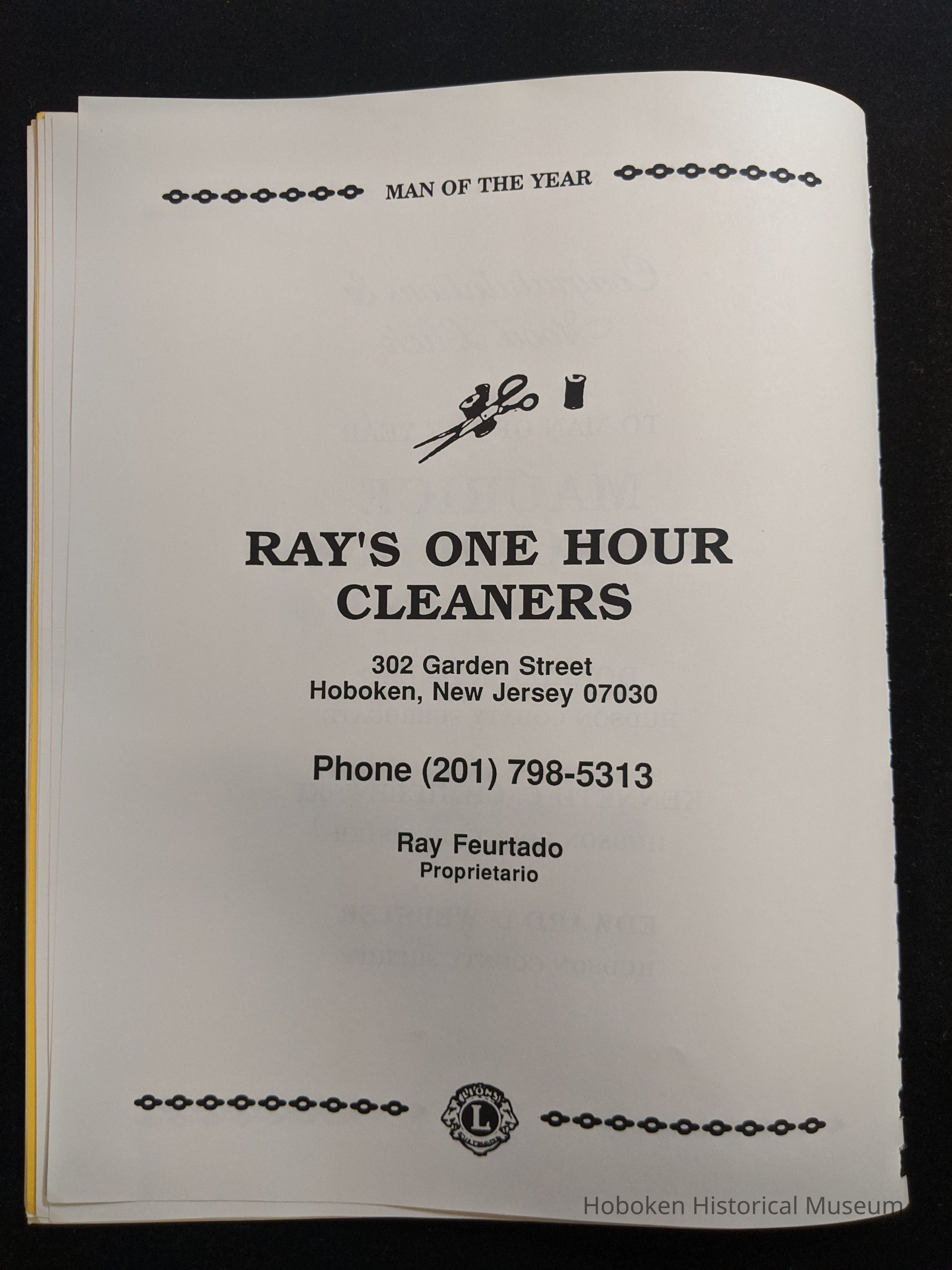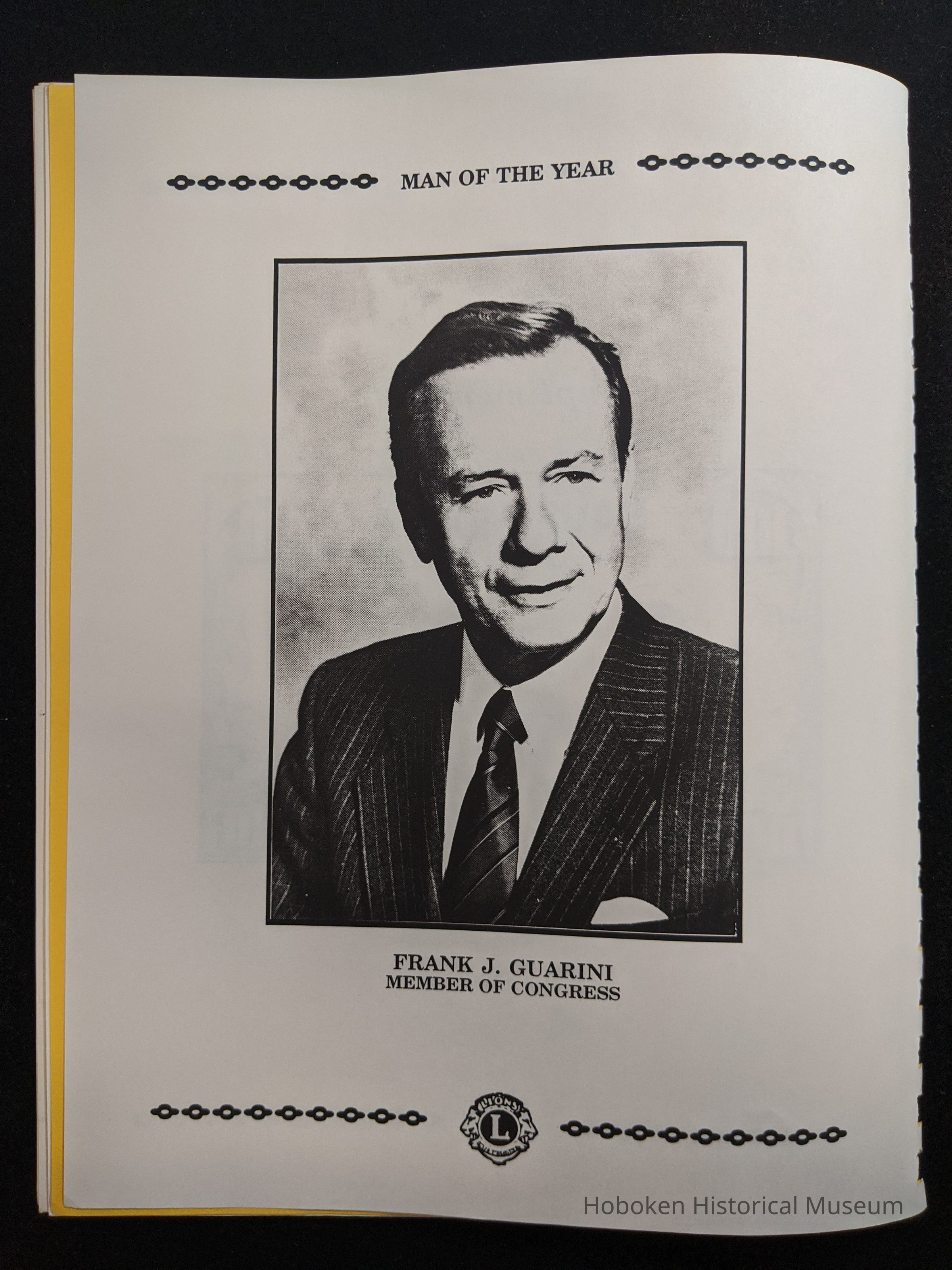 Bound program from the Hoboken Lions Club Charity Ball Dinner honoring Man of the Year Maurice Fitzgibbons. Saturday, February 12, 1992. Front and back cover on white card stock. Interior 18 sheets/36 pages, all white except one is goldenrod.