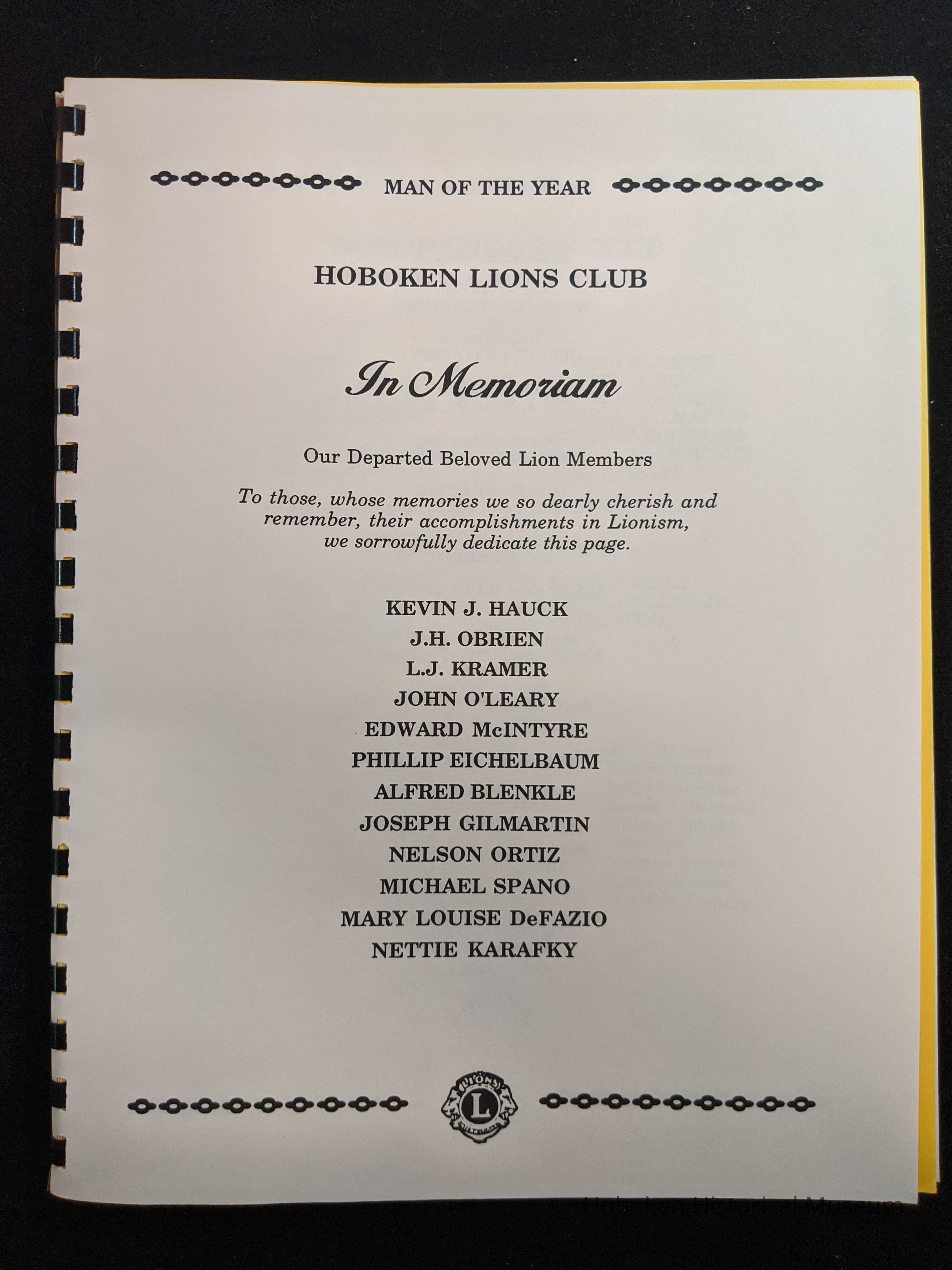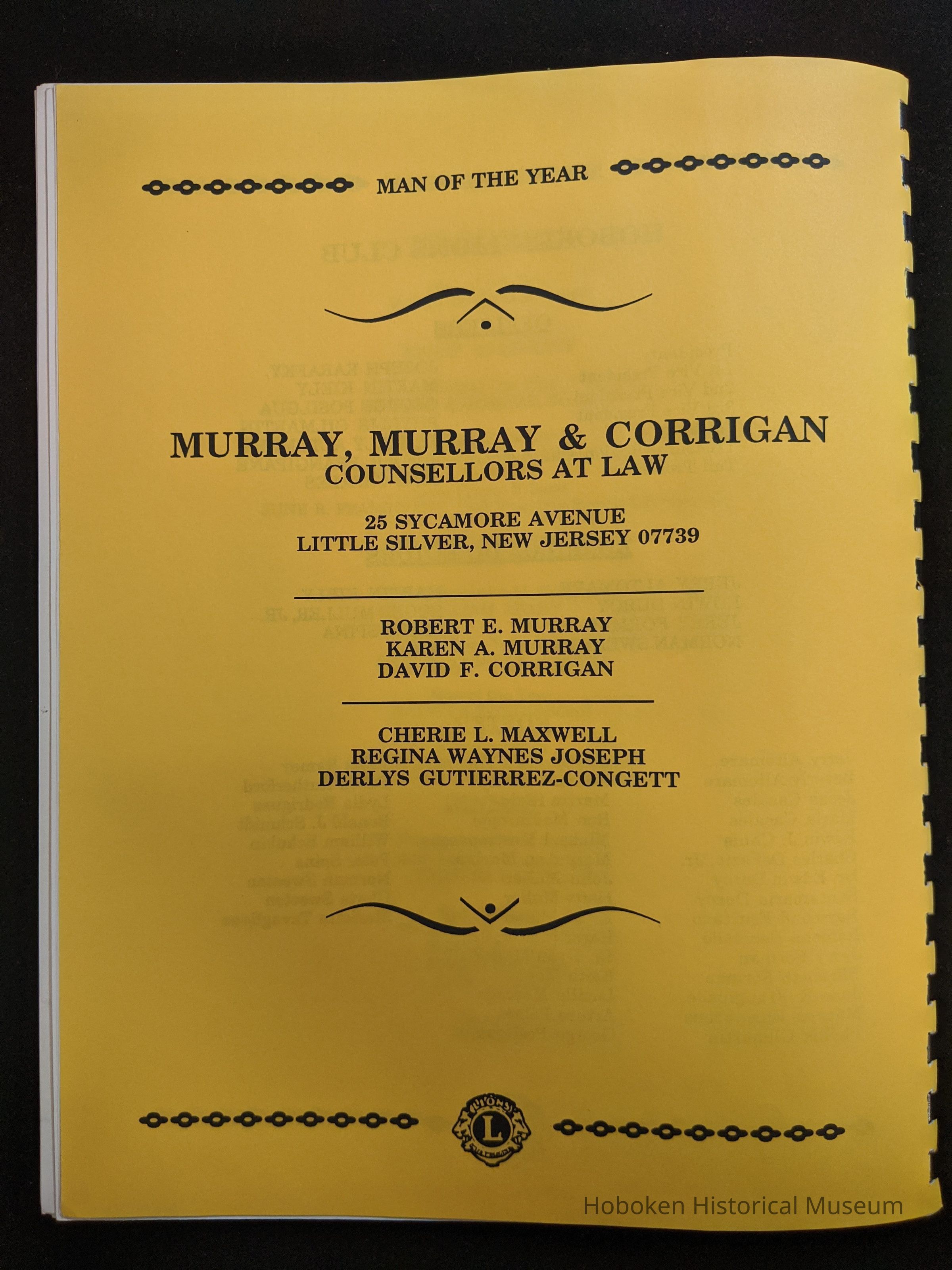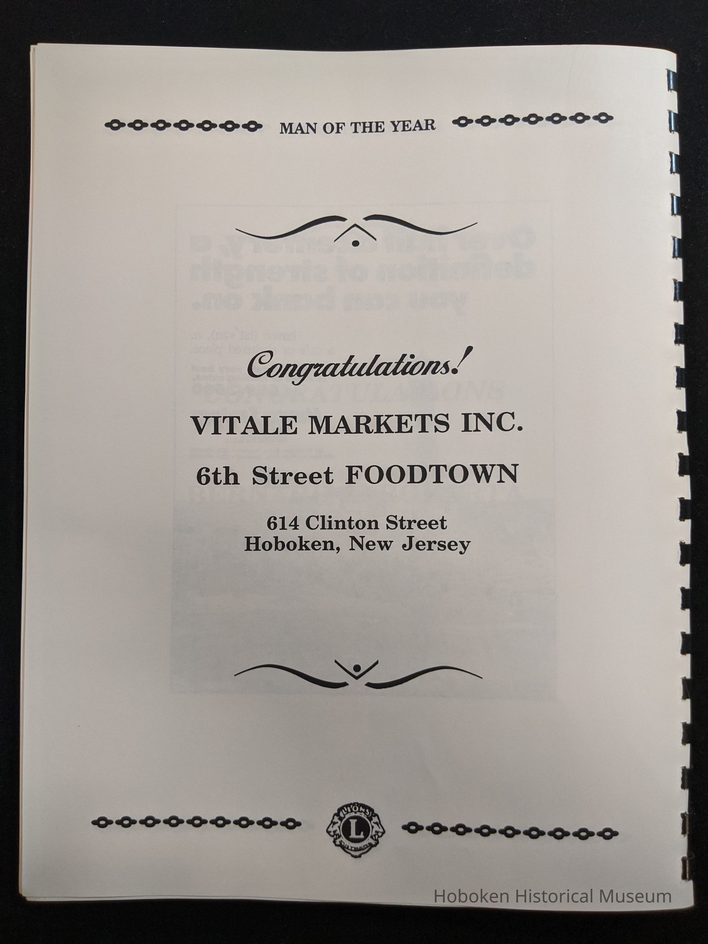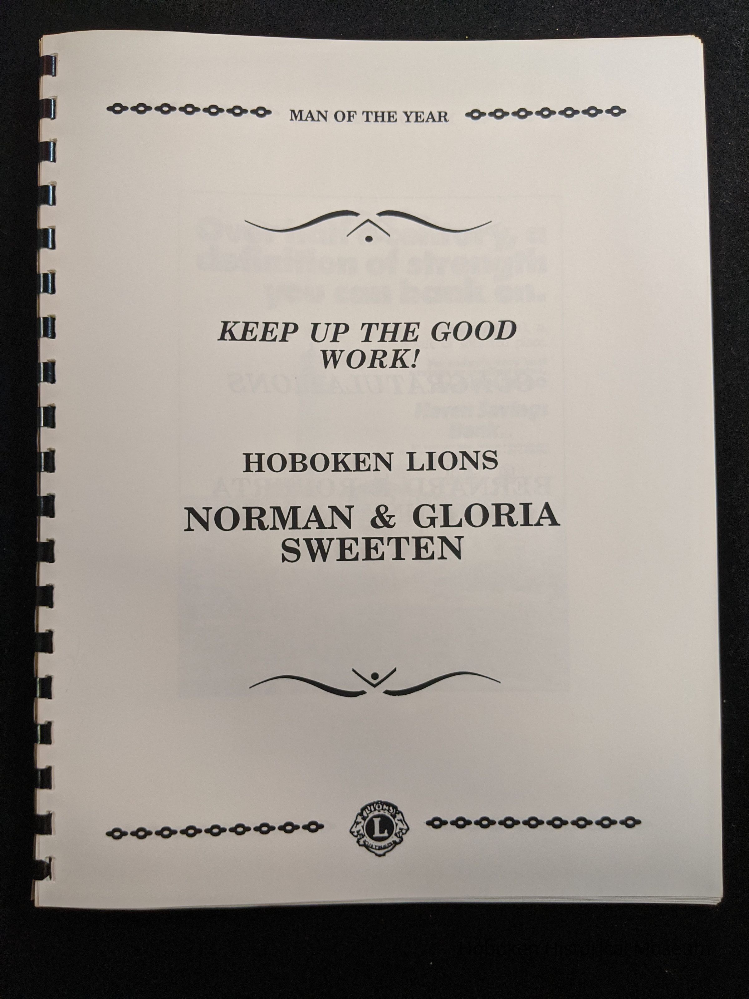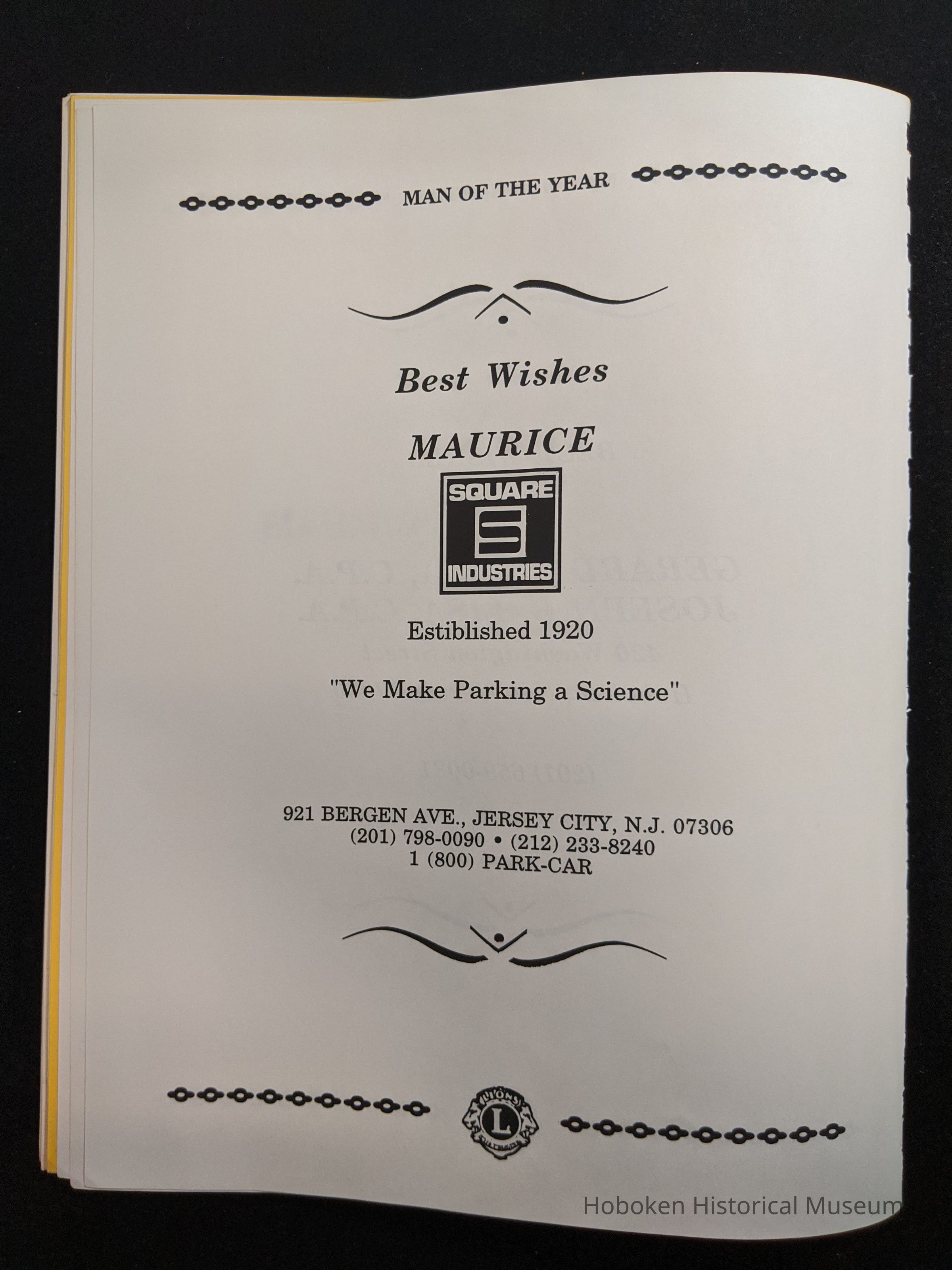 Bound program from the Hoboken Lions Club Charity Ball Dinner honoring Man of the Year Maurice Fitzgibbons. Saturday, February 12, 1992. Front and back cover on white card stock. Interior 18 sheets/36 pages, all white except one is goldenrod.