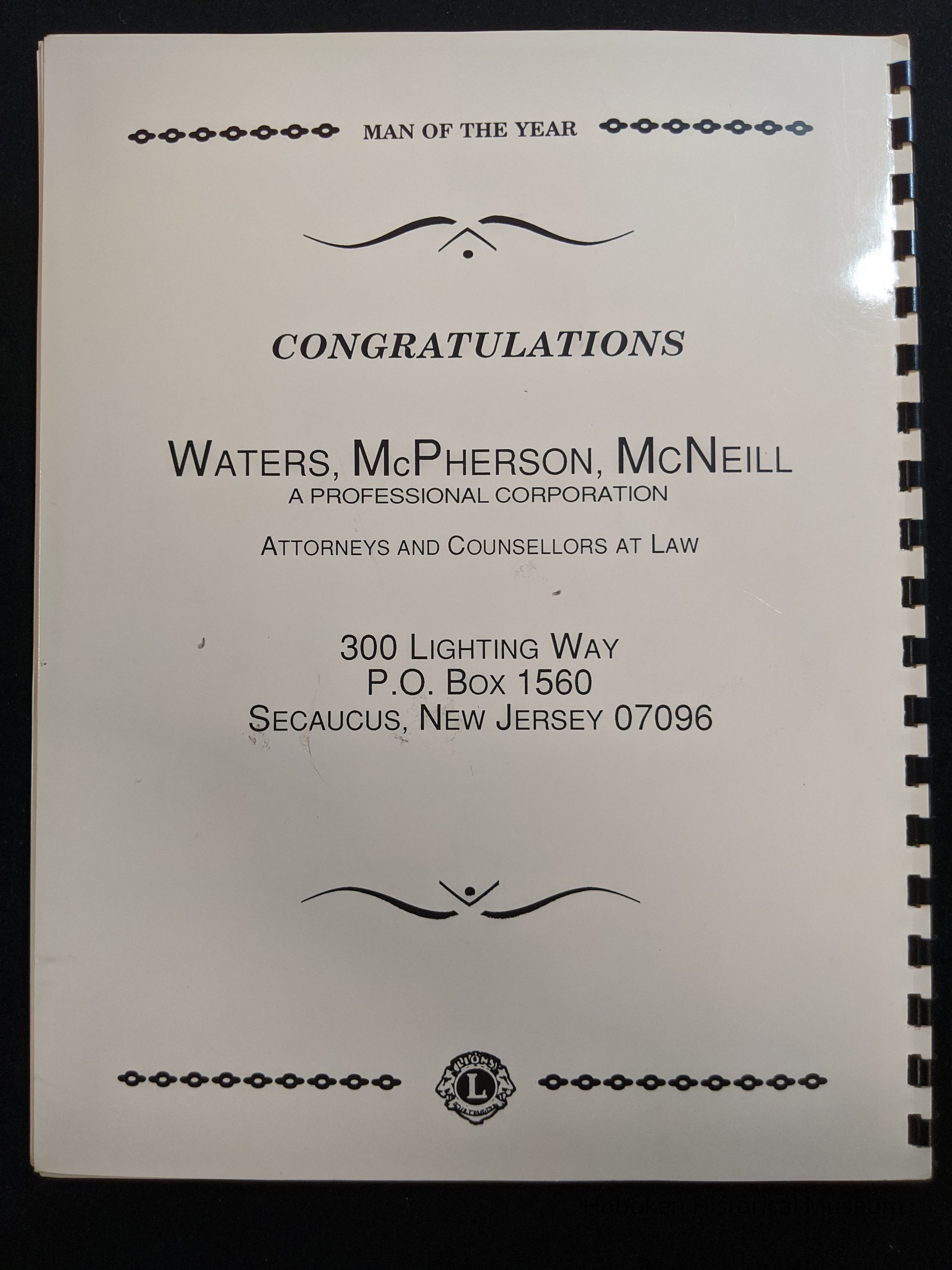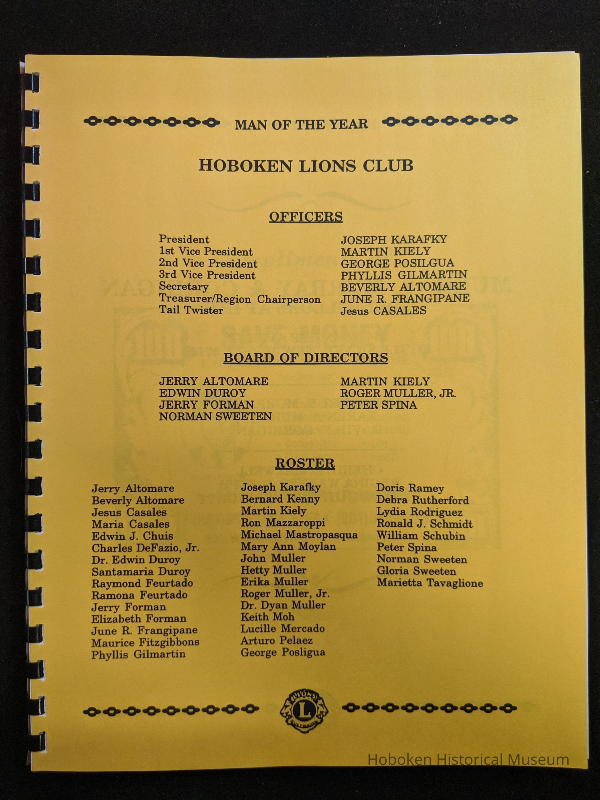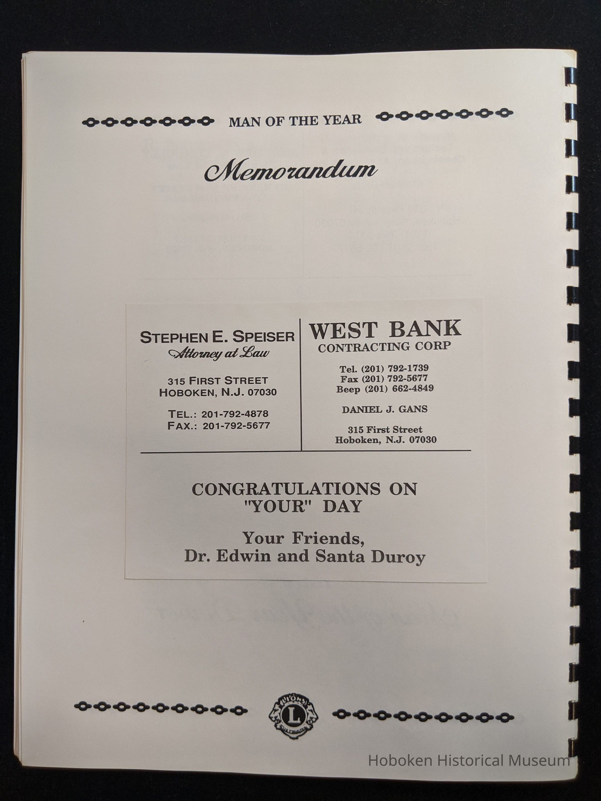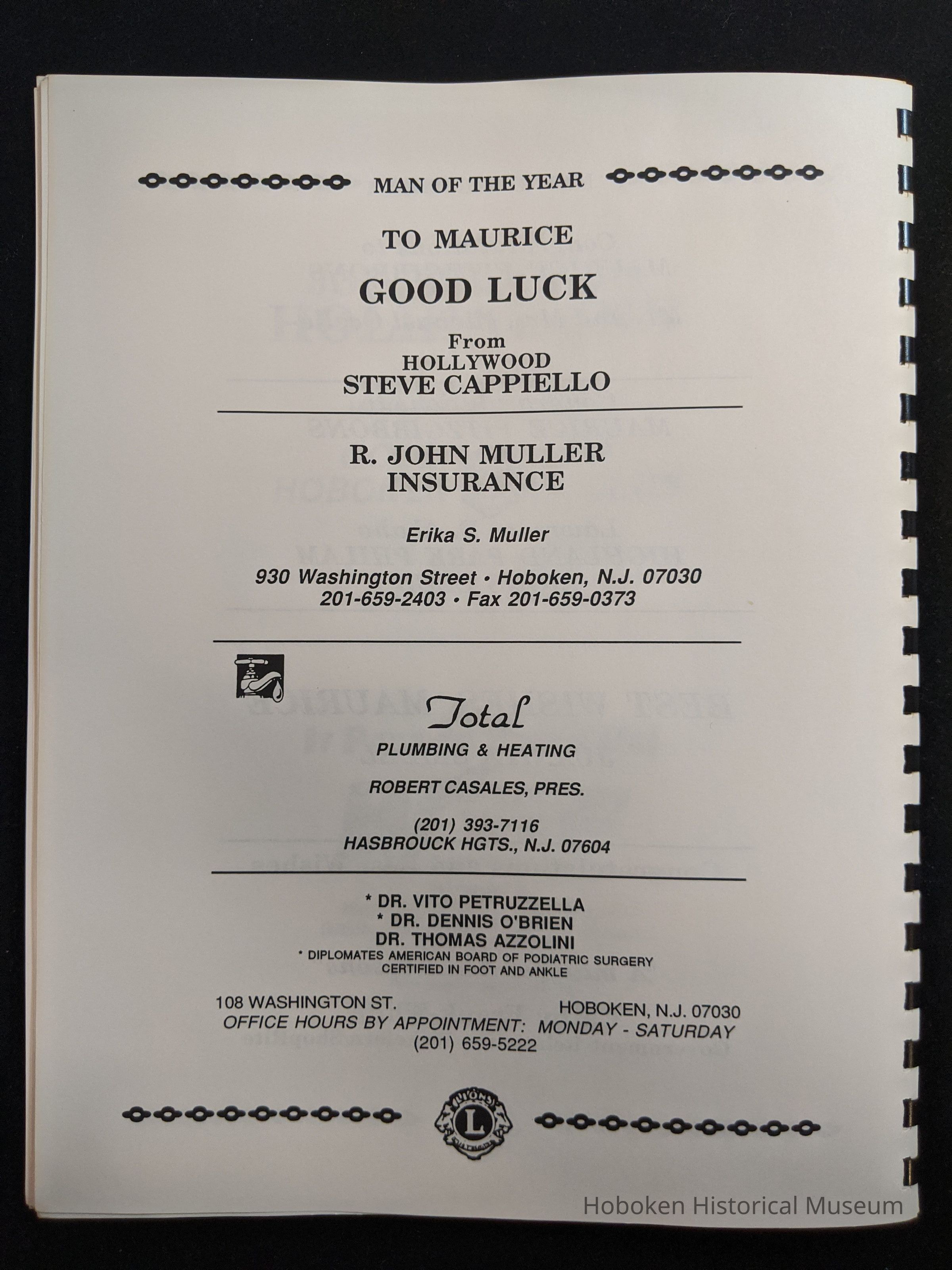 Bound program from the Hoboken Lions Club Charity Ball Dinner honoring Man of the Year Maurice Fitzgibbons. Saturday, February 12, 1992. Front and back cover on white card stock. Interior 18 sheets/36 pages, all white except one is goldenrod.