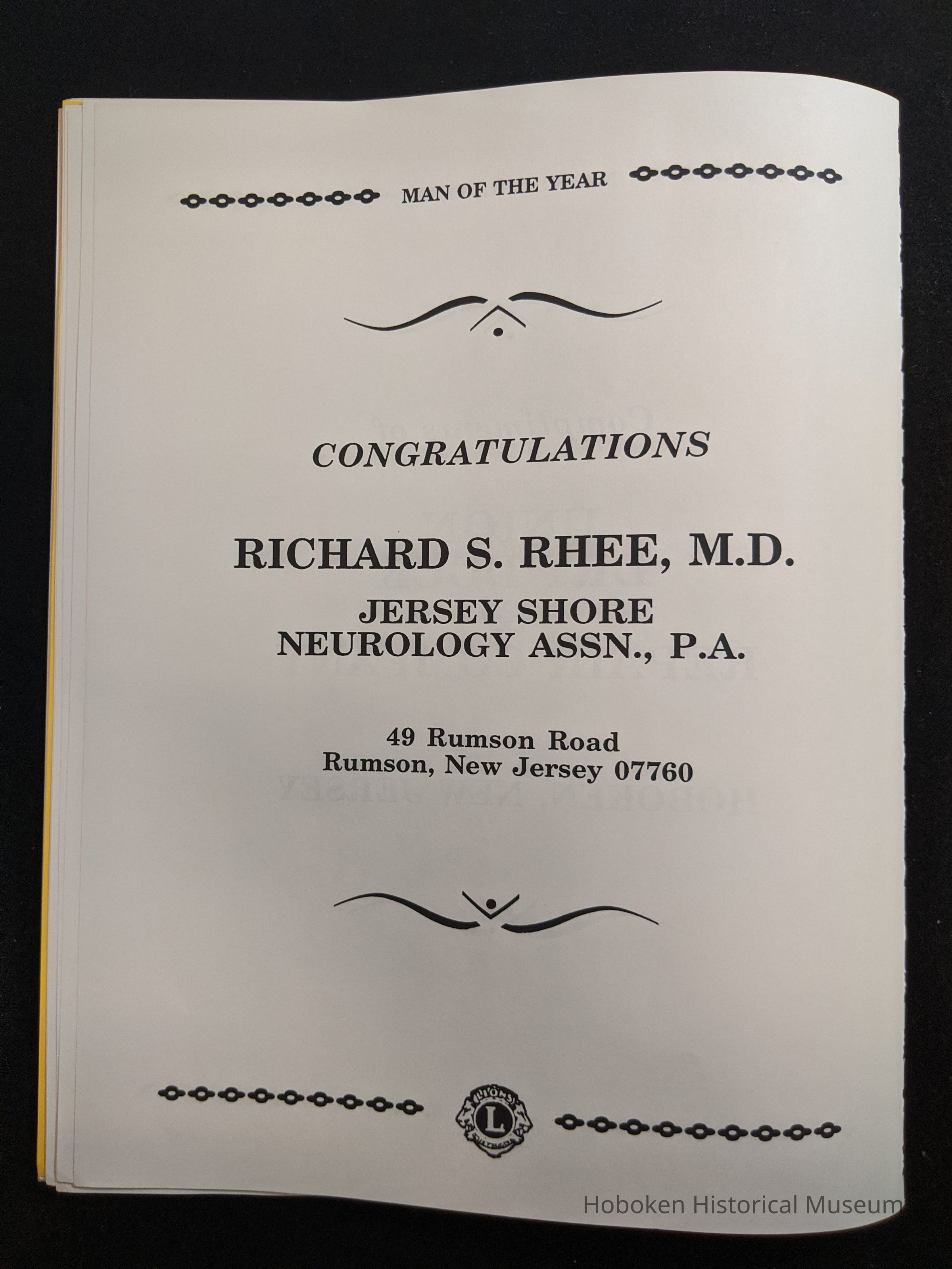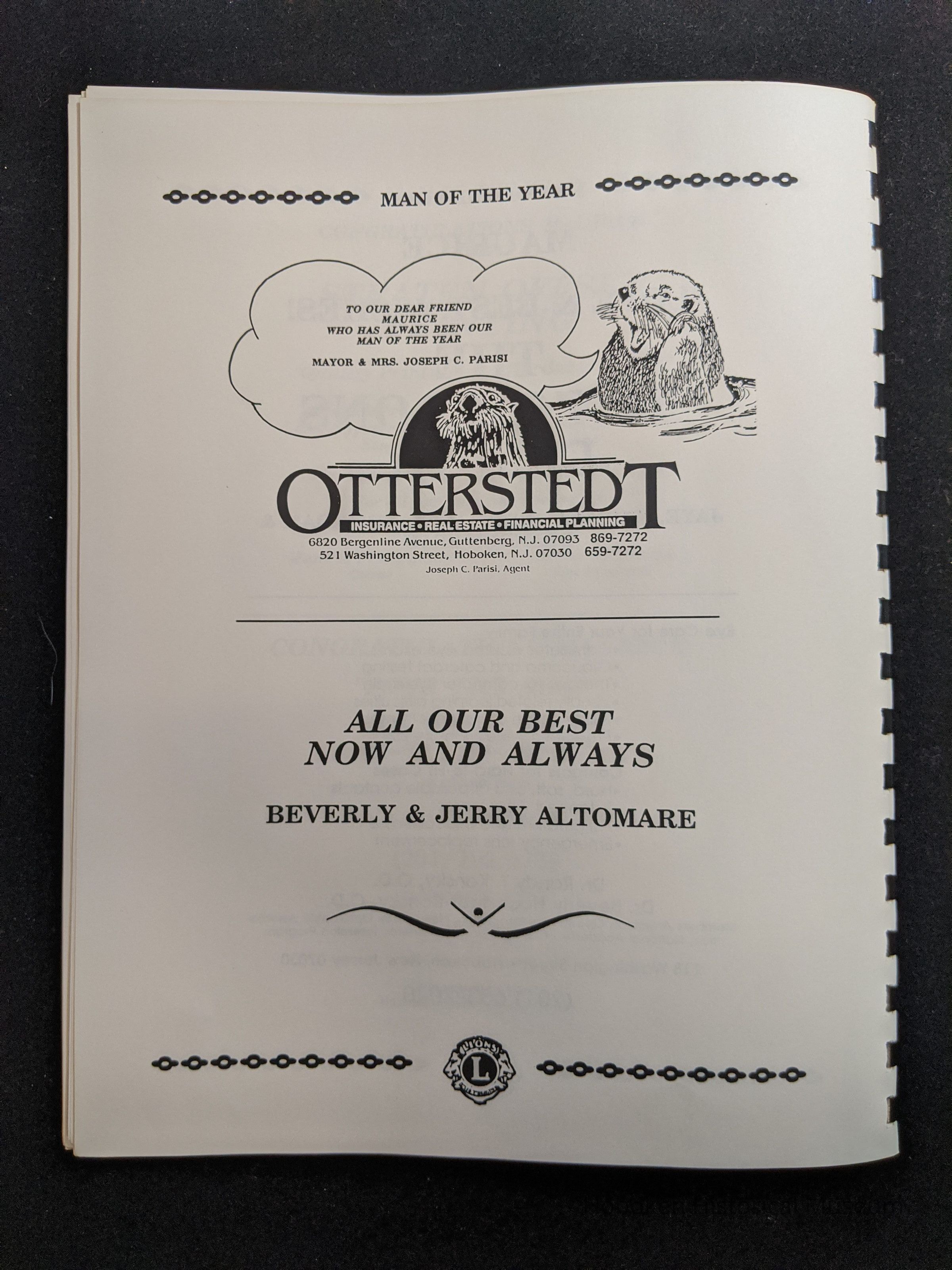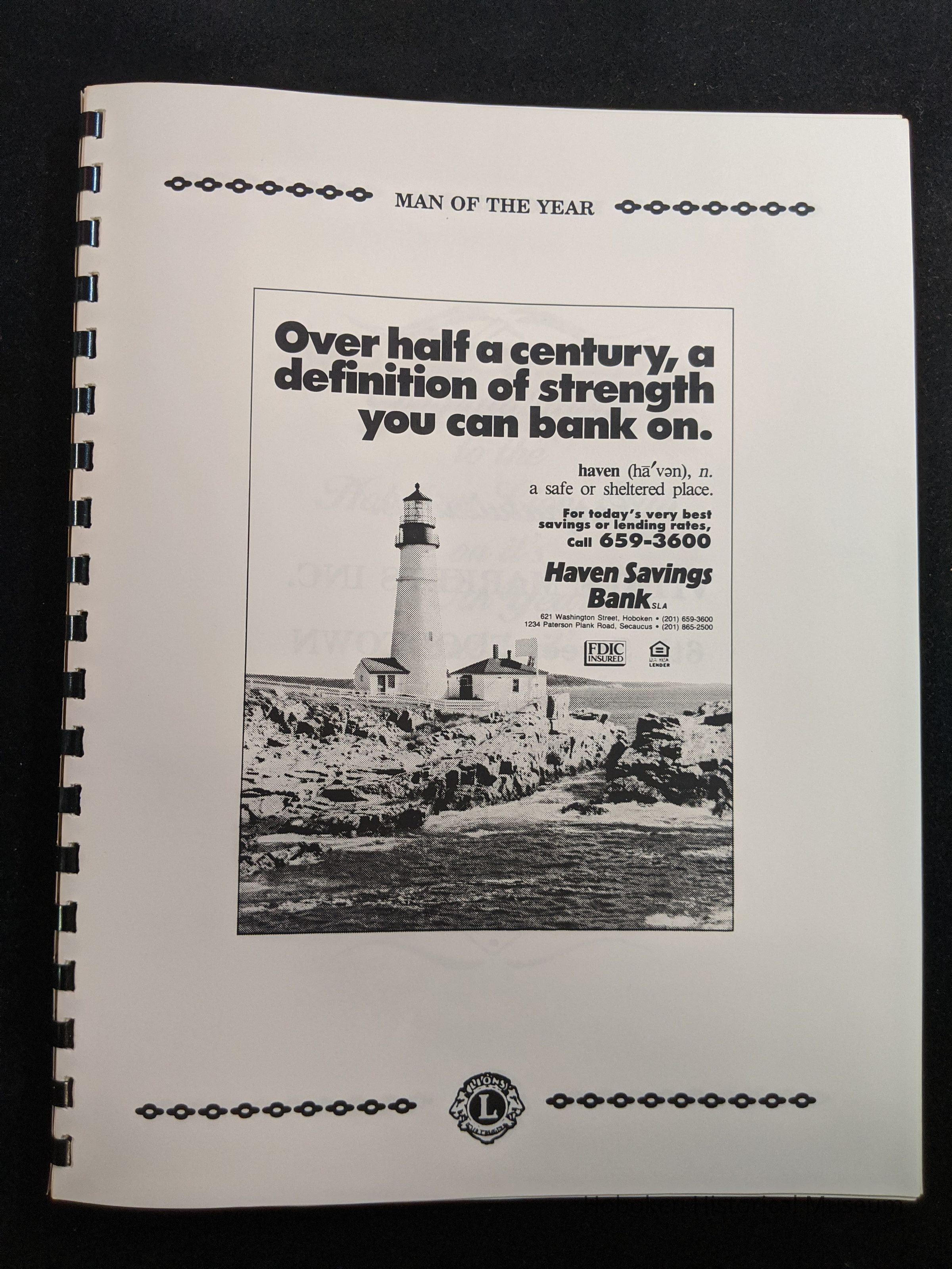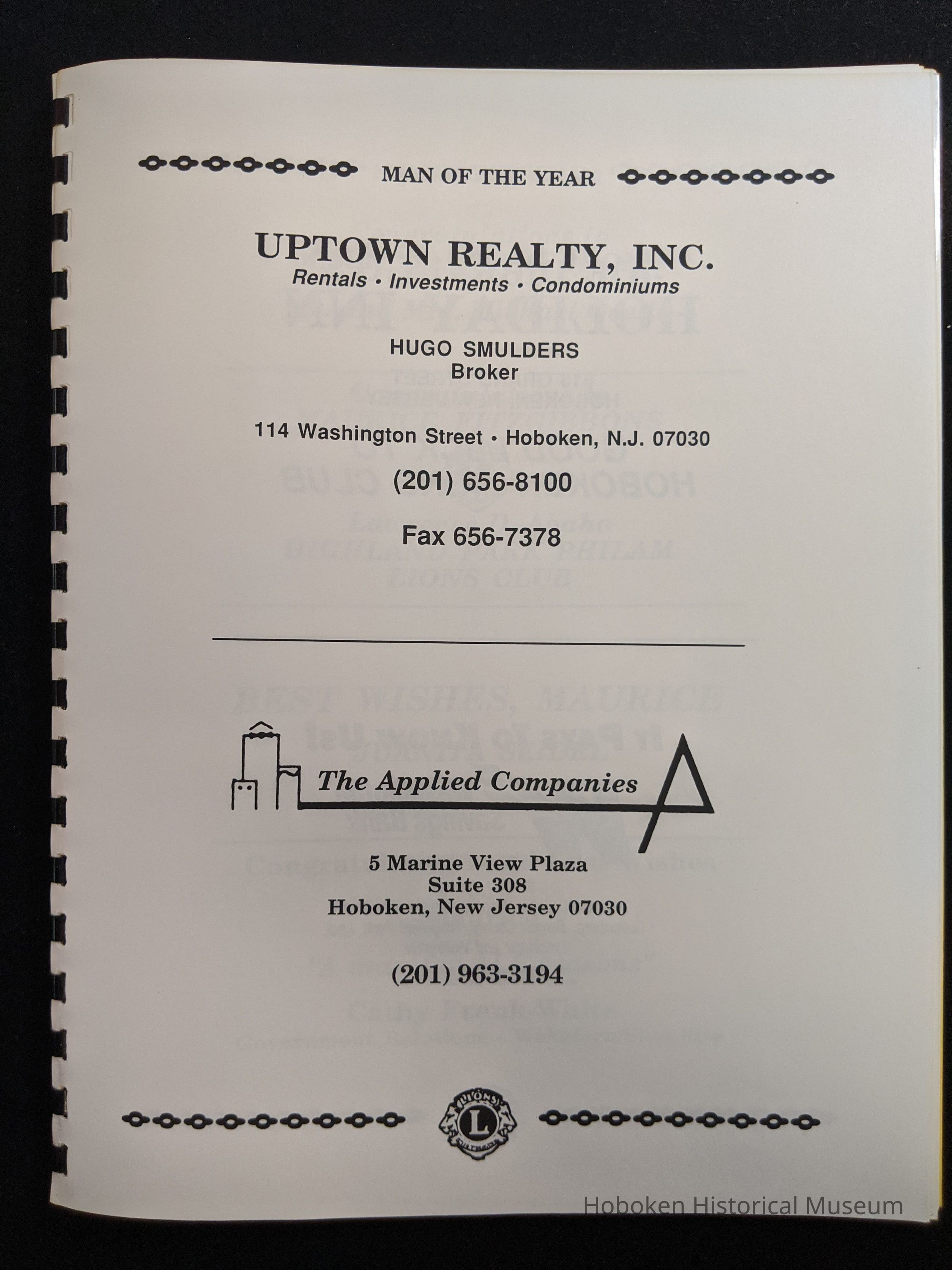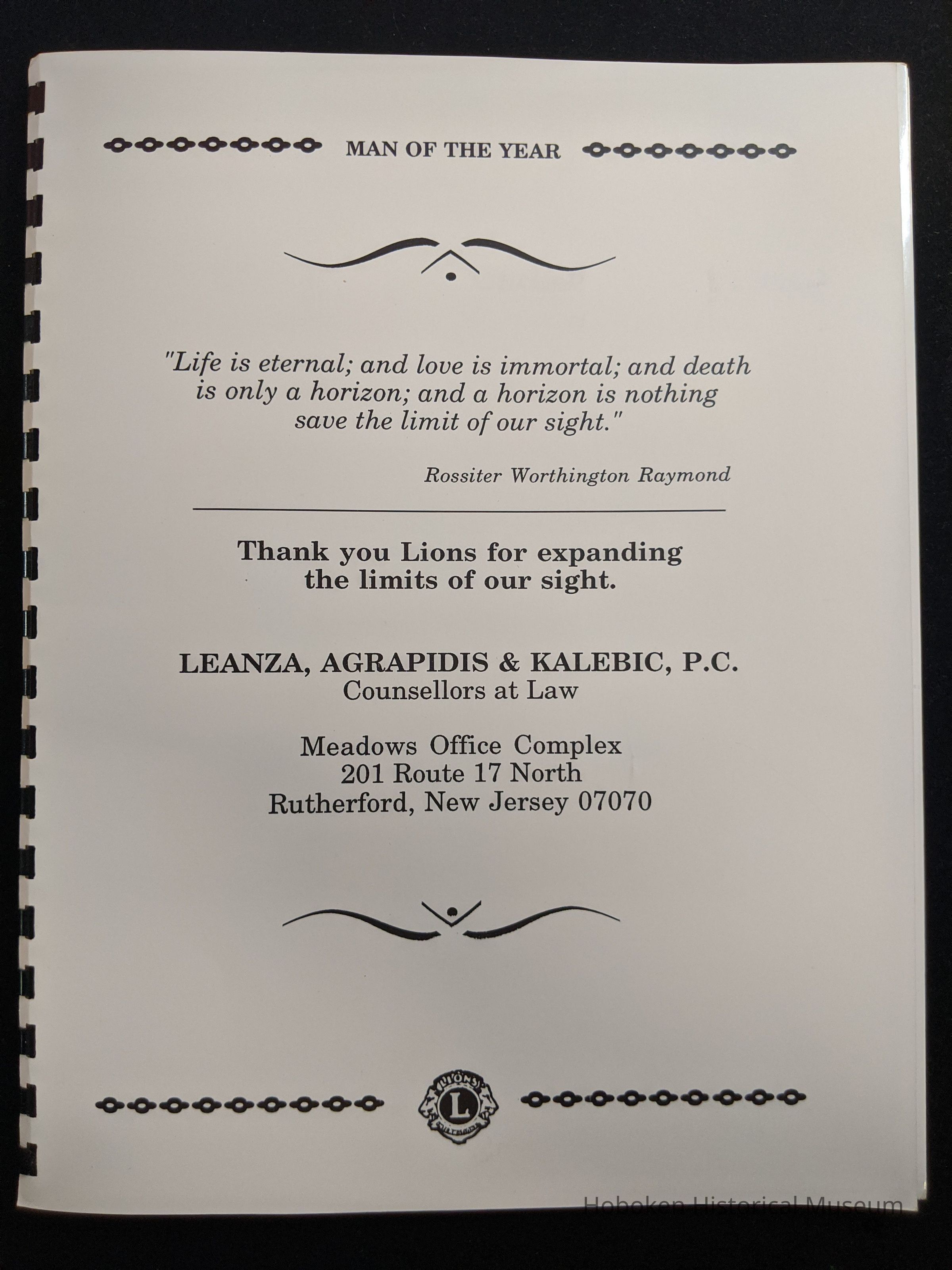 Bound program from the Hoboken Lions Club Charity Ball Dinner honoring Man of the Year Maurice Fitzgibbons. Saturday, February 12, 1992. Front and back cover on white card stock. Interior 18 sheets/36 pages, all white except one is goldenrod.