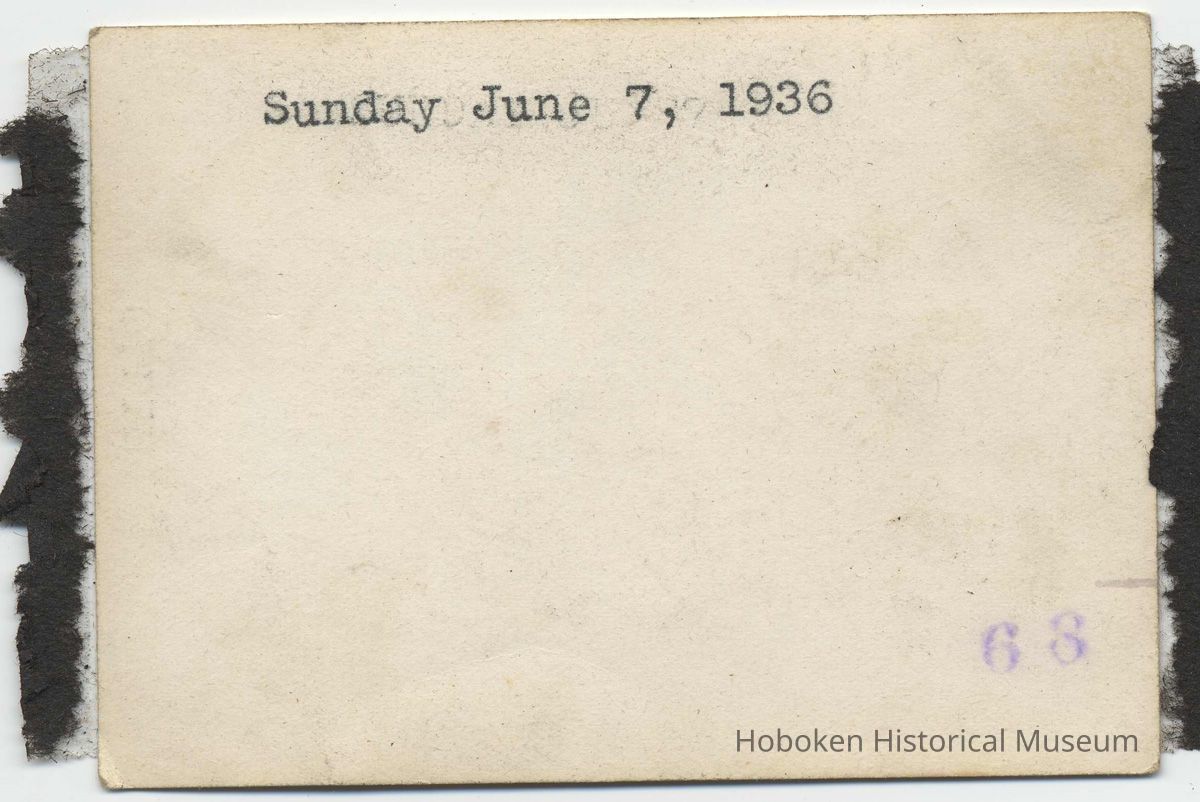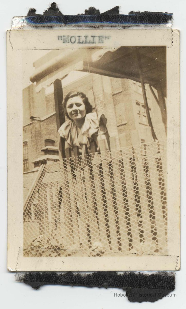 Black-and-white photo of Mildred Marion "Molly" Pescatore on the covered roof-top deck at 325 Madison St., Hoboken, Sunday, June 7, 1936. 2-1/2" x 3-1/2" high. Typewritten caption on front top border, "Mollie," and date typewritten on the reverse with the photo processor's ink stamped number.