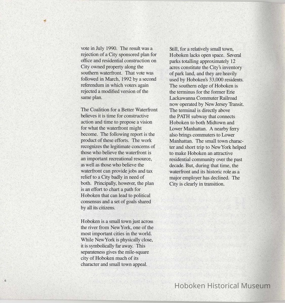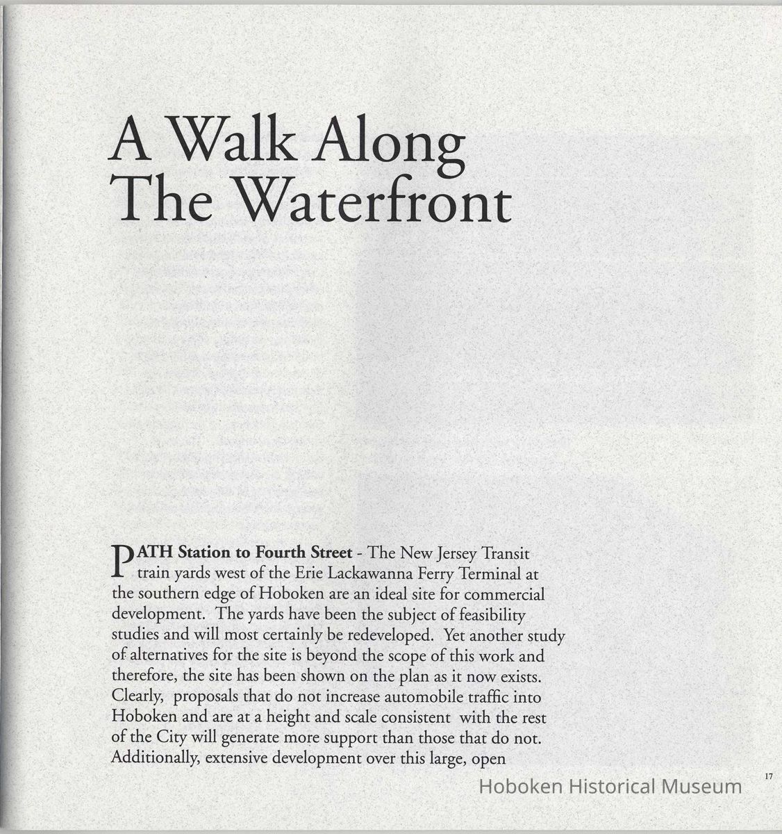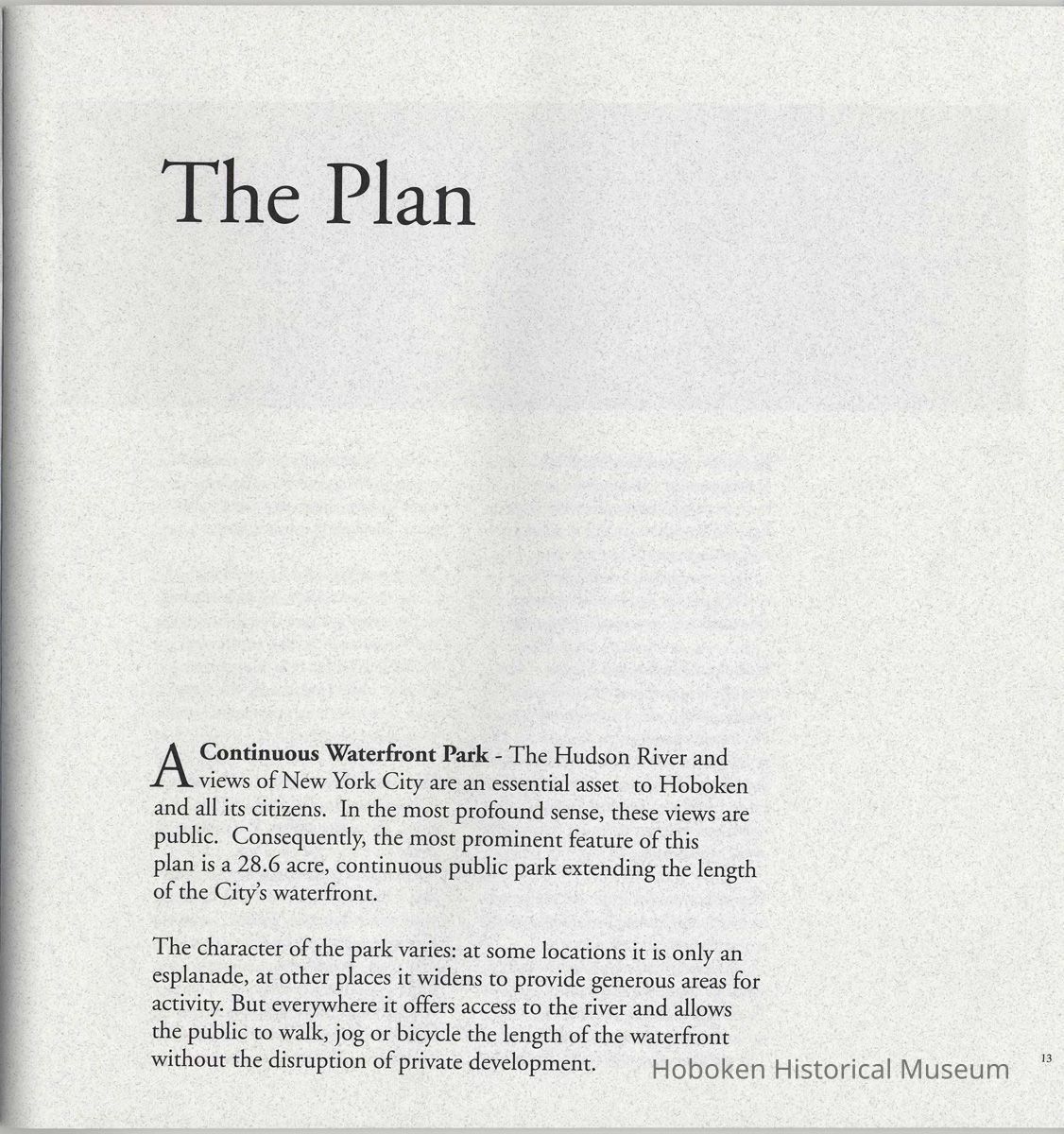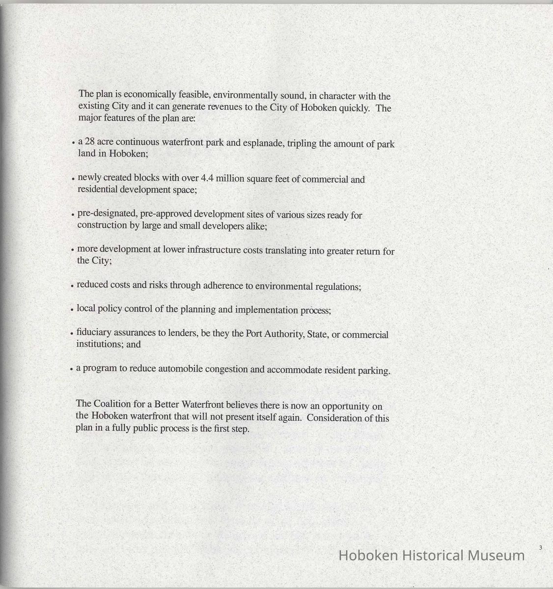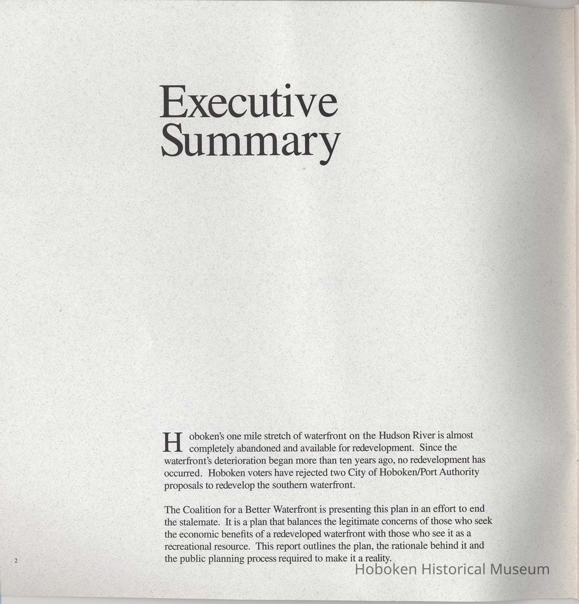Booklet: A Plan for the Hoboken Waterfront. Coalition for a Better Waterfront. Hoboken, no date, [1993]. 9-1/2" high x 9-1/4" wide. 56 pp., illustrated with photos, maps, drawings. 2 copies