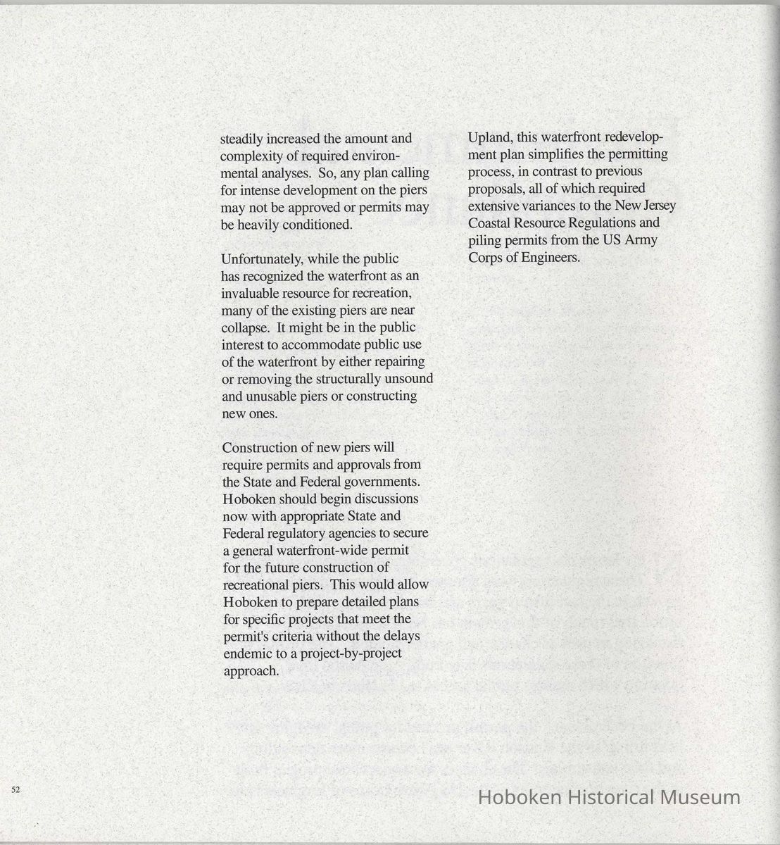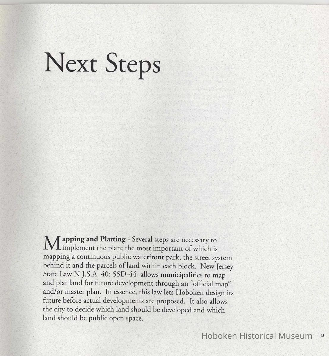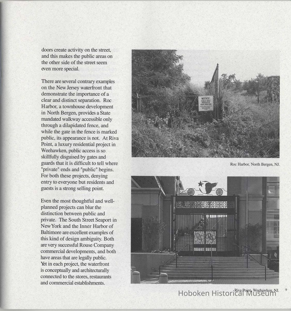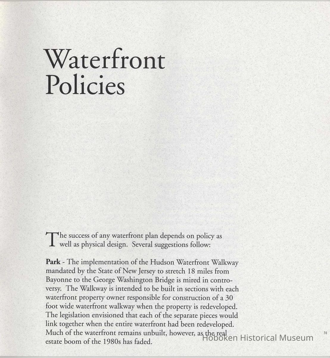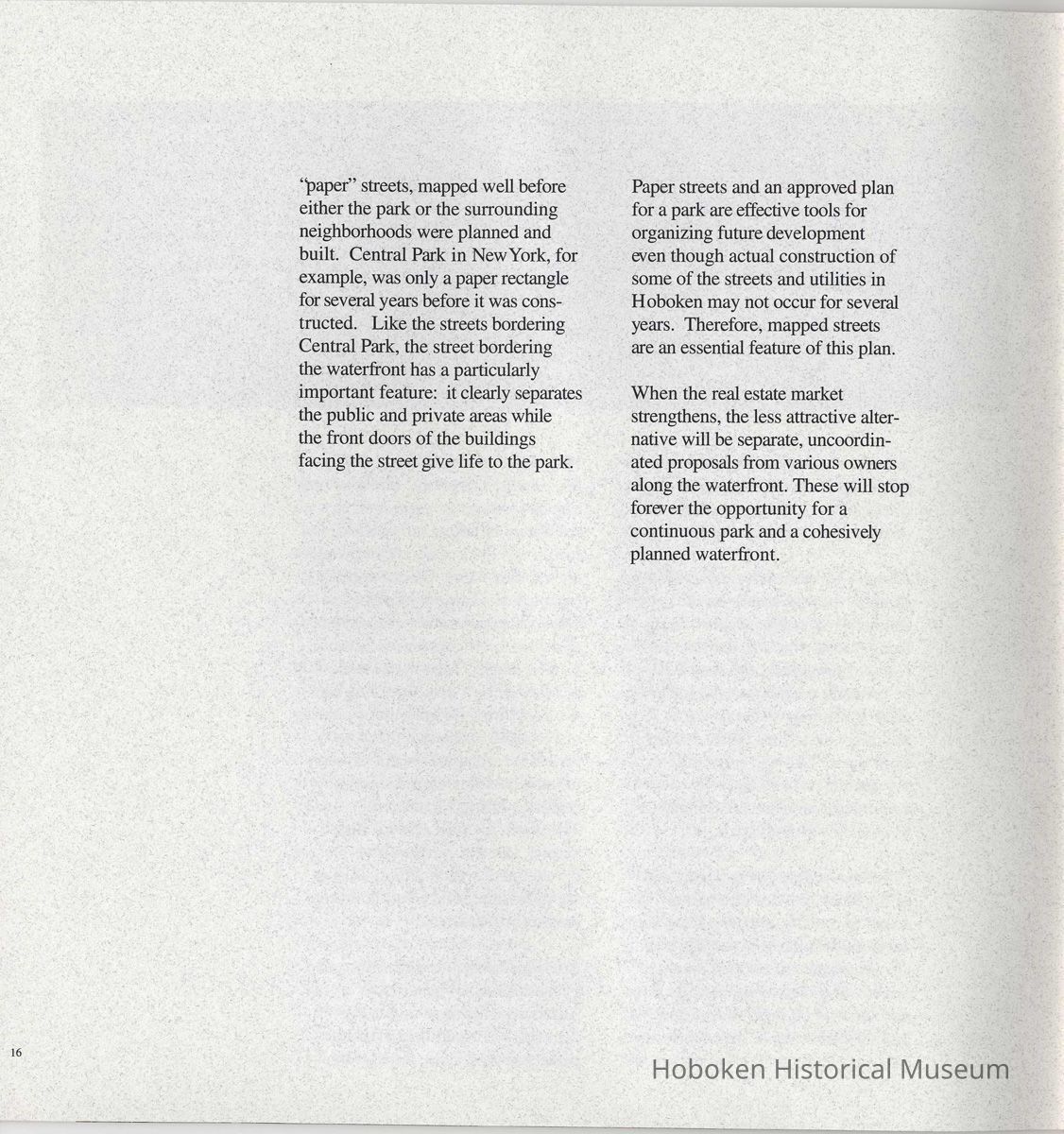 Booklet: A Plan for the Hoboken Waterfront. Coalition for a Better Waterfront. Hoboken, no date, [1993]. 9-1/2" high x 9-1/4" wide. 56 pp., illustrated with photos, maps, drawings. 2 copies