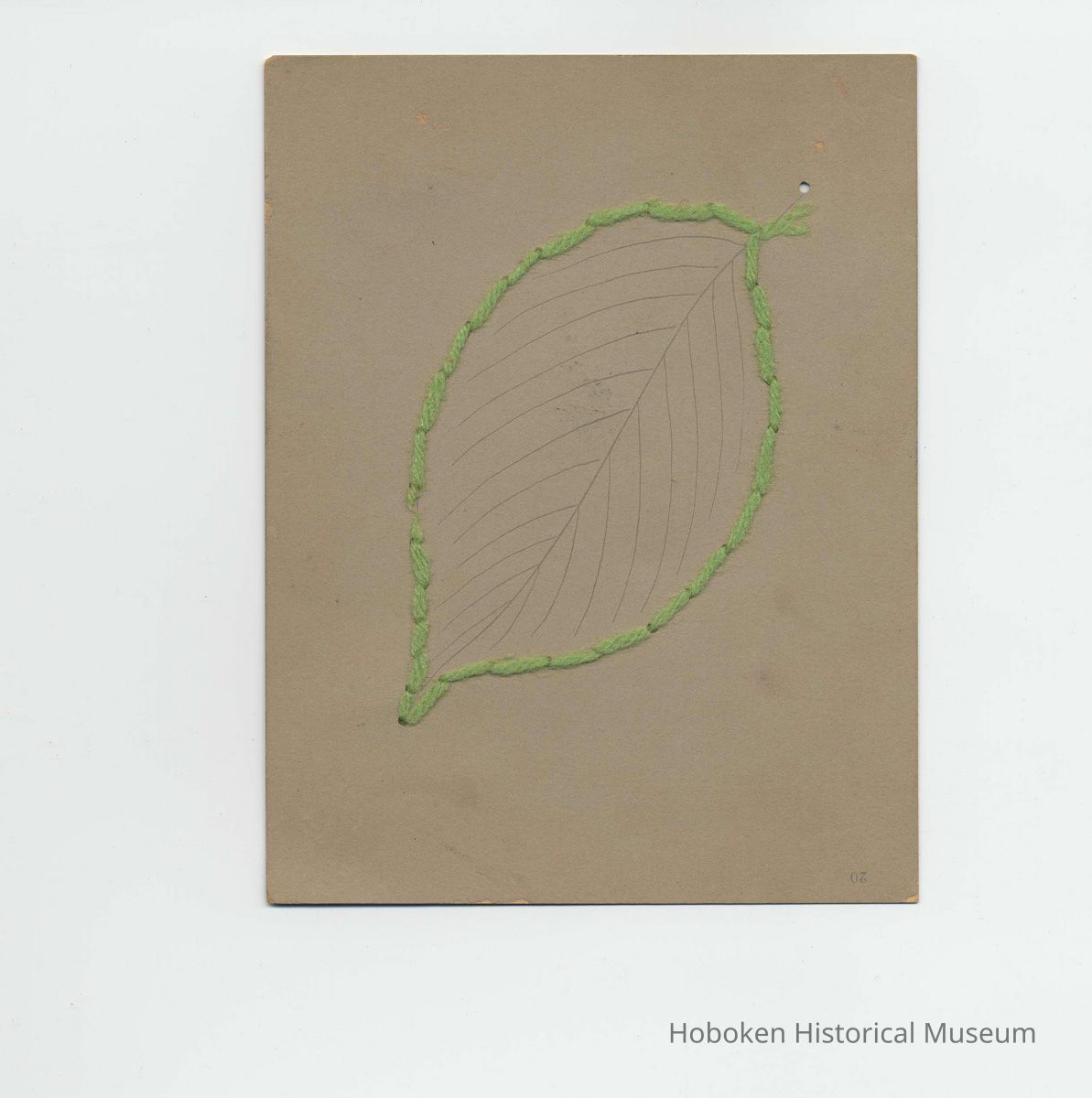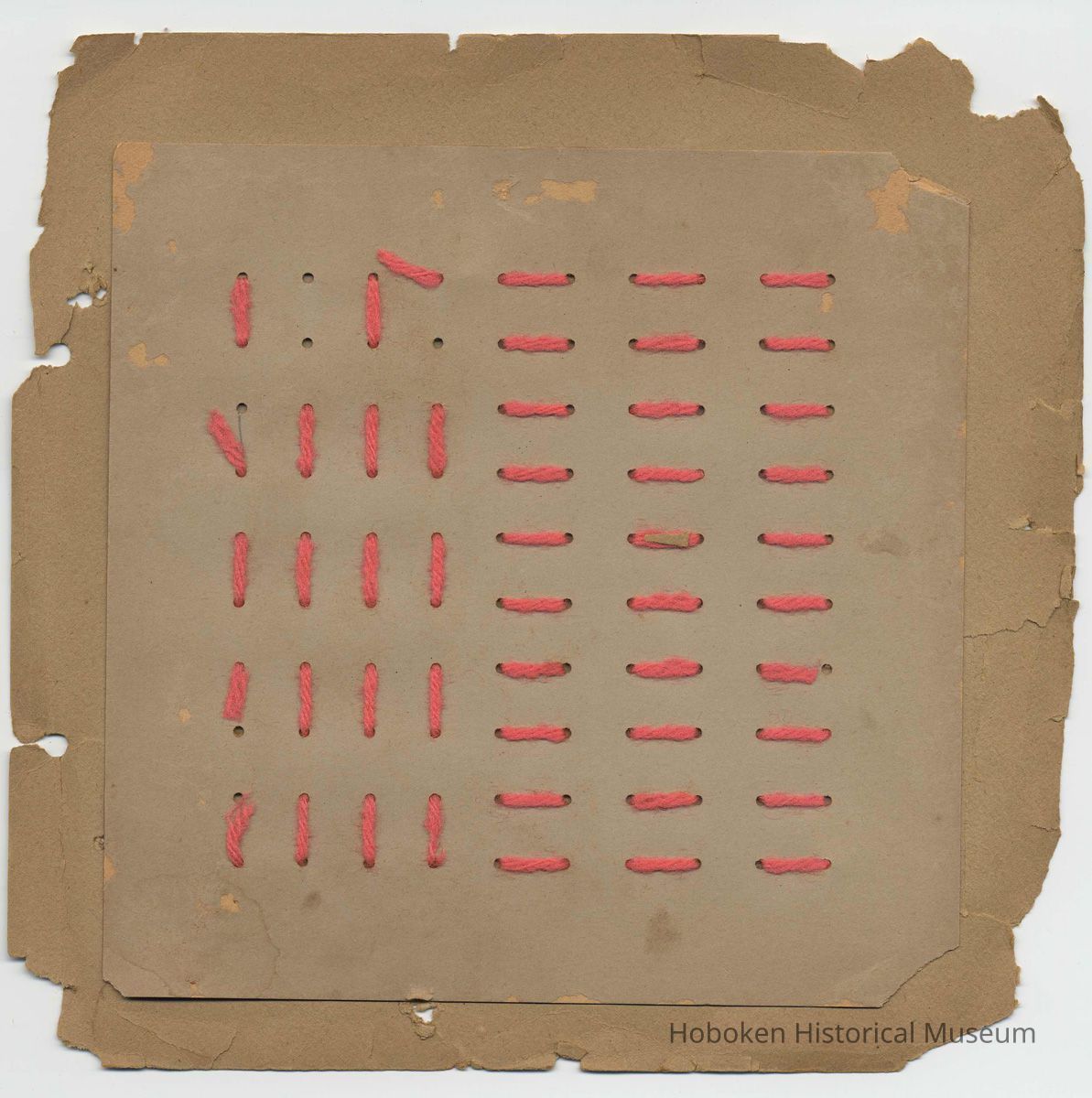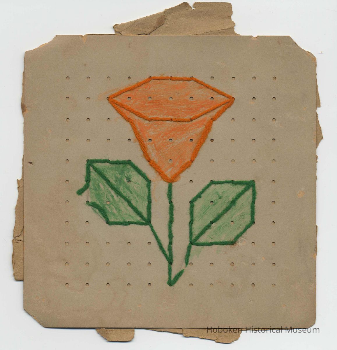 Twelve leaves (plus front cover), 8-1/4" high x 8" wide, with mounted examples of school work. Unbound: evidence of a former two-hole stab binding at the left margin, probably with string or yarn.