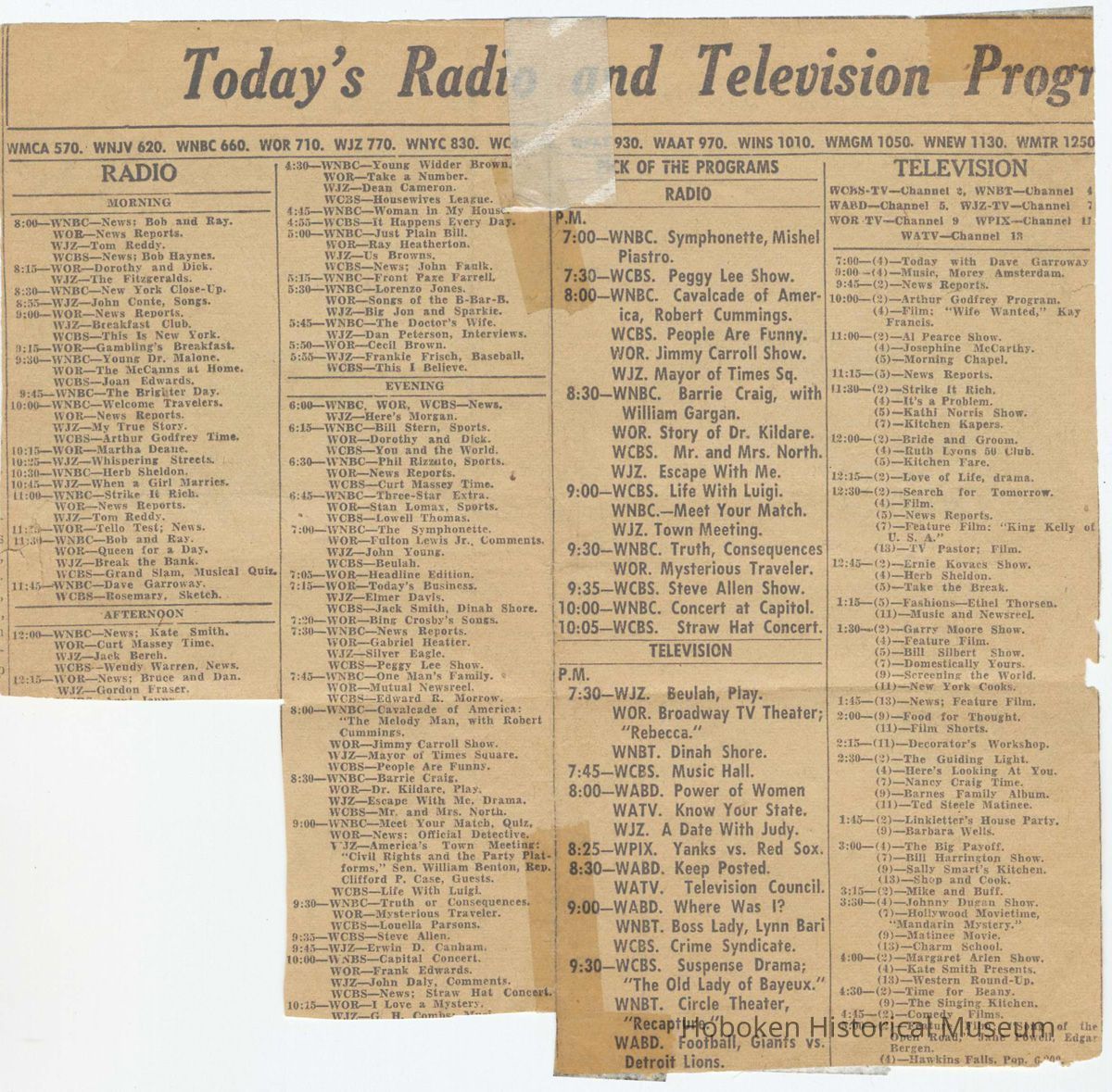 Digital image of printed b+w photo of G.I. Joes' Fife, Bell, Drum & Bugle Corps posed in uniforms, Hoboken, no date, ca. 1955. Photo from newsclipping from an unidentified newspaper, date suggested by TV listings on the reverse. Includes a related article below the captioned photo.