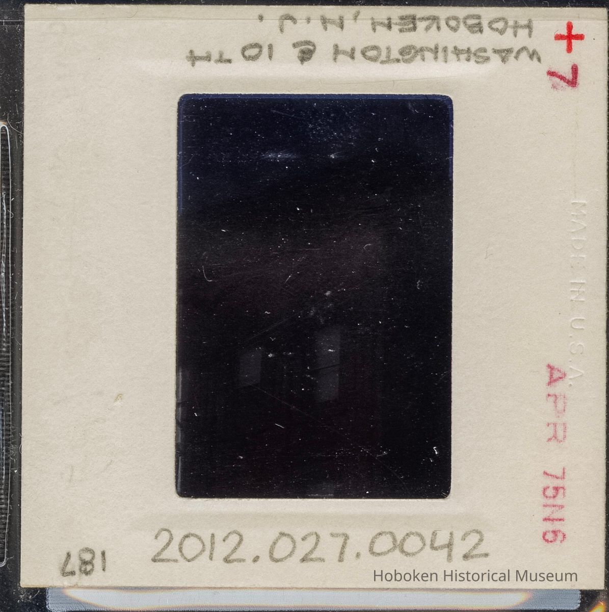 Color slide of detail view of cornice, brick pilasters, and arched windows at 938 Washington at the intersection of Washington & 10th