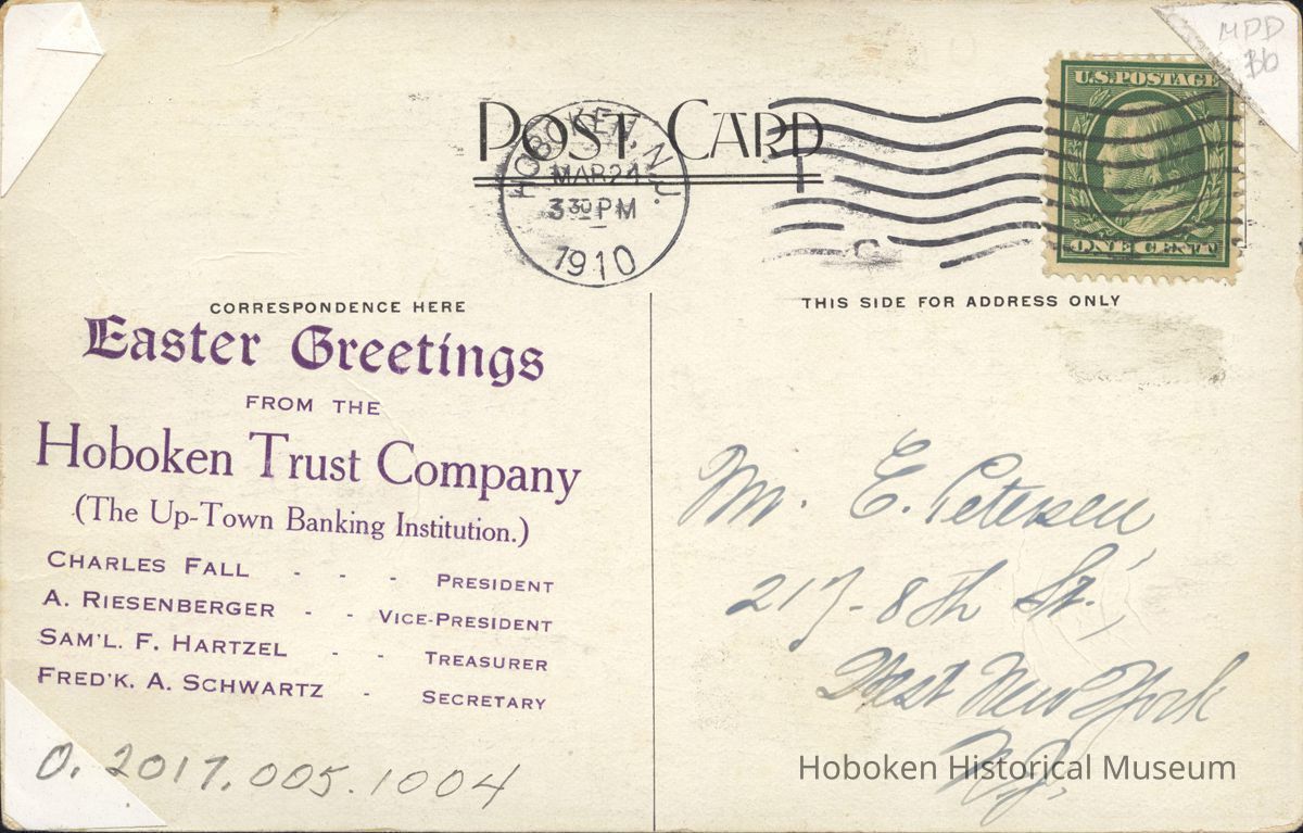 Correspondence Here Easter Greetings from the Hoboken Trust Company (The Up-Town Banking Institution.) Charles Fall ... President A. Riesenberger .. Vice President Sam'l. F. Hartzel .. Treasurer Fred'k. A. Schwartz . Secretary