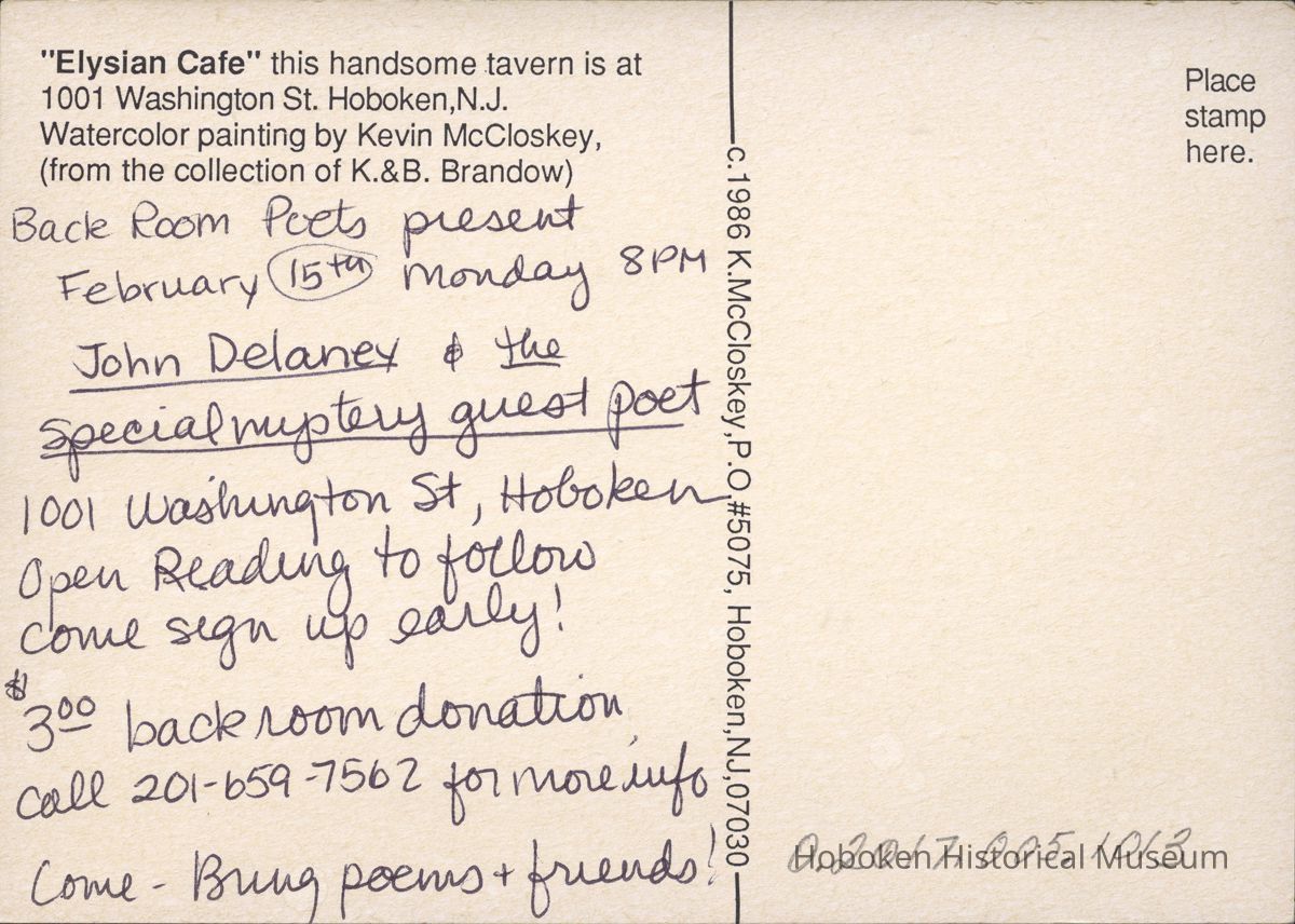 Color Postcard: Elysian Cafe, Hoboken, NJ, 1986