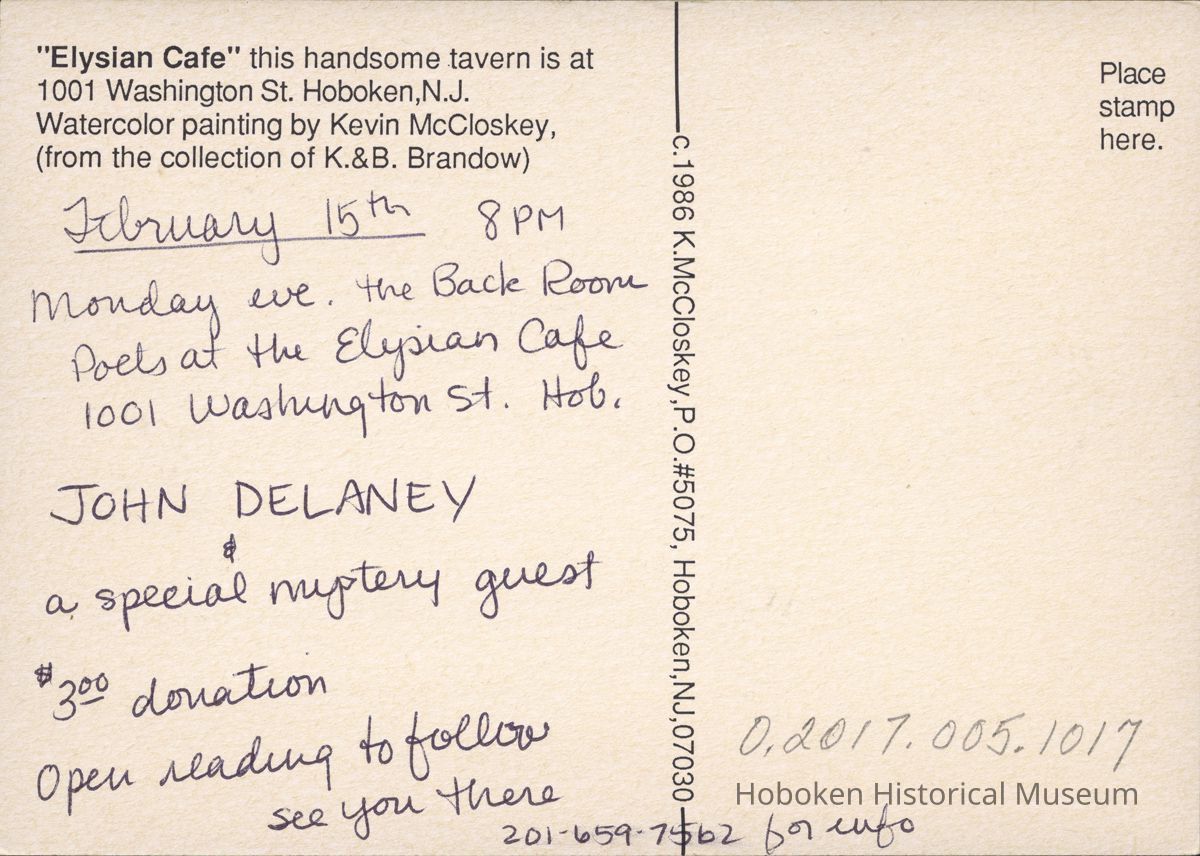 February 15th 8PM Monday eve. The Back Room Poets at the Elysian Cafe 1001 Washington St. Hob. John Delaney & a special mystery guest $3.00 donation Open reading to follow see you there 201-659-7562 for info