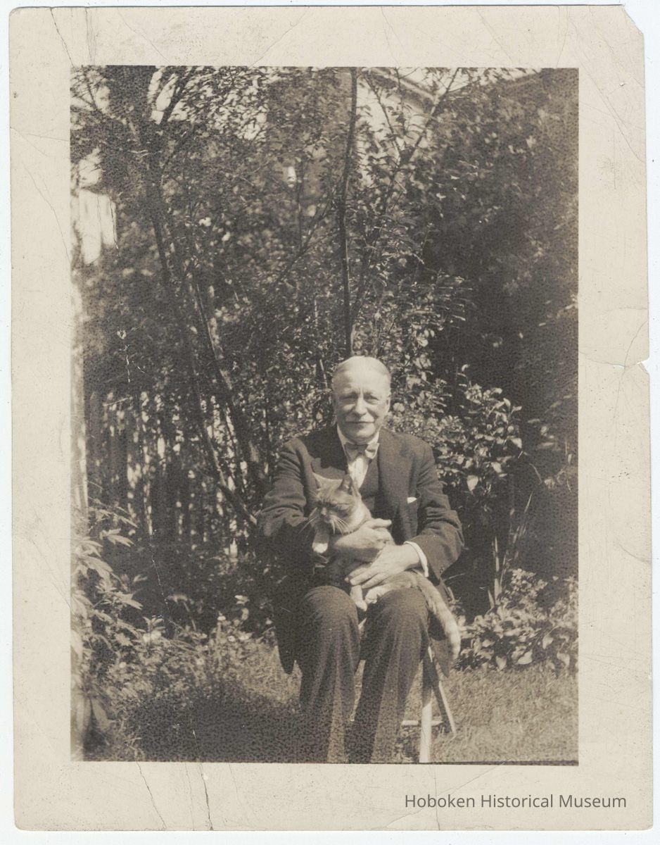 Black-and-white photo of Richard Neumann of R. Neumann & Co. seated in a yard holding a cat, Hoboken?, no date, ca. 1920's. Print 4-1/4" wide x 5-1/2" high. Photographer not indicated. Reverse is blank except for stamped processer's number.