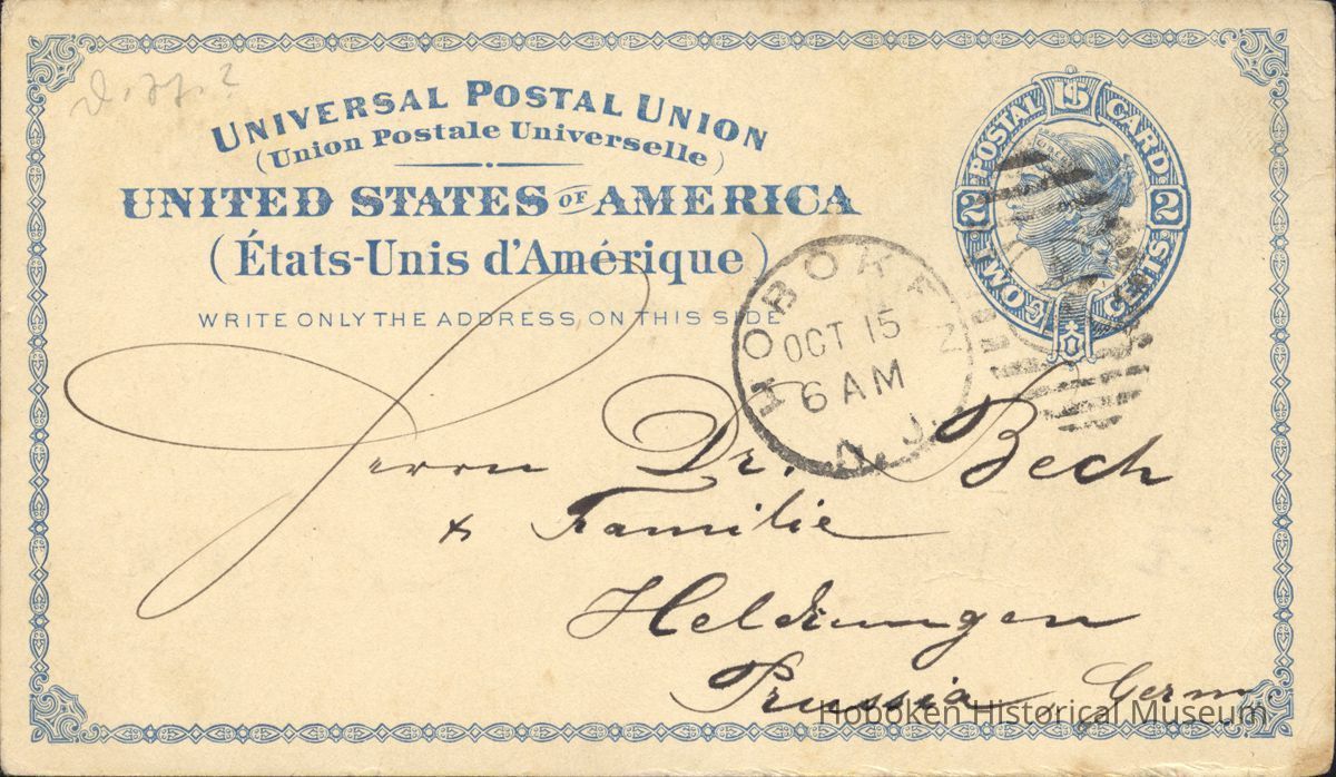 Hoboken, 14.10.88. glucklich angeton mean, send Allen dr die herzlichsten Gouse. dieser karte Ein brief ist im Gefolge dieser Die Weiterreise erfolgt in 2.3 ingen. Ichwachen sehr sutsch hier; bitte teilt Heren Borner Fallede, der mich sier and meldete Ankunft mit dresu. meine Ankunft Tausend Goustchure Wiel.