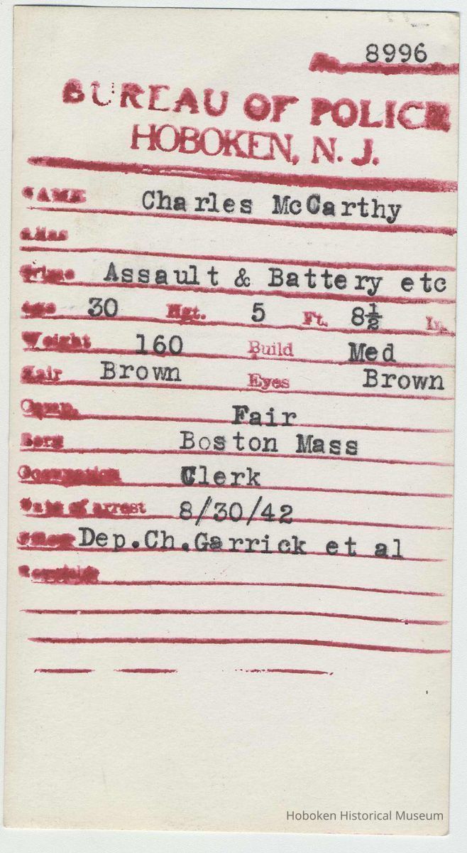 Data side: ink stamped form, Bureau of Police, Hoboken, N.J. Typewritten entries.